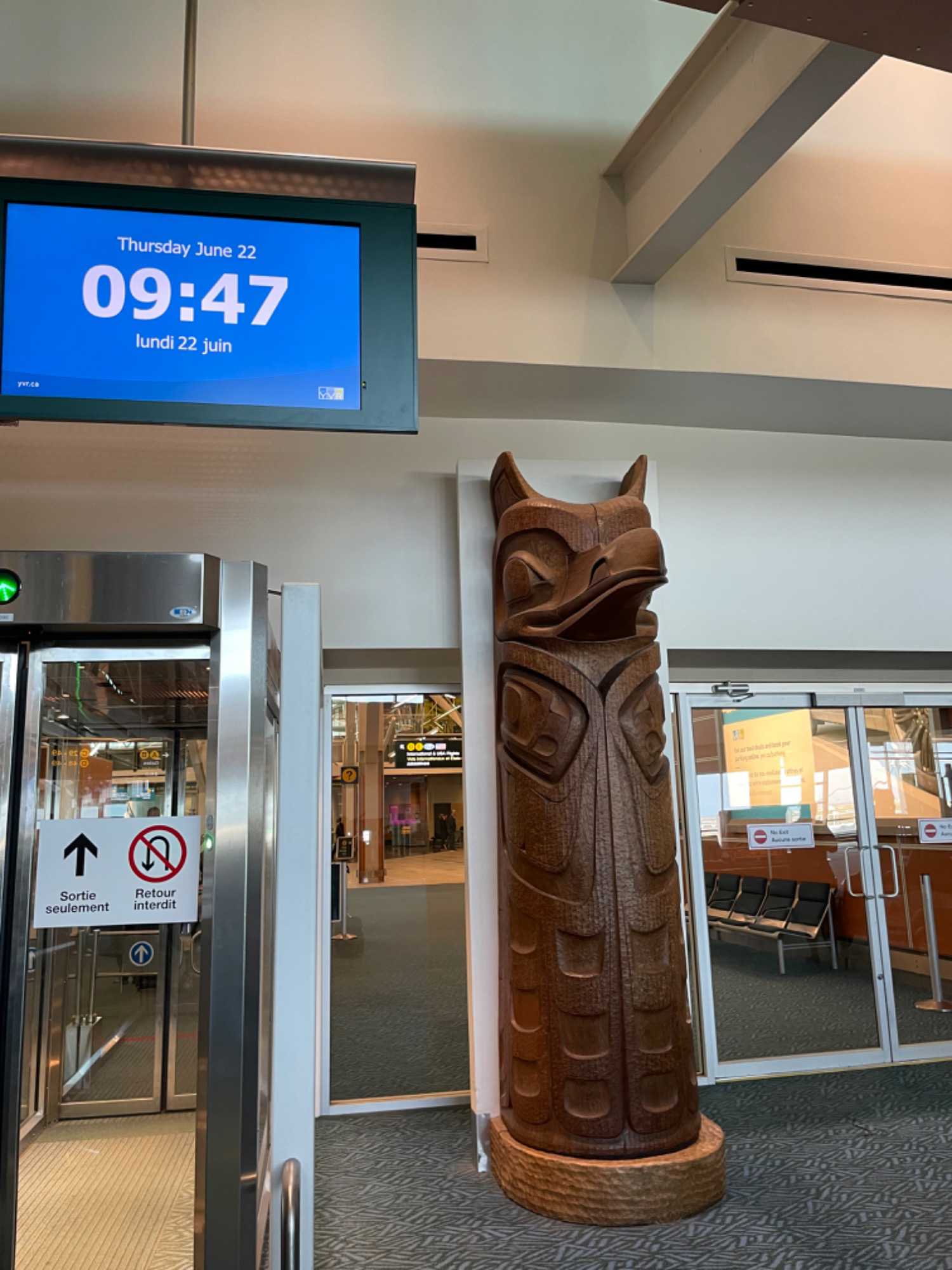 Après un réveil aux aurores pour nous tous, nous embarquons avec Air canada en direction de Vancouver.. Le vol est vraiment agréable, le temps est clair et on peut admirer les champs des prairies et les pics acérés et enneigés des rocheuses. Ou encore, comme plusieurs, rattraper un peu de sommeil. De plus, partis à l’heure de Montréal, on se pose en avance à Vancouver. La récupération des valises se passe bien et on retrouve notre chauffeur John, qui est très sympathique.