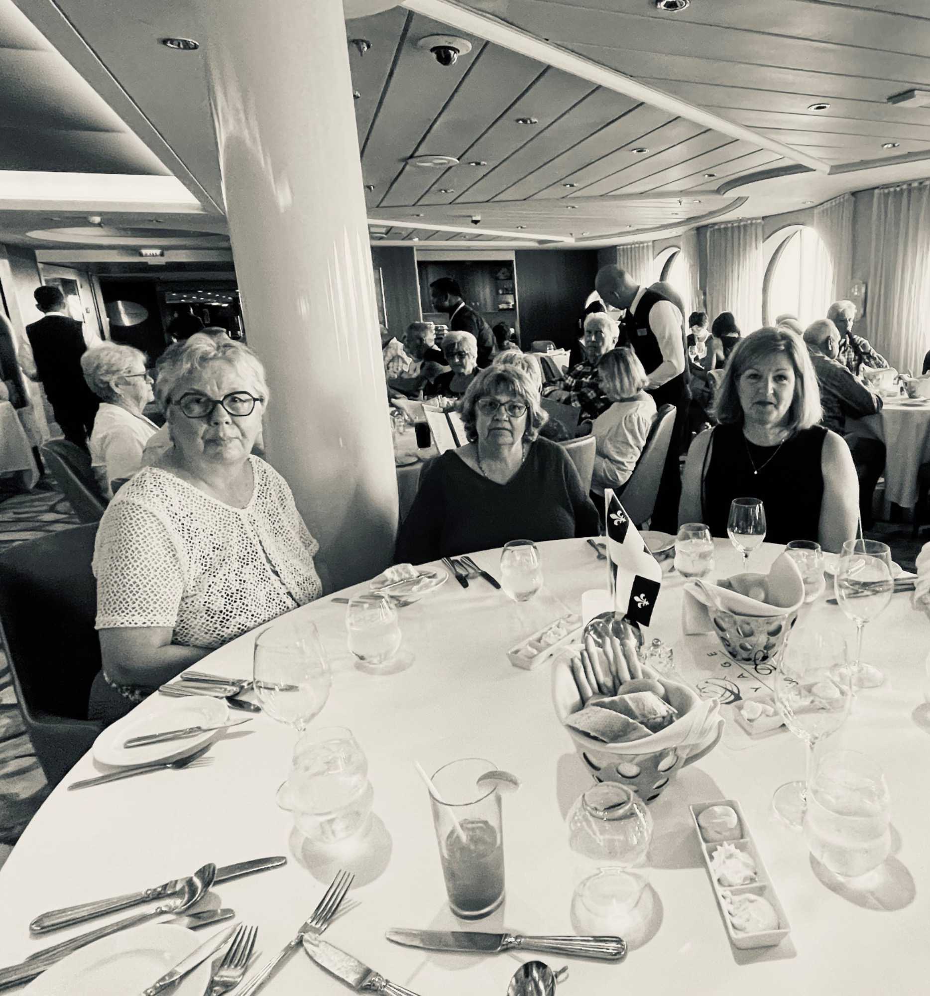 Ce midi nous échangeons lors du traditionnel dîner partage de voyage Louise Drouin. On en profite pour souligner l'anniversaire d’Yvan avec une chanson et une bougie sur son gâteau et un petit souvenir de sa croisière en cadeau.