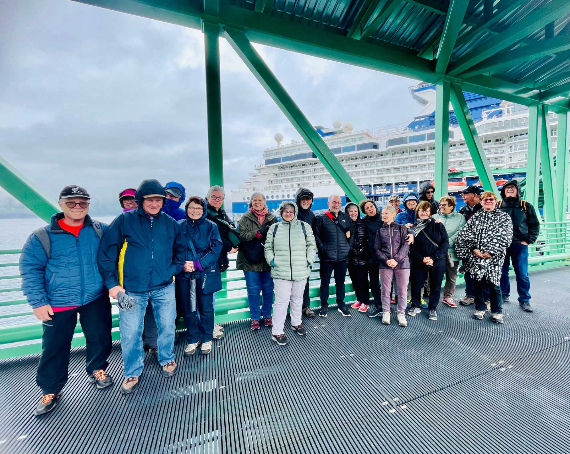 Nous avons accosté tôt ce matin à 06h30. Ici la mer est très calme et les arbres vraiment grands et majestueux. C’est que la région est plutôt pluvieuse et ce matin c’est d’ailleurs une pluie légère qui nous accueille. Mais, comme disent les Norvégiens: ”il n’y a pas de mauvais temps, seulement un mauvais choix de vêtements”. Tous les voyageurs sont bien habillés, c’est pourquoi c'est la presque totalité du groupe qui vient prendre une marche avec Sylvain et moi à l'extérieur. Nous commençons par prendre la gondole gratuite qui, en fait, relie les deux quais flottants servant à accoster les navires. Car aujourd’hui, pas de navette (tender), nous sommes accostés à un de ces quais. A l’extrémité de la gondole, il y a un petit magasin de souvenirs, bijoux et artisanat fait par les locaux. Après quelques achats, nous reprenons la gondole vers le début de la promenade le long de la mer. Un long trottoir de bois a été aménagé, qui nous mène du débarcadère au musée. Ce musée relate l’histoire de la région, il est situé dans une ancienne conserverie réaménagée en musée et boutiques. Juste à côté, il y a le fameux Crab Shack. Comme son nom l’indique, le crabe est à l’honneur. On ne peut résister et certains goûtent au délicieux crabe, non sans avoir fourni de valeureux efforts pour le décortiquer au préalable! Ceux qui ne voulaient pas se salir les mains ont opté pour un savoureux chowder de saumon. Par la suite, sous une fine bruine, nous retournons vers le bateau. Il y a aussi un petit sentier en boucle permettant d’admirer les gigantesques conifères.