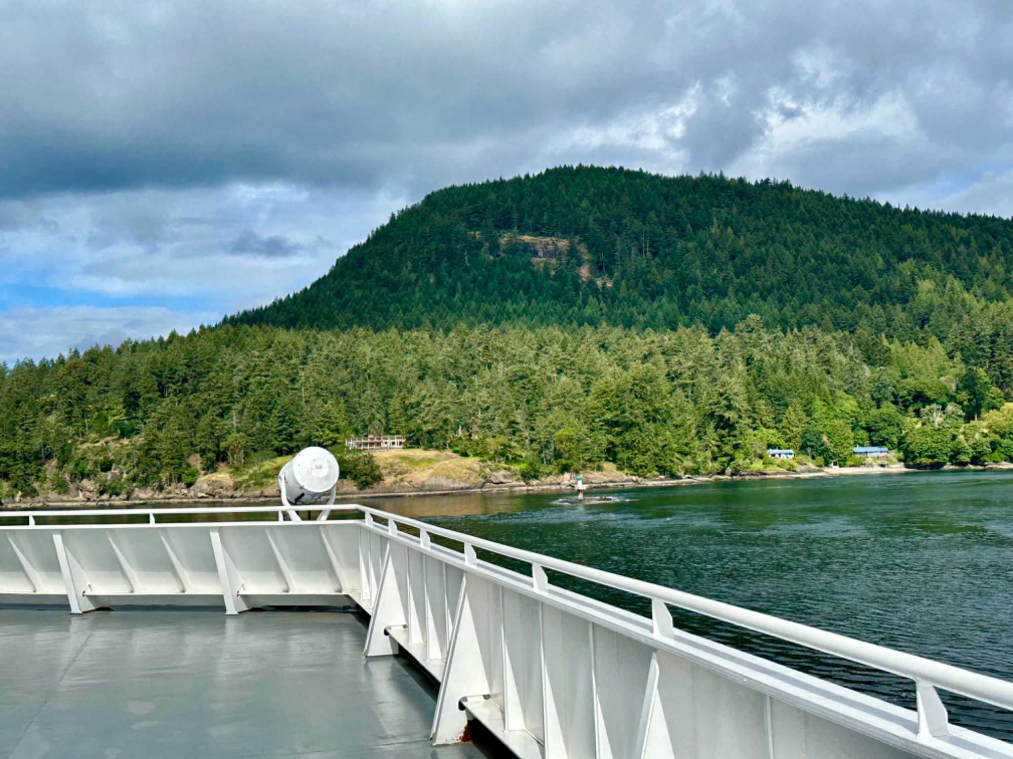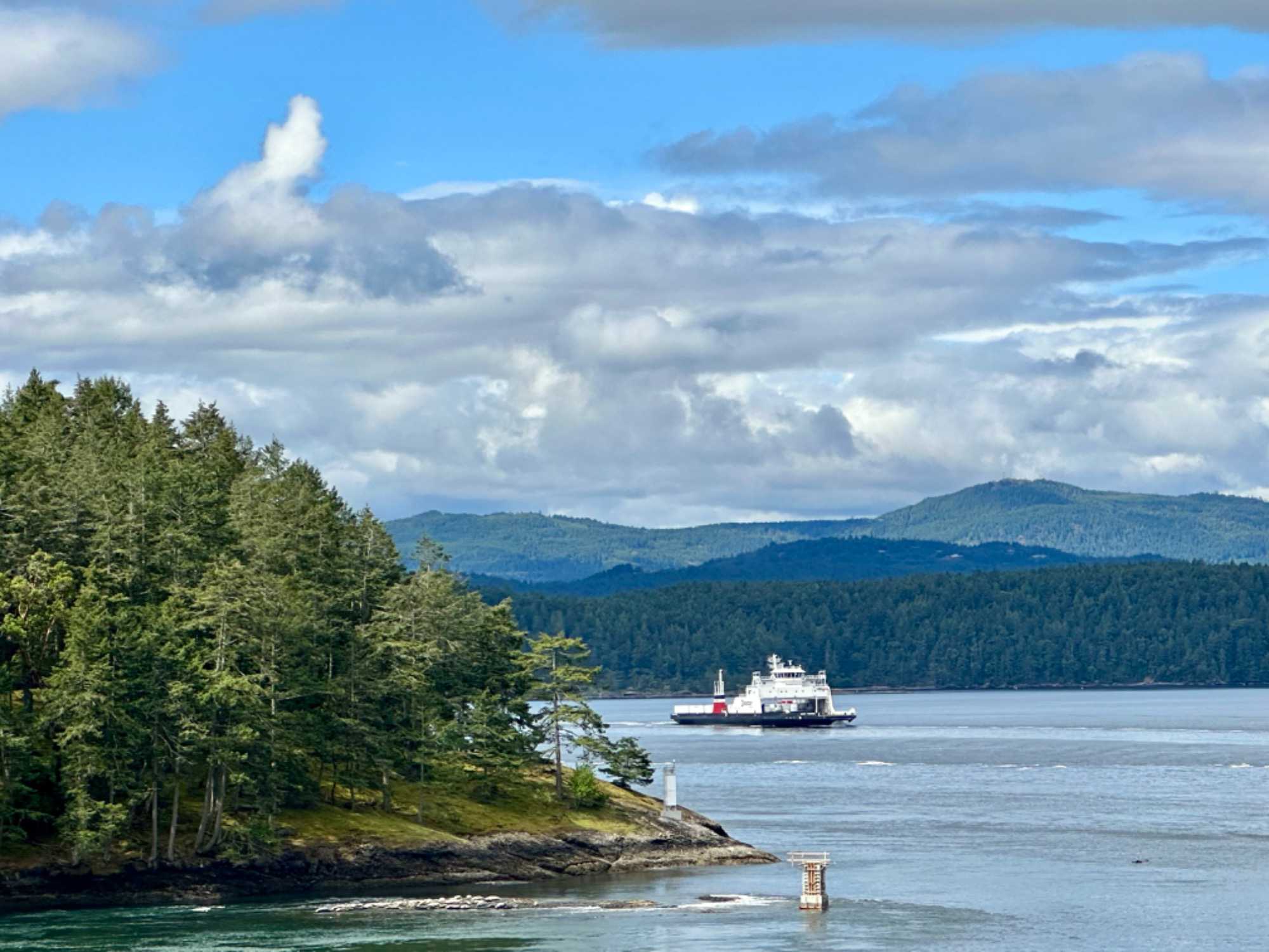 Nous sommes en avance pour prendre notre traversier mais c’est beaucoup mieux comme cela car nous n’avons pas de stress. On ne sait jamais avec la route comment cela peut se passer et il vaut mieux prévenir. Notre traversée ce matin est différente de celle vers Nanaimo car le traversier de Tsawwassen - Swartz Bay (Victoria) se rapproche incroyablement des îles Gulf et est nettement plus pittoresque. Nous pouvons voir les maisons sur les îles, les criques rocheuses, les phoques, parfois les baleines. La navigation est plus intéressante parce que nous voyageons à travers de petits canaux... Il a fait bien beau et nous sommes chanceux encore une fois.