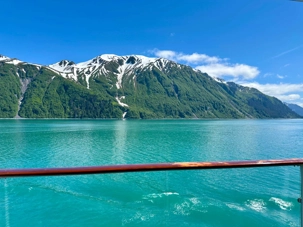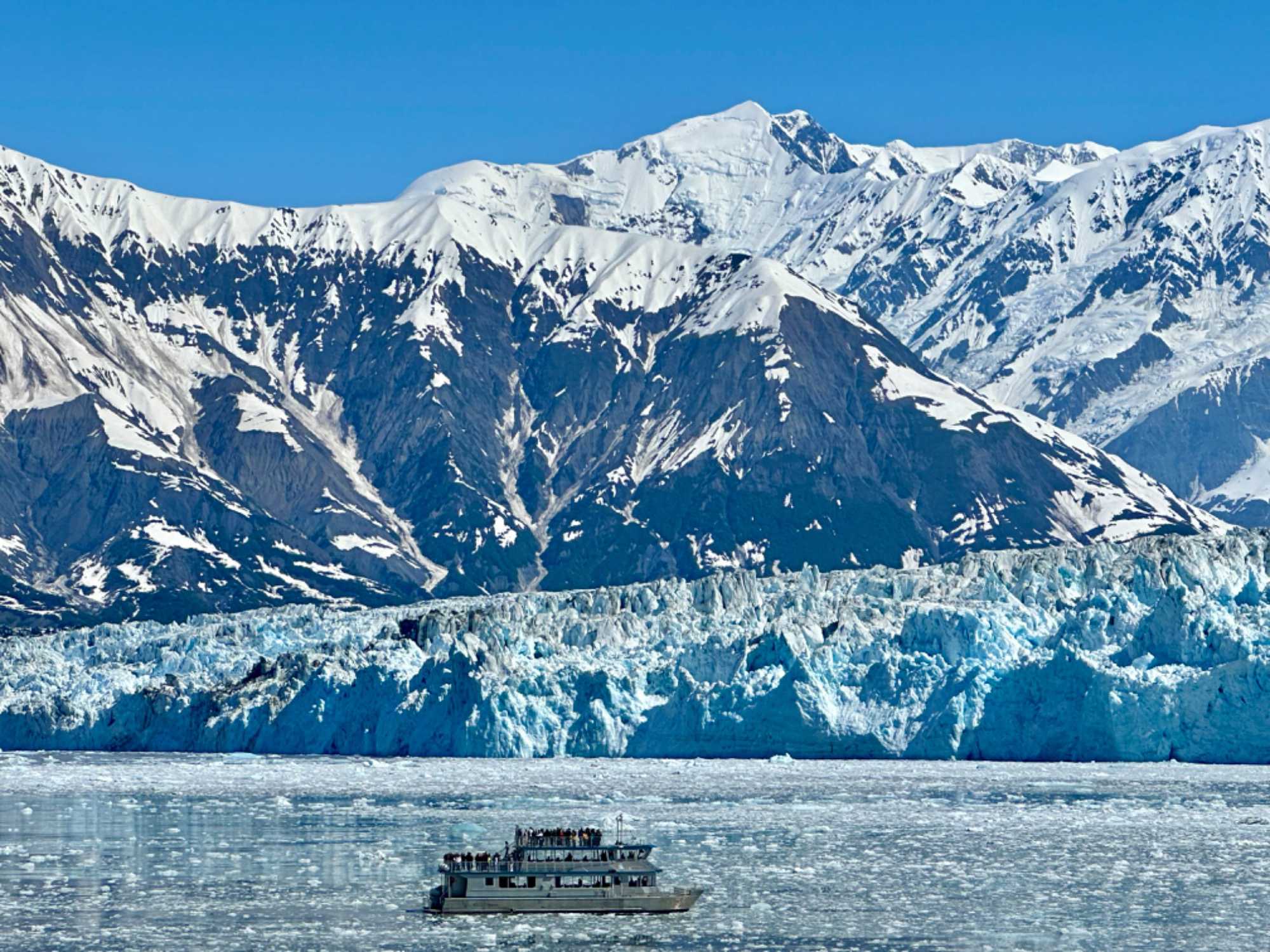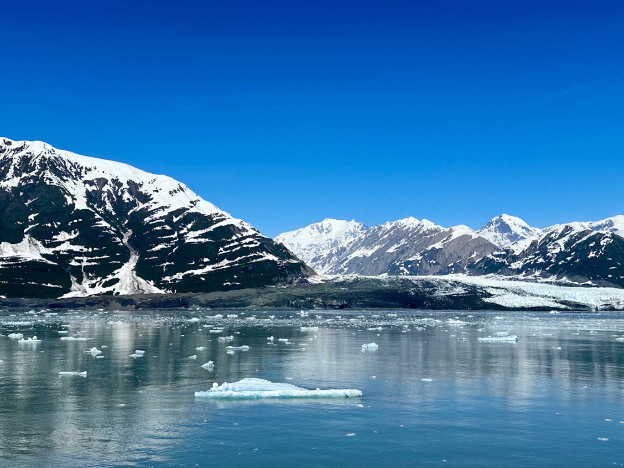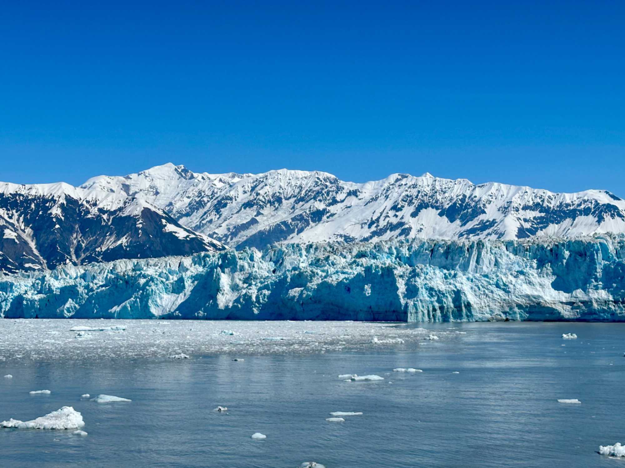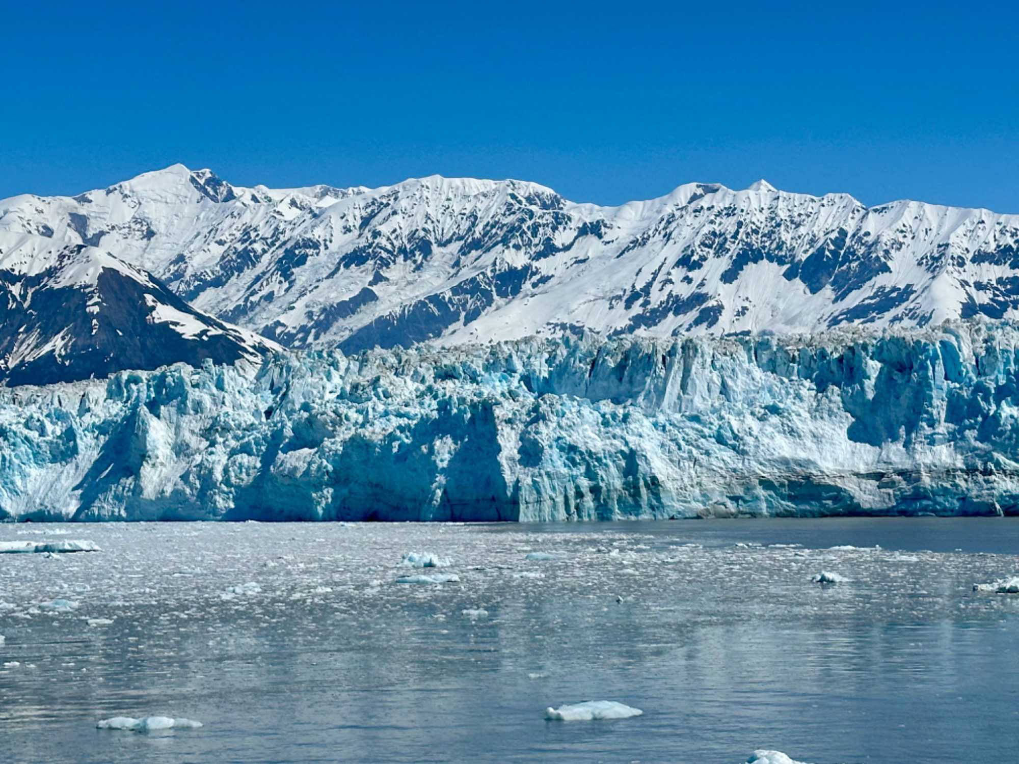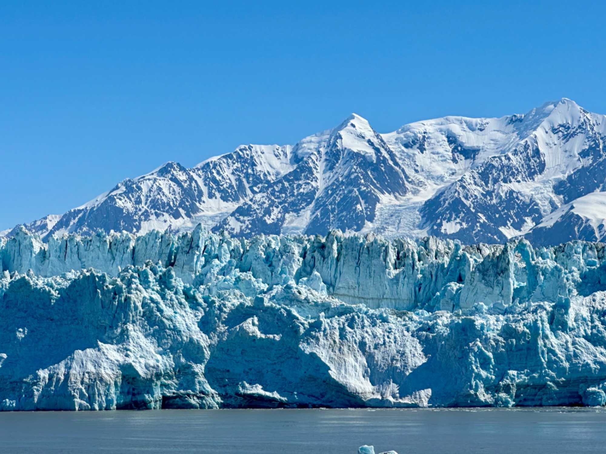 Ce matin, à mon réveil, je ne pouvais être certaine de la température qui nous attendrait à notre entrée dans la baie de Yacutat prévue entre 8 h 30 et 9 heures. Plus le navire avançait plus le ciel se dégageait, pour nous laisser tranquillement apprivoisé ce spectacle, comme la nature est incomparable! Notre beau navire avançait tout doucement au milieu d’un paysage grandiose en se faufilant entre certains petits icebergs. Pour ceux qui voulaient aller dehors, il fallait s’habiller très chaudement même si c’était ensoleillé; car le vent vient souvent du glacier et rend la température assez froide. Ce matin, nous les chaceux n’avons pas à trop s’inquiéter car il n’y a pas de vent ou presque. Les voyageurs ont toujours le choix de rester dehors à l’avant du navire, dans le confort de leur cabine balcon ou bien dans l’un des bars d’observation à l’intérieur. Lors de notre navigation, nous avons effectué du "sur place" durant environ 4 heures au glacier Hubbard. C’était juste incroyable de voir un ciel tout bleu sans aucun nuage avec un soleil resplendissant sur le glacier. Le bleu était à l’honneur car avec cette journée ensoleillée on ne peut pas manquer les reflets du glacier allant du bleu pâle à un bleu très intense. Nous avons eu droit à plusieurs vêlages du glacier et c’est toujours impressionnant d’entendre les coups de tonnerre lorsque la glace se fracasse et rejoint la mer. J’ai pu capter quelques photos mais avec un iphone c’était difficile de les faire de plus près. Mais on aperçoit tout de même le mouvement de l’eau à la tombée des blocs de glace. Un glacier est une masse compacte et dure d’eau gelée qui résulte de l’accumulation de couches de neige qui sous leur poids expulsent l’air qu’elles contiennent. Un glacier est une glace de terre alors que la banquise est une glace de mer. L’eau résultant de la fonte des glaciers se déverse dans les océans et provoque une hausse du niveau de la mer. Le glacier représente donc un stock d’eau douce solide qui se renouvelle par l’ajout de nouvelles couches de neige et la fonte de la glace. Le glacier est en mouvement, il s’écoule des parties hautes vers les parties basses. Tandis que le iceberg est un bloc de glacier qui se détache et qui dérive. Lorsqu’un morceau de glace se détache du glacier on parle de vêlage. Ces morceaux de glace, flottant à la dérive sur les océans, se nomment iceberg. La partie émergée (située à l'extérieur de l'eau) d'un iceberg ne représente environ que 10 % du bloc de glace.