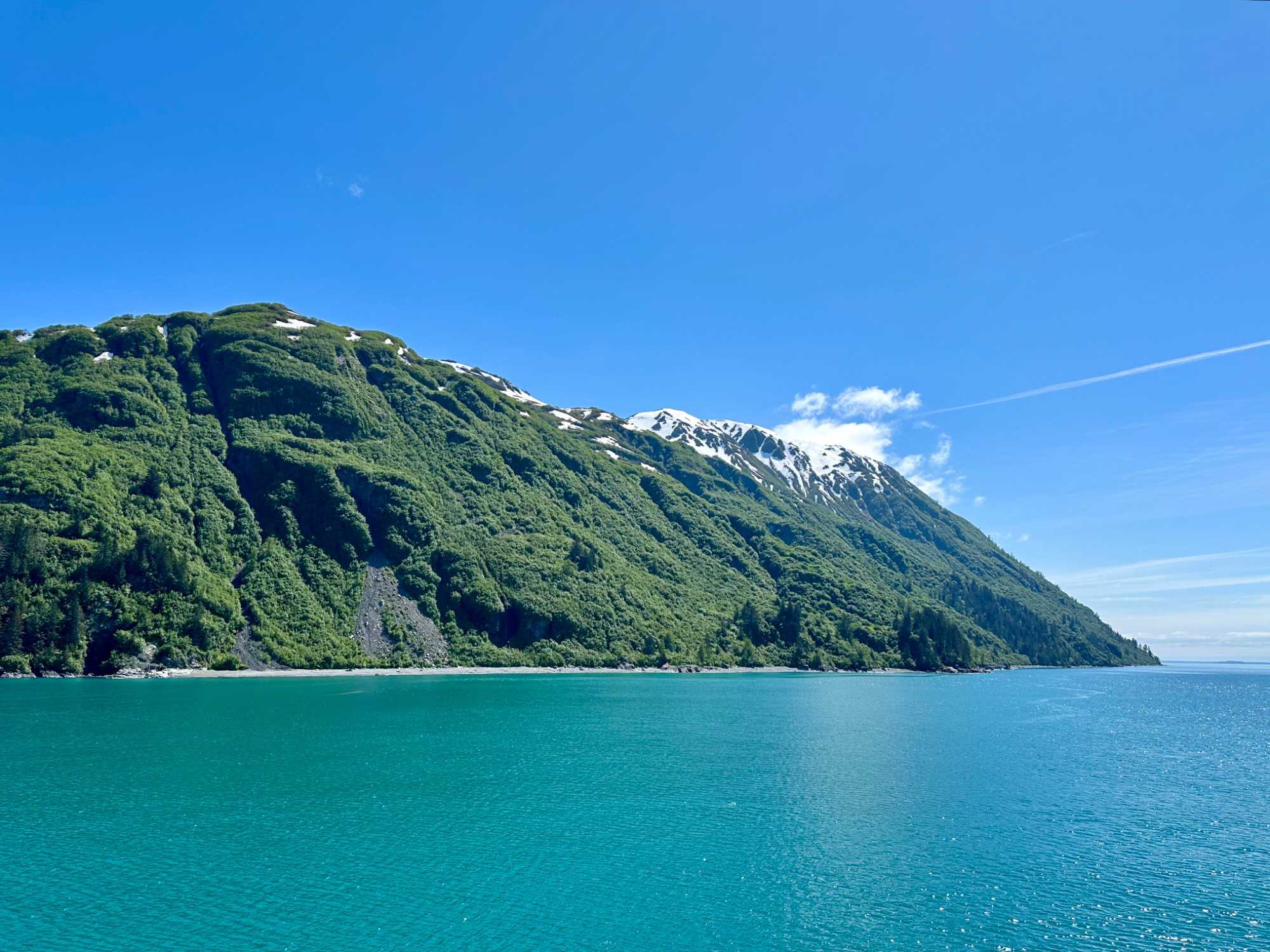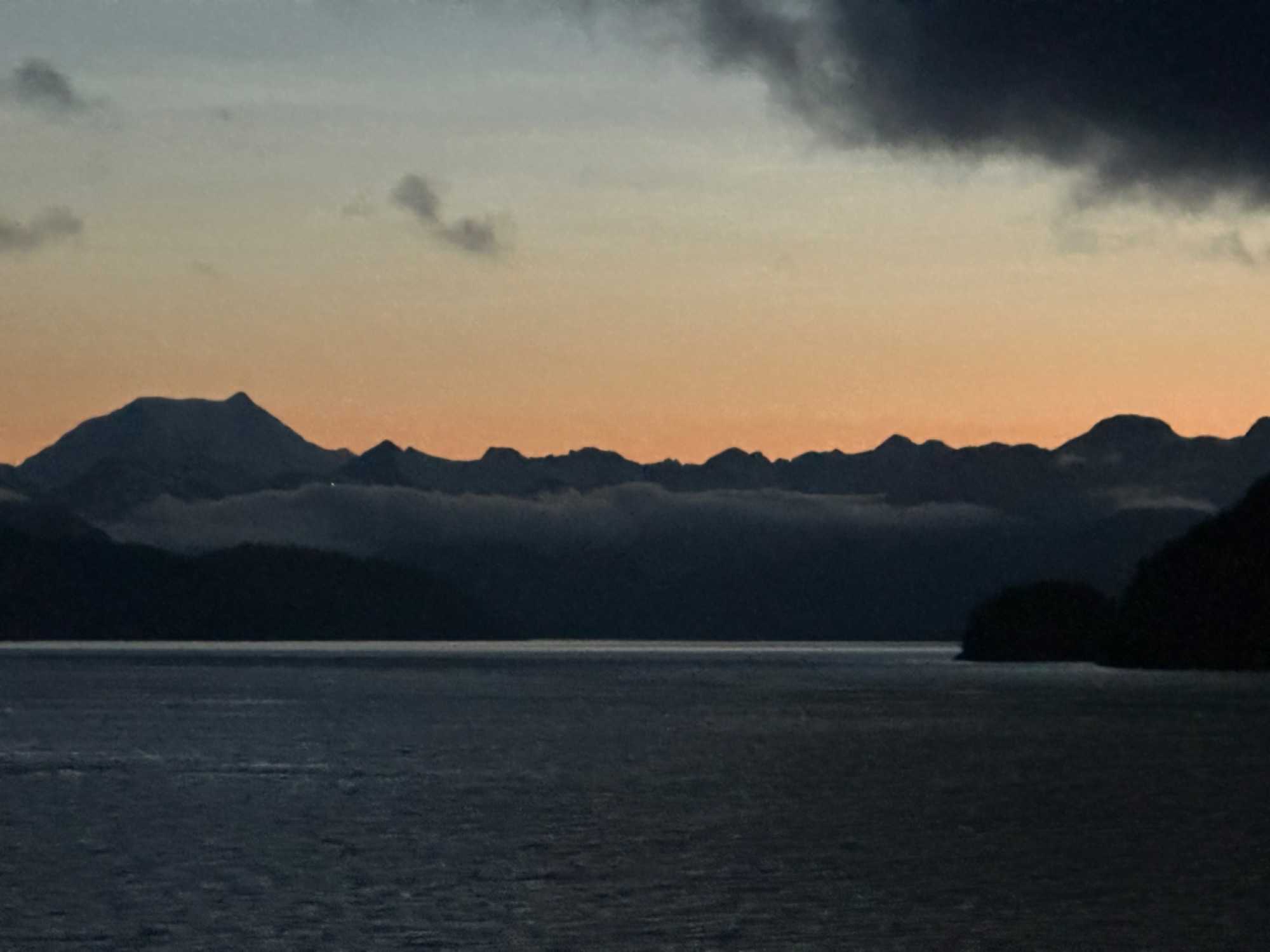 Le cocktail de ce soir était encore plus spectaculaire car nous avons suivi la chaîne de montagne de l’Alaska sous un ciel bleuté comme je m’y attendais. Il ne faut pas oublier que le soleil de minuit existe ici en Alaska et que les couleurs du ciel en soirée sont spectaculaires. Nous avons Josée et moi capter certaines belles images mais celles que notre mémoire emmagasinent sont toujours les plus belles. À vous de venir vivre l’Alaska un de ces jours! En passant nous suivons les nouvelles du Québec et de la canicule qui fait rage, et on peut vous dire que personne ne vous envie 😊 vive la fraîcheur de l’Alaska et ses 18 degrés ensoleillée.