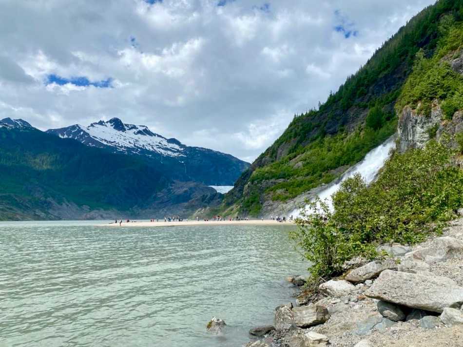 Tout au long du parcours, nous observons de nombreux aigles à tête blanche. Plusieurs se rendent à la chute Donutwaterfall, qui s’écoule d’une montagne pour se jeter dans le lac principal au pied du glacier de Mendenhall. Notre guide nous apprend aussi que le dépotoir est juste à l’arrière et que c’est un bon choix pour eux de survoller les endroits propices. Avec ce soleil et ce ciel bleu, nous avons une vue splendide et incroyable sur cette beauté naturelle.