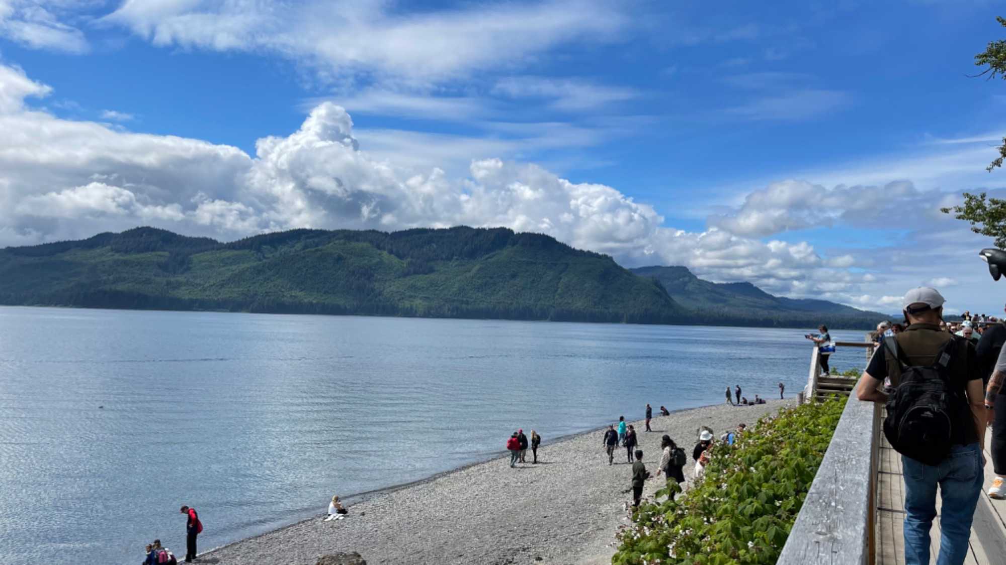 Rencontre avec tout le groupe à 14 heures pour notre première sortie depuis notre départ de Vancouver. Ici Strait Point se trouve dans le passage intérieur et par avion se trouve à 80 km à l’ouest de Juneau et à 96 km au nord de Sitka. Nous y retrouvons un musée d’interprétation du saumon, des boutiques et des restaurants dans lesquels il est possible de déguster du crabe. Cet endroit éloigné idéal pour les amoureux d’aventure, avec des possibilités infinies d’explorer les grands espaces sur fond de montagnes enneigées, de glaciers lointains, de forêts denses et anciennes et des eaux étincelantes du détroit de glace, qui abritent une vie marine abondante. Ici Strait Point est situé près de la ville de Hoonah -qui signifie à l’abri du vent du nord-, la plus grande colonie indienne indigène de Tlingit en Alaska, 900 habitants. Les habitants partagent la mer avec les baleines à bosse, les orques, les marsouins de Dali, les phoques, les loutres, les flétans et les 5 espèces de saumon du Pacifique. Village de pêcheurs, on y retrouve plusieurs totems hautement colorés. En 1880, la compagnie commerciale du Nord-Ouest y construisit un premier magasin.