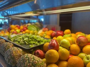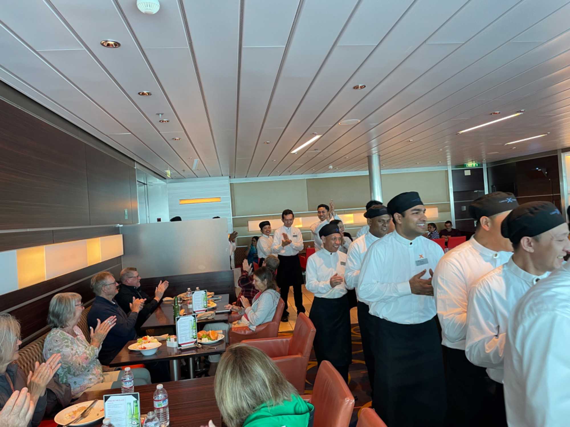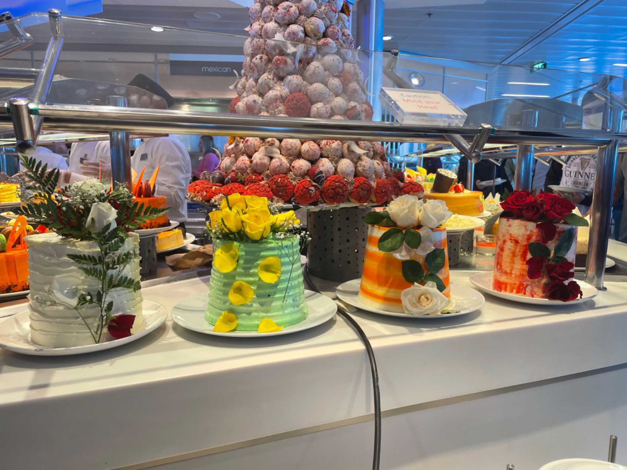 Aujourd’hui, au buffet du 14e étage, nous avons eu droit à une fontaine de chocolat et à des gâteaux en quantité industrielle -maintenant nous savons que tous ce que nous mangeons est fait sur place, dans les cuisines du navire (nous les avons visitées hier) - il y avait du monde mes amis. Tout est délicieux que ce soit à la salle à manger, dans les restaurants de spécialité ou au buffet.