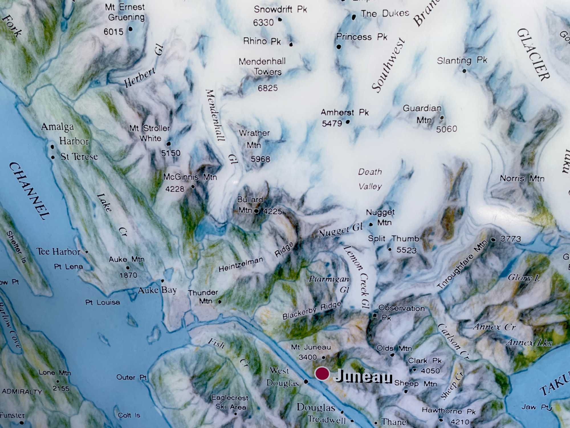 La petite ville de Juneau, la capitale de l’Alaska, est entre terre et mer, forêts et eau et teintée de bleu ciel, glace blanche, montagnes noires et forêts vertes. 60 km de routes pavées seulement et aucune route ne se rend à la capitale.