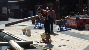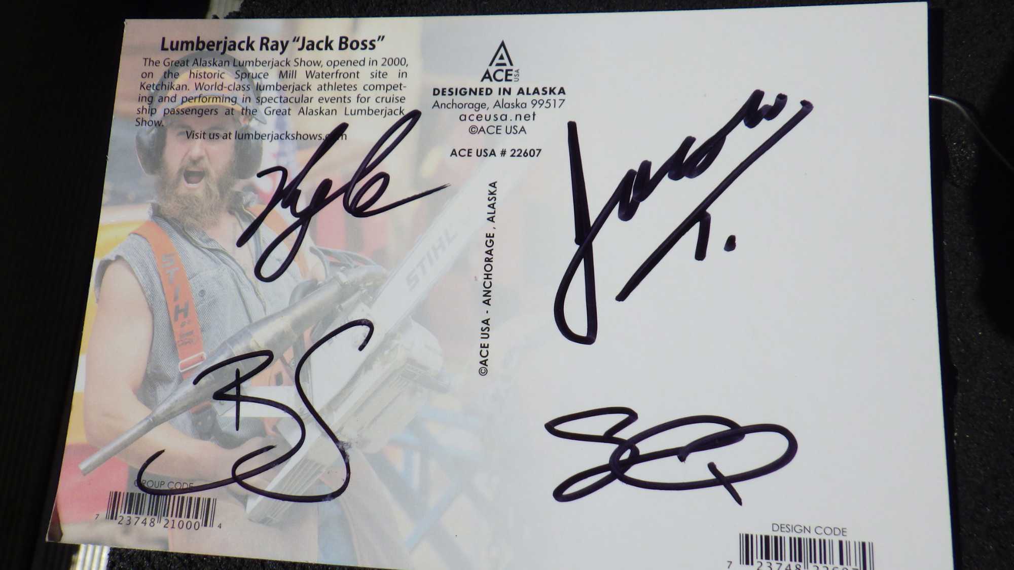 Je peux vous dire que le spectacle des bûcherons était très bon et qu’il faisait chaud en titi, autour de 25 degrés. Nous avons eu tellement de plaisir et en plus, l’équipe des É.-U. a gagné contre l’équipe du Canada. Ce spectacle s'appelle « The great Alaska Lumberjack Show » et met en compétition des hommes qui savent manier autant la scie que la hache. De jeunes draveurs en actions et les spectateurs qui s’émoustillent face à la dose de testostérone et des performances de ces bûcherons. Une compétition qui consiste à couper le plus rapidement les bûches à la hache, à la sciotte, la montée dans un arbre, le duel de la gigue sur la « pitoune » dans l’eau! Et bien d’autres compétitions, le tout animé de manière humoristique par une sorte de géant. J'ai même eu la chance de gagner une des 8 photos signées par les draveurs. Je l'ai remis par la suite a un petit garcon malheureux de ne pas avoir eu cette chance, il était tellement content qu'il me serrait dans ses bras, trop heureux d'avoir ce souvenir incroyable.