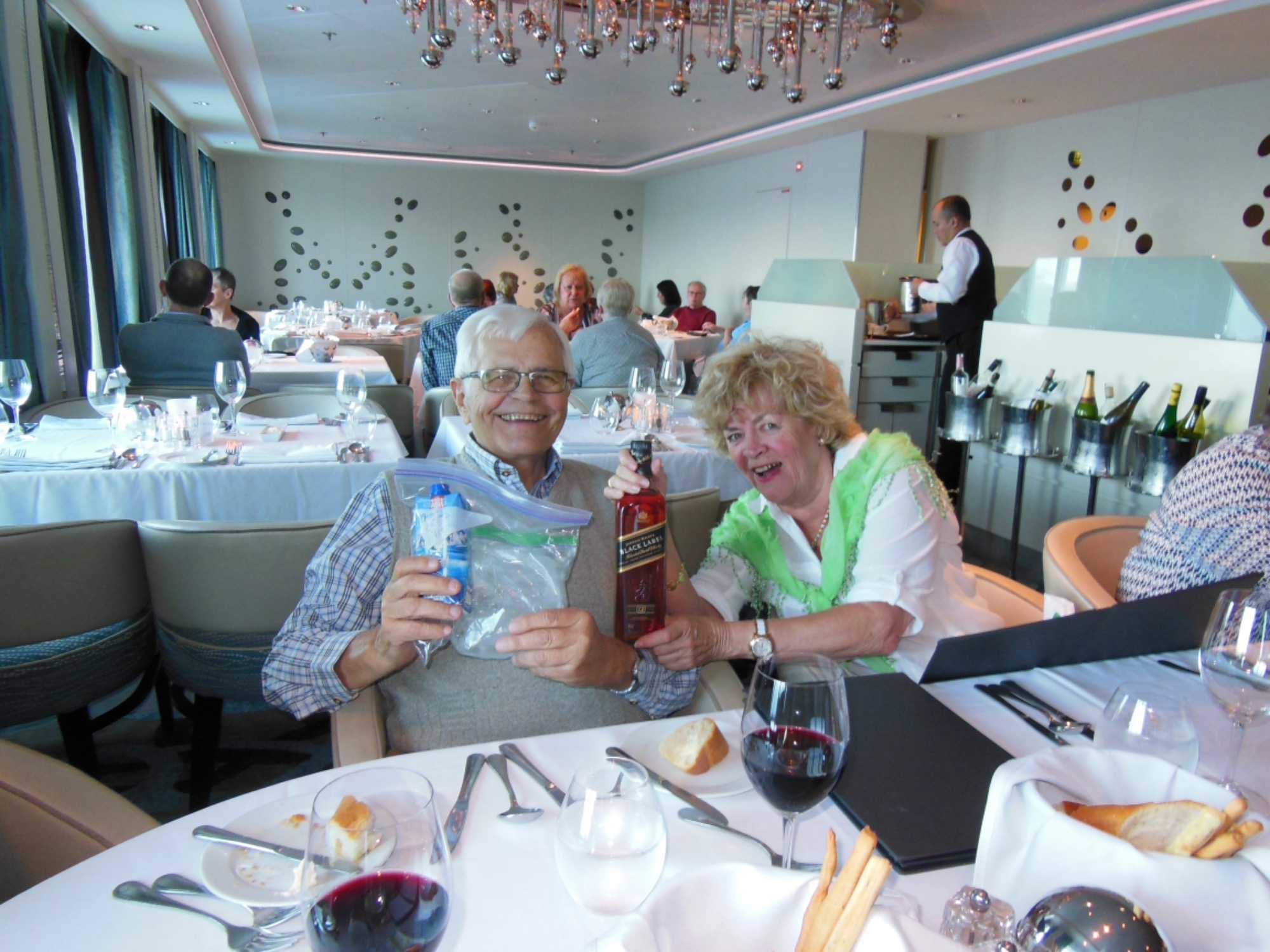 À l’heure du souper, j’ai fait une petite surprise à Georges. Puisqu’il avait mentionné vouloir obtenir de la glace d’un glacier pour prendre son Whisky Black Label vieilli de 12 ans... J’avais imaginé la surprise à Ushuaia en achetant un contenant de 500 ml d’eau de glacier certifié pure. Depuis, j’ai tenté différentes approches auprès du personnel pour faire geler cette eau. J’ai fait congeler le tout pour Georges et voilà qu’il a pu déguster son Whisky comme il le souhaitait. Nous avons eu du plaisir à fêter cet évènement avec lui et j’étais très contente de voir sa belle réaction. Il suffit souvent d’un tout petit geste pour faire plaisir.