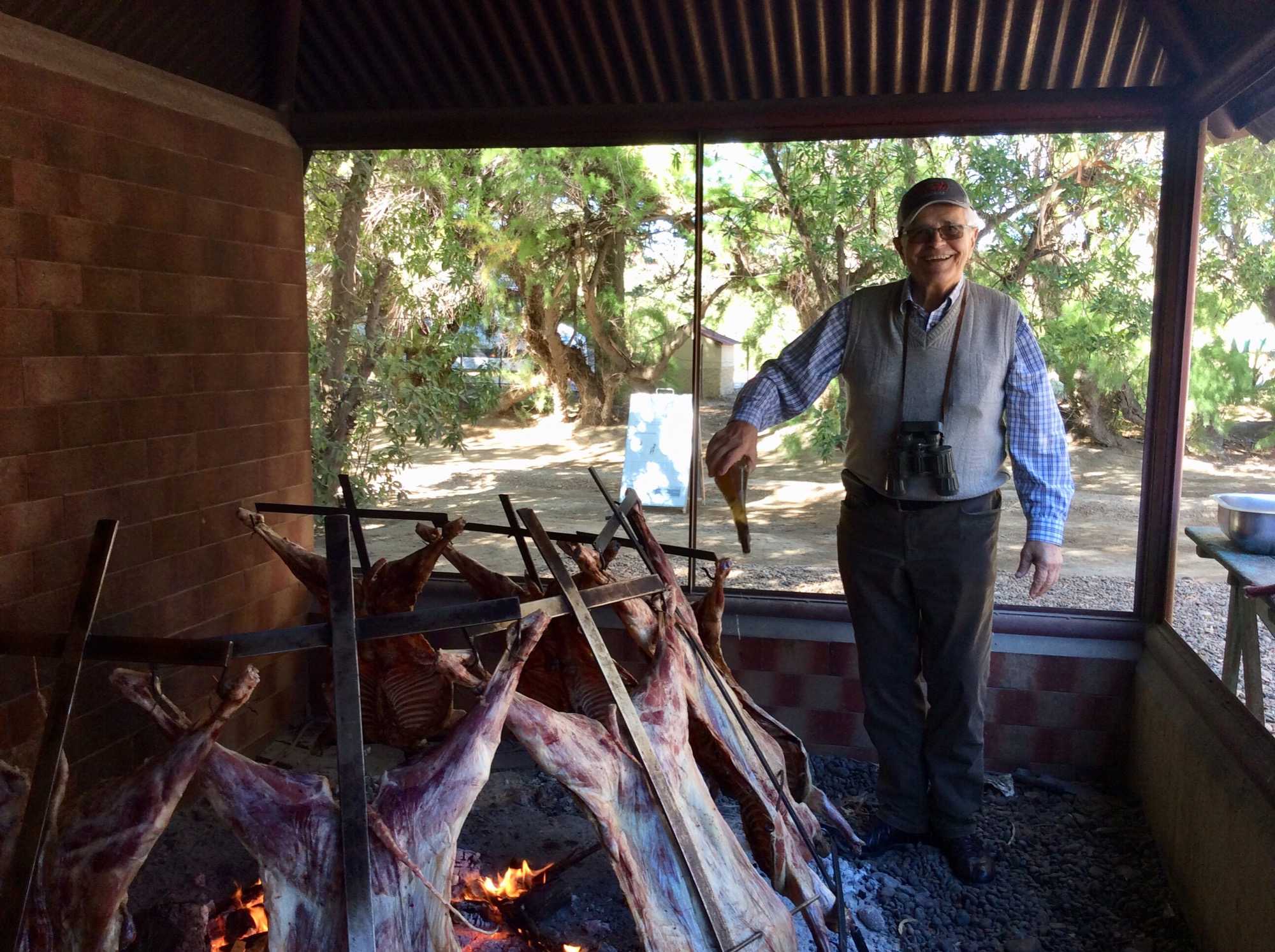 Nous arrivons à destination dans cet endroit magique. Perdu dans l’immensité de la steppe, nous sommes à l’Estancia El Pedral. Quel beau domaine dépaysant aux abords de la Péninsule de Valdès, à 73 km de Puerto Madryn. Nous y trouvons un manoir basque construit en 1923 Il est plein de charme et perdu dans la nature. Ici, il n’y a ni téléphone, ni réseau internet et pas de télévision. Les employés du manoir sont à préparer le dîner pour leurs invités. Huit carcasses de moutons sont en train de cuire au feu du méchoui. Georges s’offre pour aider les cuisiniers le temps d’une photo! Un jeune guanaco adopté arrive soudainement pour se faire nourrir au biberon par la propriétaire du domaine. Nos voyageurs en profitent pour l’aider. Le jeune animal se prête au jeu, au plus grand plaisir de tous, tant que le biberon n’est pas vidé.