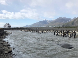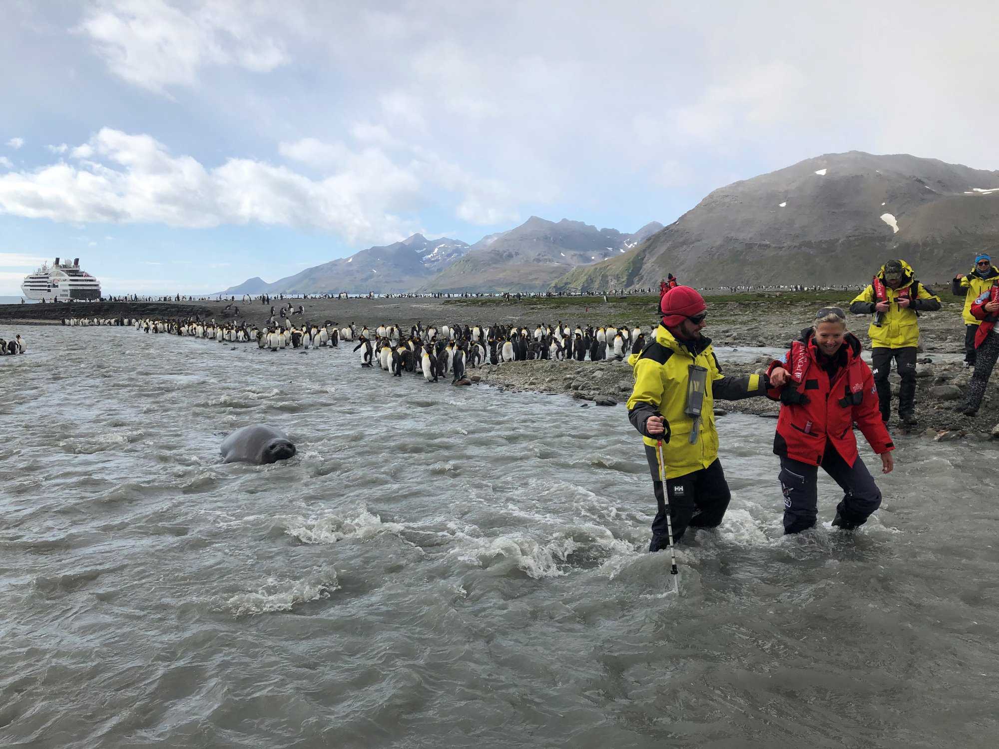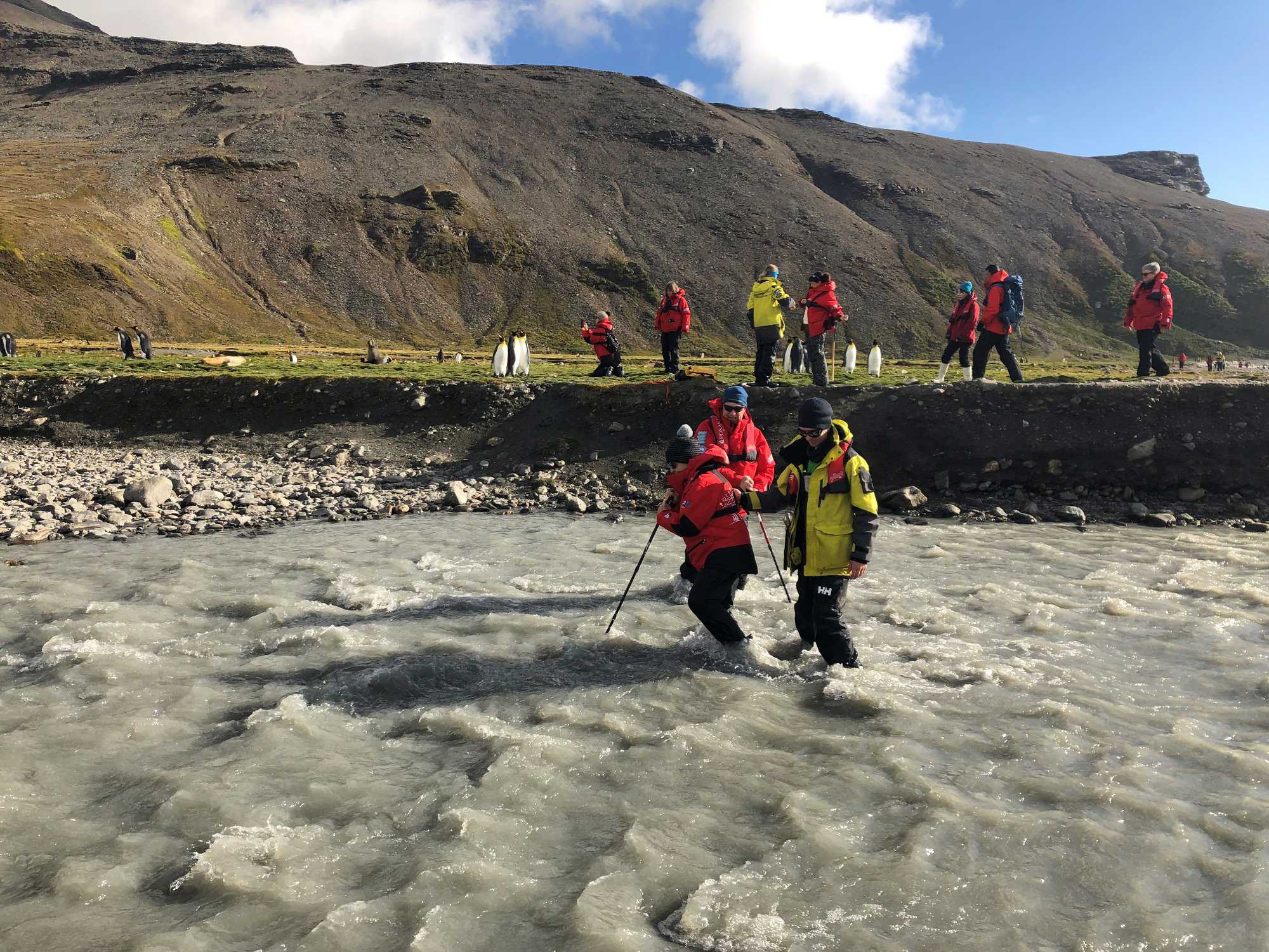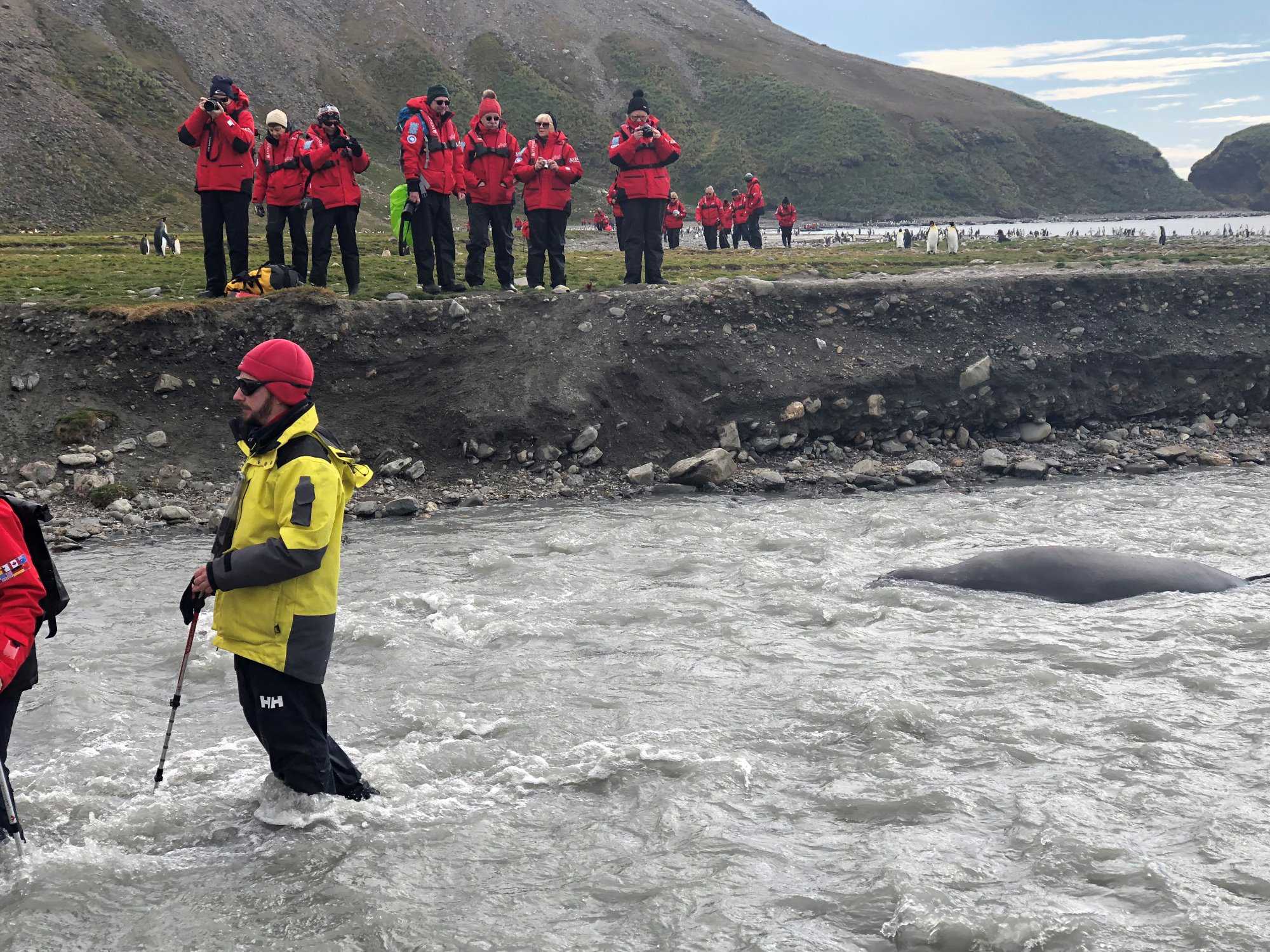 Notre groupe quittait à 7 h 30 ce qui était une belle heure car plusieurs étaient sur le départ de 6 h 00. Donc à 7 h 30, nous quittons notre navire pour avancer vers la magnifique baie de Saint Andrew. Lorsque l'on arrive nous sommes seuls, à côté de quelques otaries à fourrure, de beaux manchots royaux et d’un éléphant de mer ensommeillé. On nous explique qu'une superbe marche nous amènera vers un point de vue sur une colline d’où nous aurons une vue spectaculaire. Pour se rendre à ce point de vue nous devrons traverser deux rivières de moraines alimentées par le glacier. Elles étaient assez puissantes mais nos guides naturalistes ont bien trouvé un endroit plus facile pour traverser. Je dirais que plus de la moitié du groupe a traversé de l'autre côté de cette rivière. Et, un fait amusant, au retour, un immense éléphant de mer était venu tout près pour nous surveiller durant la traversée.