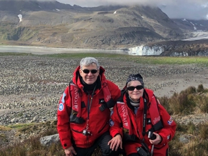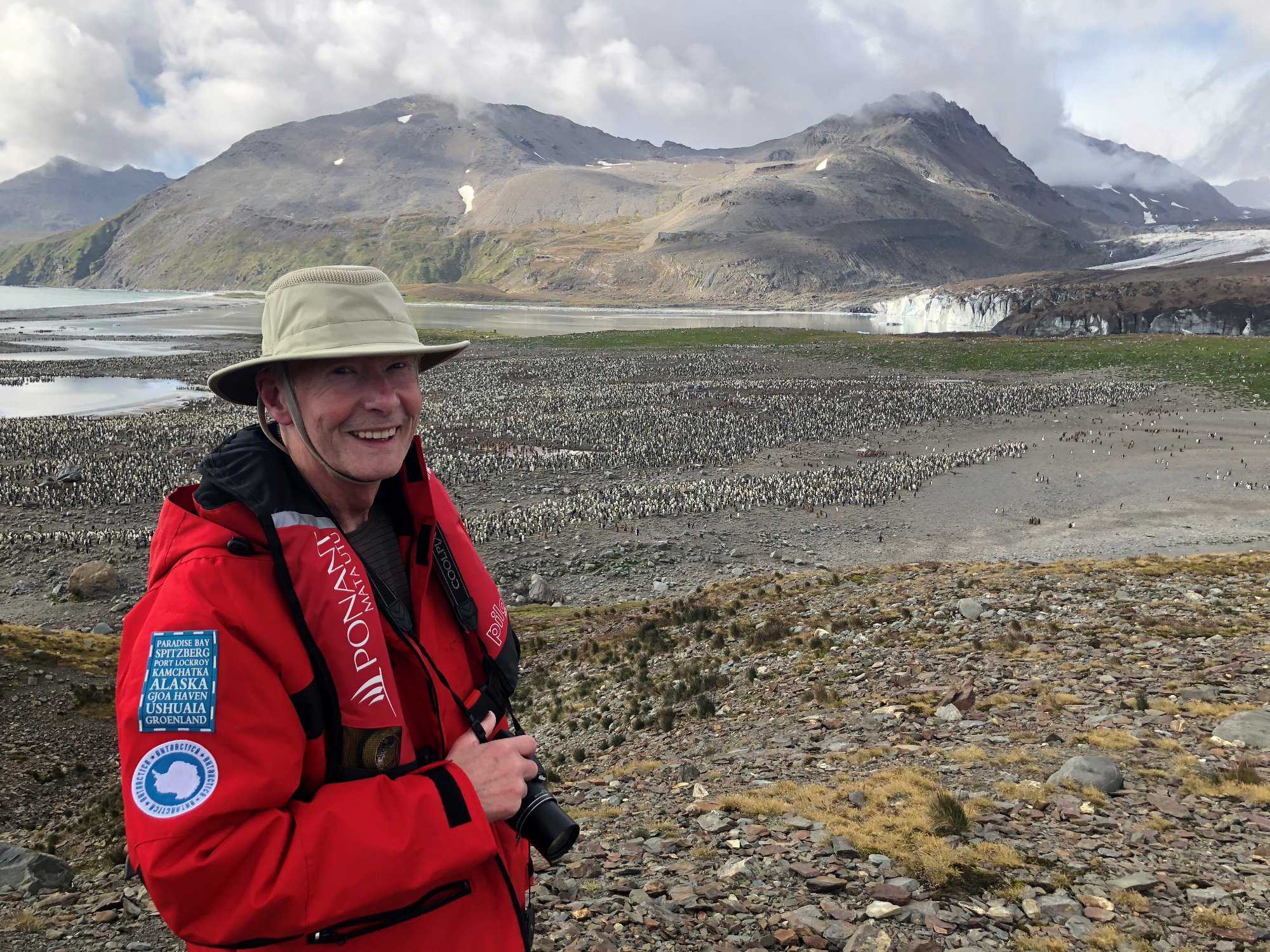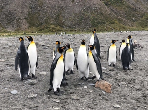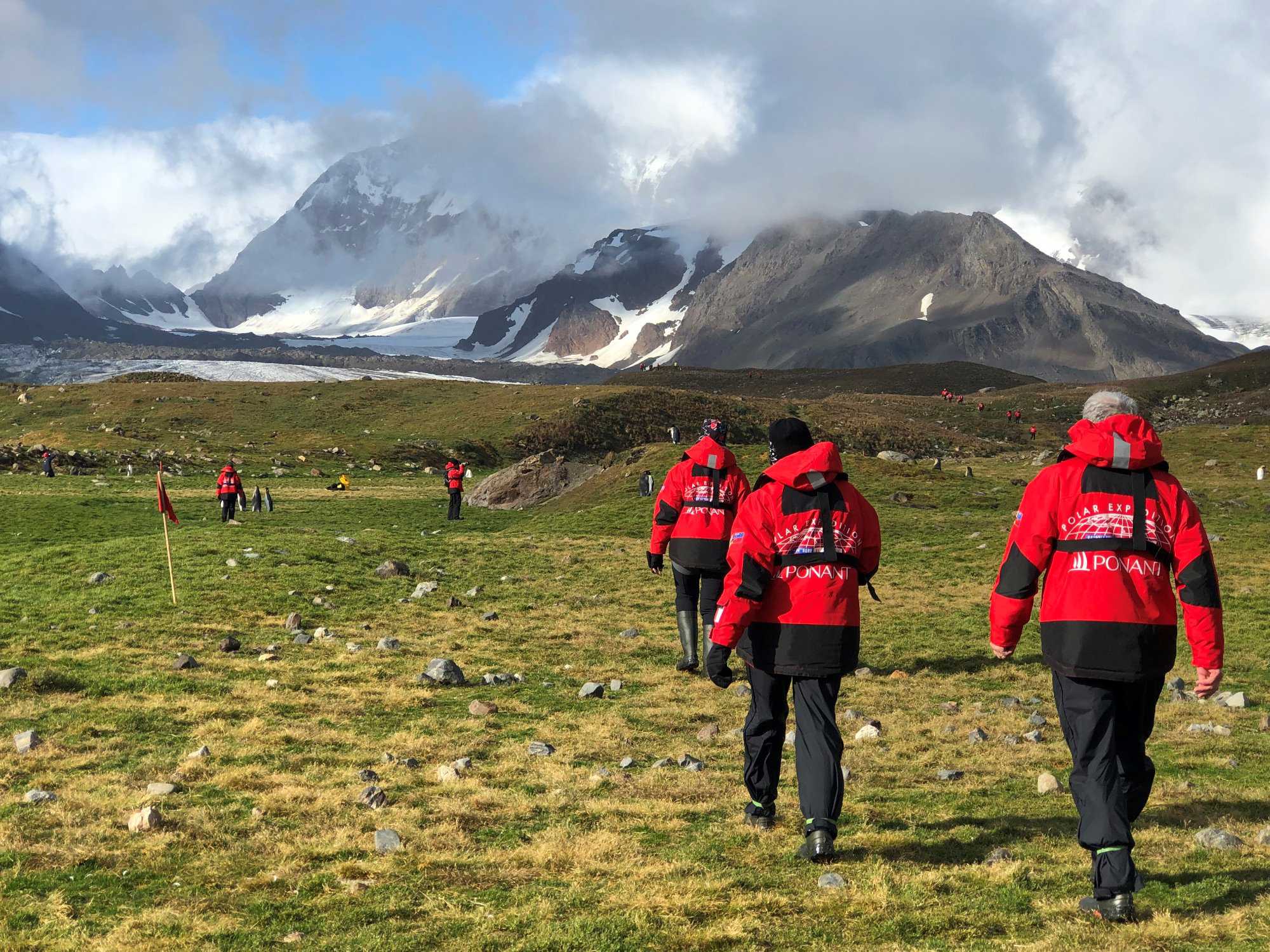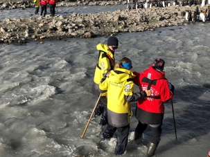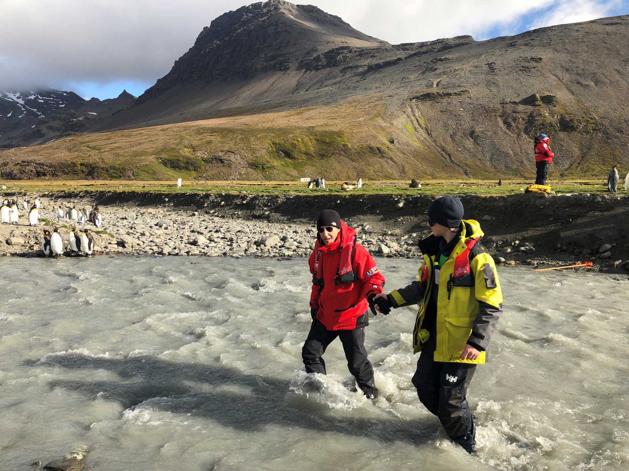Notre groupe quittait à 7 h 30 ce qui était une belle heure car plusieurs étaient sur le départ de 6 h 00. Donc à 7 h 30, nous quittons notre navire pour avancer vers la magnifique baie de Saint Andrew. Lorsque l'on arrive nous sommes seuls, à côté de quelques otaries à fourrure, de beaux manchots royaux et d’un éléphant de mer ensommeillé. On nous explique qu'une superbe marche nous amènera vers un point de vue sur une colline d’où nous aurons une vue spectaculaire. Pour se rendre à ce point de vue nous devrons traverser deux rivières de moraines alimentées par le glacier. Elles étaient assez puissantes mais nos guides naturalistes ont bien trouvé un endroit plus facile pour traverser. Je dirais que plus de la moitié du groupe a traversé de l'autre côté de cette rivière. Et, un fait amusant, au retour, un immense éléphant de mer était venu tout près pour nous surveiller durant la traversée.