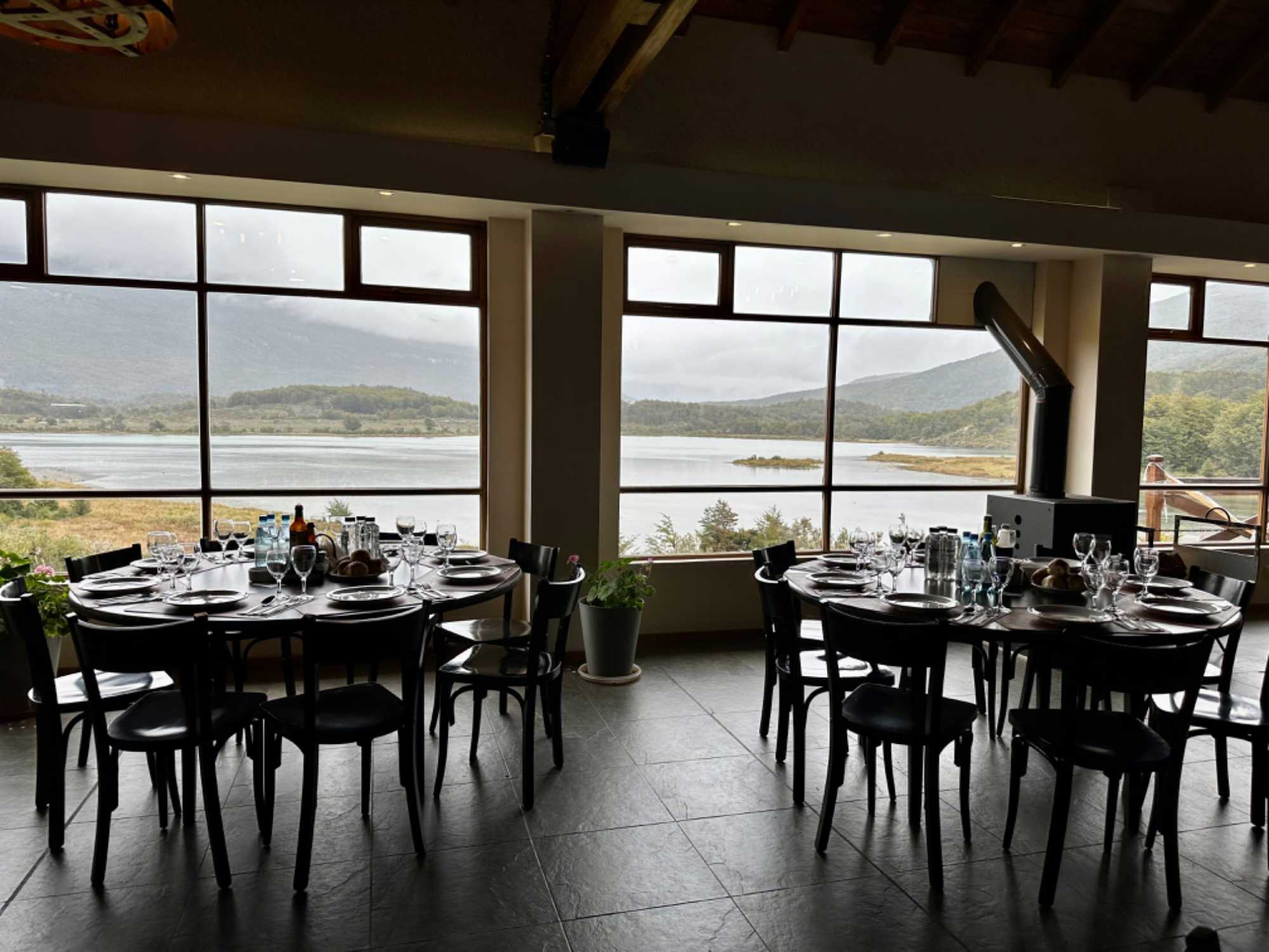 Notre charmant guide était au rendez-vous pour notre arrivée dans le tout petit aéroport de la ville. Un seul appareil à la fois peut atterrir ici ! Nous récupérons nos valises. Quel soulagement, elles sont toutes là ! On ne peut s’imaginer une valise manquante pour une expédition de ce genre…c’est bien différent d’une croisière dans les Caraïbes. Tout est donc parfait et nous sommes prêts à partir à la découverte du parc de la Terre de Feu. Un autobus nous attendait dans cette ville de 83 000 habitants. Nous nous dirigeons vers notre restaurant situé à l’intérieur du parc. Un succulent repas nous a été servi, l’agneau cuit sur le feu dans la tradition locale, était vraiment exceptionnel. Pour ceux qui n’aimaient pas, nous avions également des pâtes aux champignons. Mais l’agneau valait le déplacement.