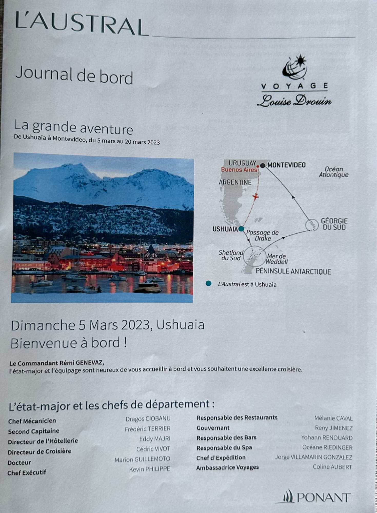 Après quelques arrêts dans le parc, nous nous dirigeons au port où nous sommes excités de monter à bord de ce navire d’exception. On sent la joie sur les visages de tous les voyageurs lorsqu’ils gravissent la passerelle de l’Austral pour 15 nuits. Ce soir, direction Antarctique, une destination tant rêvée pour la plupart des voyageurs. Quel accueil par l’équipage et par le capitaine Remi Genevaz, qui étaient sur le pont pour nous souhaiter la bienvenue. Digne d’un navire de luxe! On peut dire qu’avec seulement 200 passagers à bord, on se sent comme chez-nous… . Alors en route pour de magnifiques aventures !