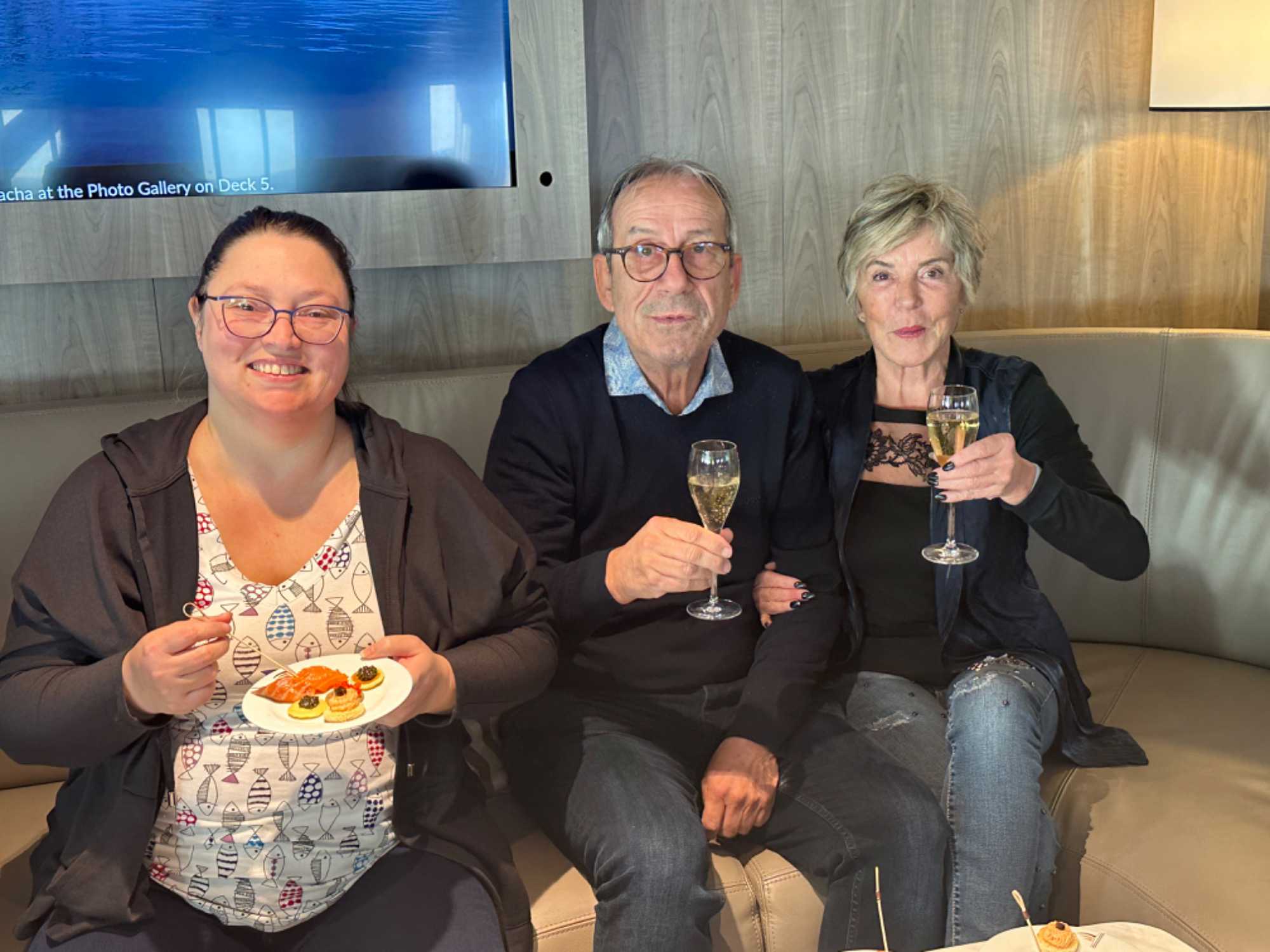 Après le souper , une soirée dansante latino avec un duo de musiciens a permis à certains de se déhancher … tout en gardant l’équilibre avec la houle présente. Nos compagnons Nicole et Pierre sont toujours les premiers à fouler le plancher de danse.
