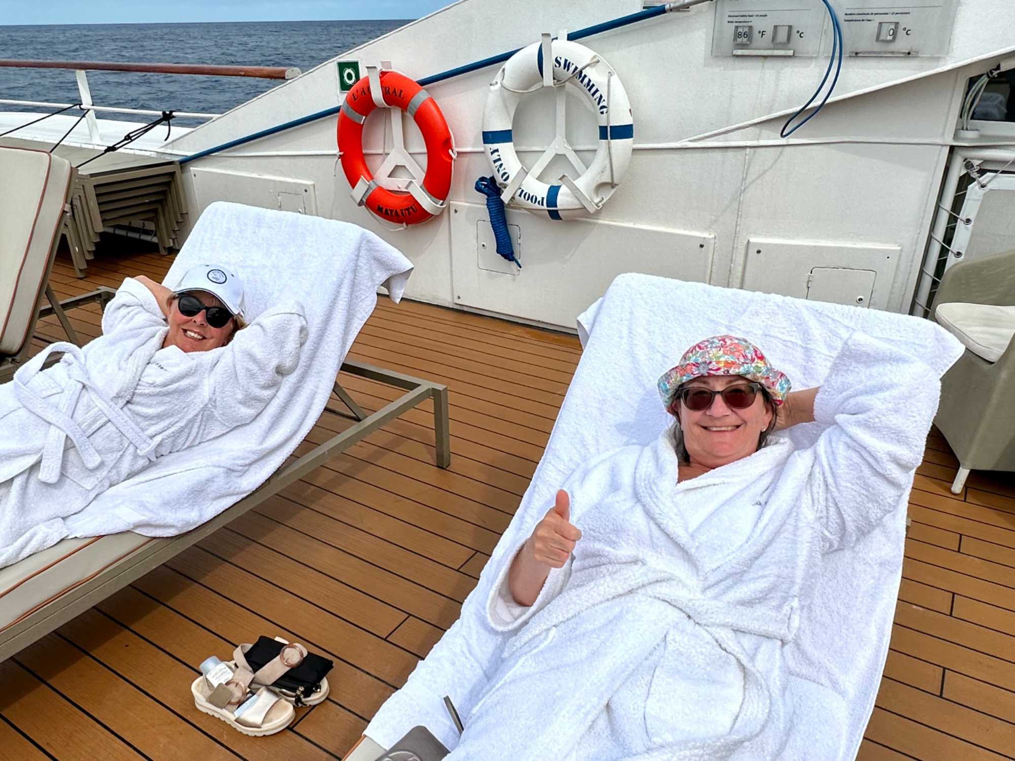 Très beau soleil à notre réveil et la température extérieure est de plus en plus plus clémente. C’est tellement un temps agréable que ce matin, quelqu’uns ont utilisé la piscine. Céline et Diane ont même laissé tomber la conférence de ce matin pour se prélasser au soleil avec un verre de champagne. Plusieurs ont même dîner à l’extérieur. Il faut en profiter, la croisière achève.