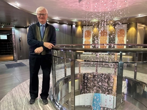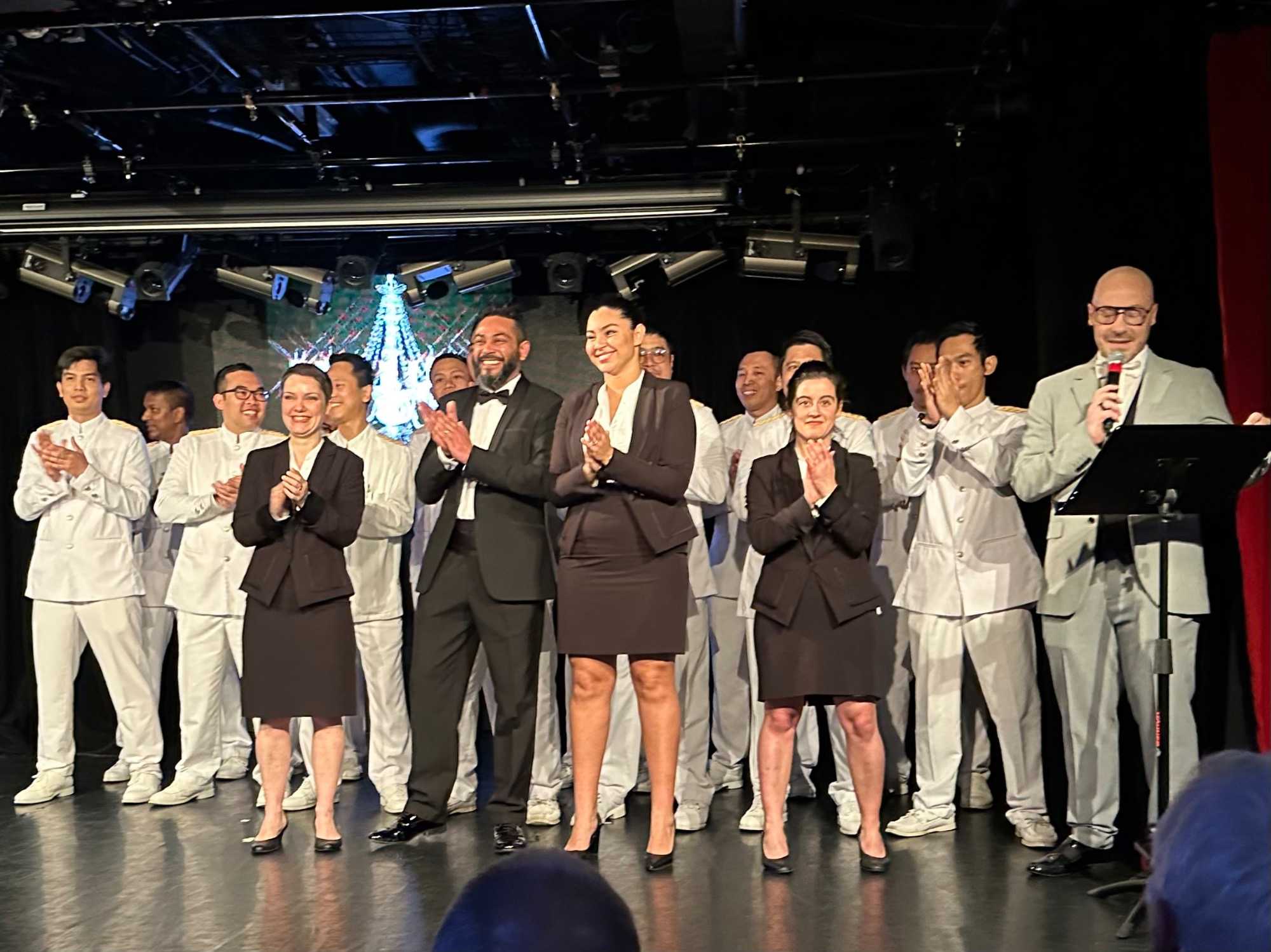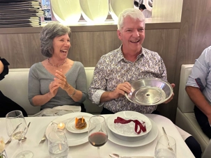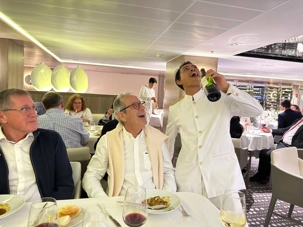 Un cocktail de l’Aurevoir nous est servi avec la présentation de tous les membres d’équipage et du personnel. Ces derniers sont 156 pour 170 passagers, nous avons été très gâtés. Lors du souper d’Aurevoir, nous soulignons l’anniversaire de Bernard. Sachant qu’il adore croquer de la glace, un plat de glaçons lui a été servi comme dessert … bien entendu il en a eu un vrai par la suite. Le spectacle « Paris Express » style cabaret, suivi de la musique du duo de musiciens latinos a conclu cette belle soirée.