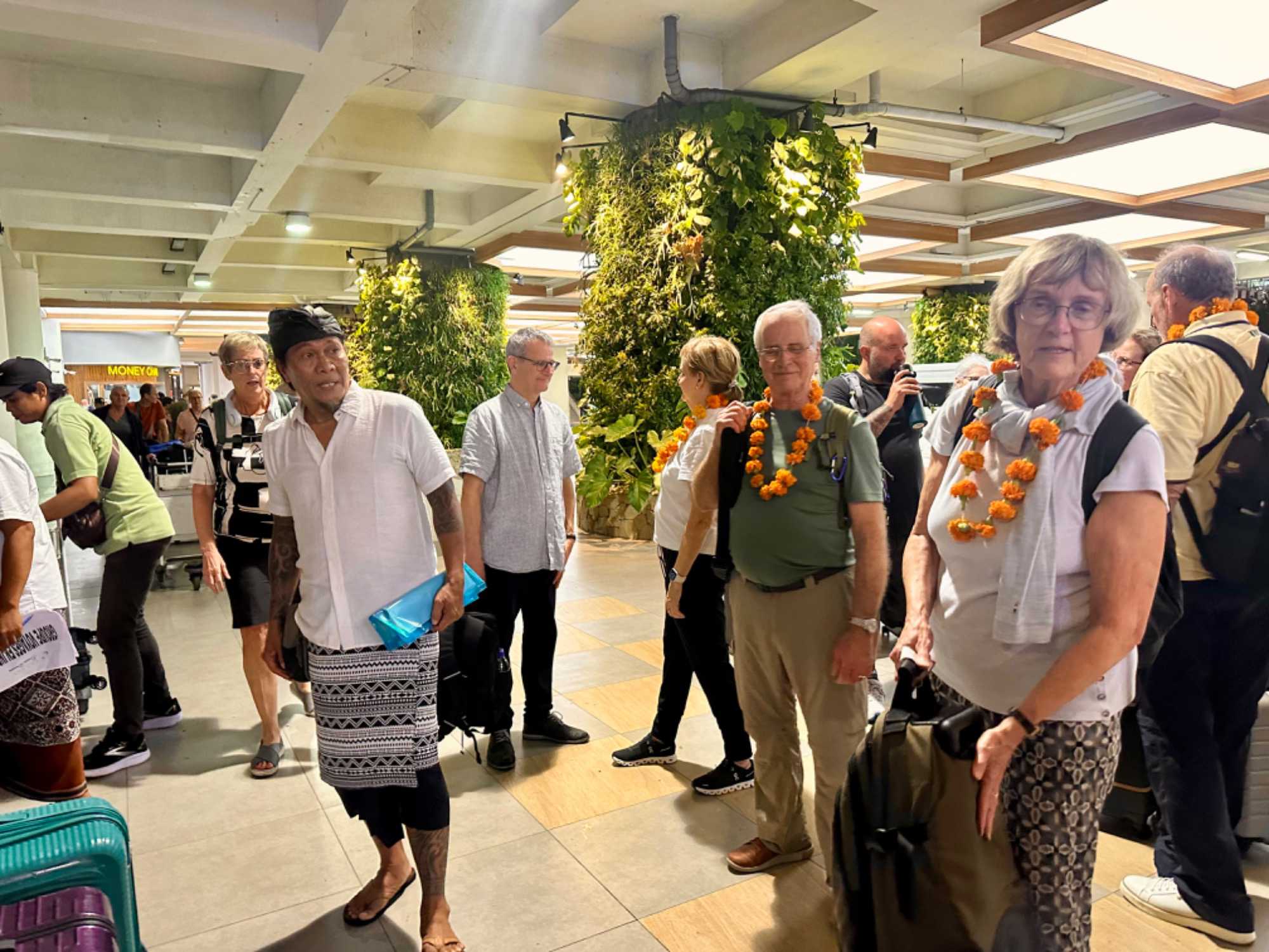 Bonjour à vous chers lecteurs, c’est à 2h30 que nous prenions un vol vers l’Aéroport de Denpasar à Bali. Un vol d’une durée de 9h20. Les voyageurs s’étant reposé, c’est avec fébrilité que je prends ce vol. J’ai tellement hâte de voir Bali. Je n’ai cessé de lire des articles au cours des derniers mois qui identifiait Bali comme l’une et même, LA destination incontournable de 2025 ! Nous y sommes ! Nous arrivons ici avec un décalage horaire de + 13 heures avec le Québec. Nous sommes accueillis à l’aéroport par nos deux guides francophones, Popo et Kabal. Nous prenons deux autocars pour se rendre à notre hébergement. En route, nos sympathiques guides nous expliquent entres autres la signification des prénoms balinais, quelques mets typiques, quelques notions en lien avec les différentes religions, coutumes, langues des principales îles de l’archipel de l’Indonésie. Malgré les différences, il semble régner un grand respect entre les Indonésiens.