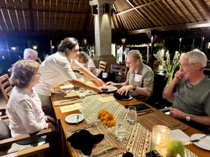 Enfin nous arrivons à notre hébergement. Nous sommes logés au Ubud village, il s’agit d’un Resort and Spa 5* et nous y serons jusqu’au 22 janvier, pour 4 nuits. Nous sommes dans le village de Pengosekan et à seulement 10 minutes à pied de la forêt des singes. Moi qui adore les primates, j’ai tellement hâte de visiter ce lieu. Mais avant tout, nous prenons un excellent souper. Nous avons souligné l’anniversaire de Marcel Delorme en chantant dans plusieurs langues avant qu’il ne se sauve se reposer. Après ce long déplacements les voyageurs avaient tous hâtes de découvrir leur hébergement et surtout se reposer confortablement.