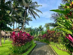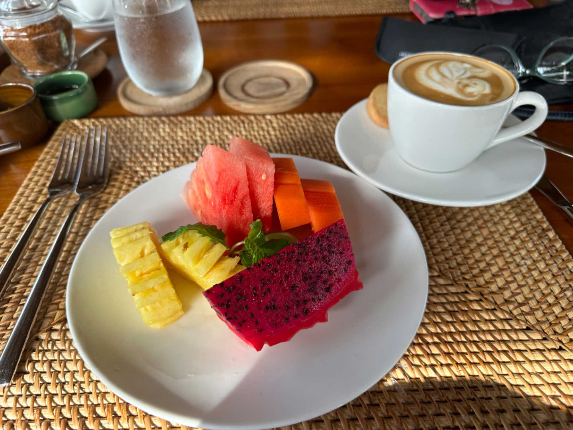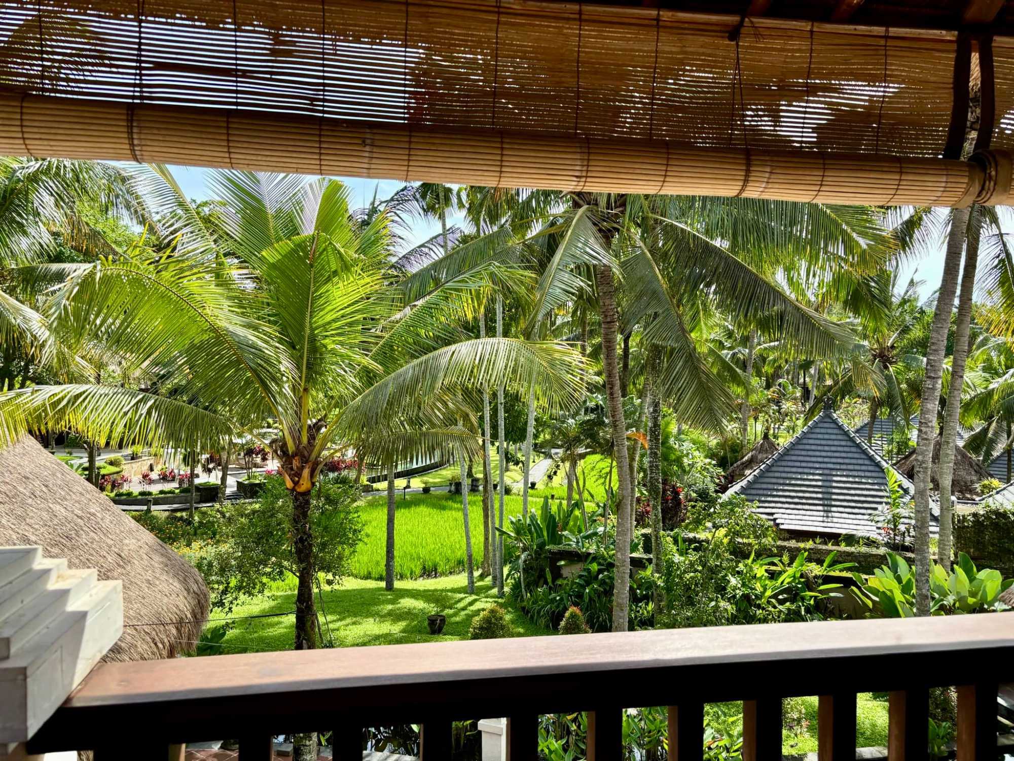 Bonjour, aujourd’hui nous bénéficions d’une journée libre pour s’imprégner de ce lieu tellement calme et apaisant. Plusieurs en ont profité pour faire la grasse matinée. Le déjeuner au deuxième étage du restaurant principal était délicieux. Mon conjoint s’est laissé tenter par un petit jus de curcuma et moi par un kombucha, nous sommes à Bali après tout ! Les fruits exotiques et le déjeuner en entier était savoureux et que dire de la vue sur le complexe et les rizières ! Les voyageurs que nous avons rencontrés sont souriants et bien heureux de leur nuit reposante et oh combien méritée. Il fait très beau et l’humidité est ici bien présente. Est-ce le fait de chercher son mari ou l’humidité qui donne des sueurs à l’une d’entre-nous ?