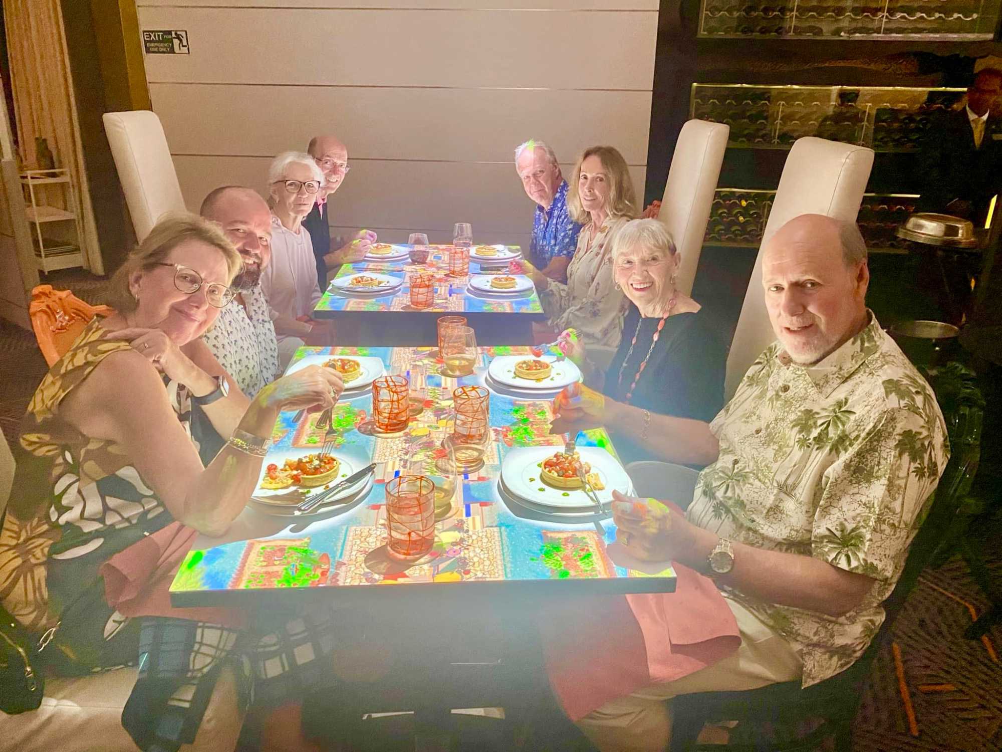 Louise nous avait réservé une belle surprise. Elle a invité le groupe au Restaurant Le petit chef. Cela a été une expérience immersive extraordinaire, il faut le vivre pour comprendre. En fait, un dessin animé est projeté sur nos tables. Cela a ravivé nos cœurs d’enfants. Plusieurs voyageurs ont mentionné qu’ils aimeraient y amener leurs petits enfants pour voir leurs réactions. Tout sourire nous avons dégusté une souper tellement délicieux. Nous avons même entendu que c’était le meilleur bœuf braisé dégusté à vie. Cet excellent souper animé, en bonne compagnie, permet de débuter notre croisière en beauté !