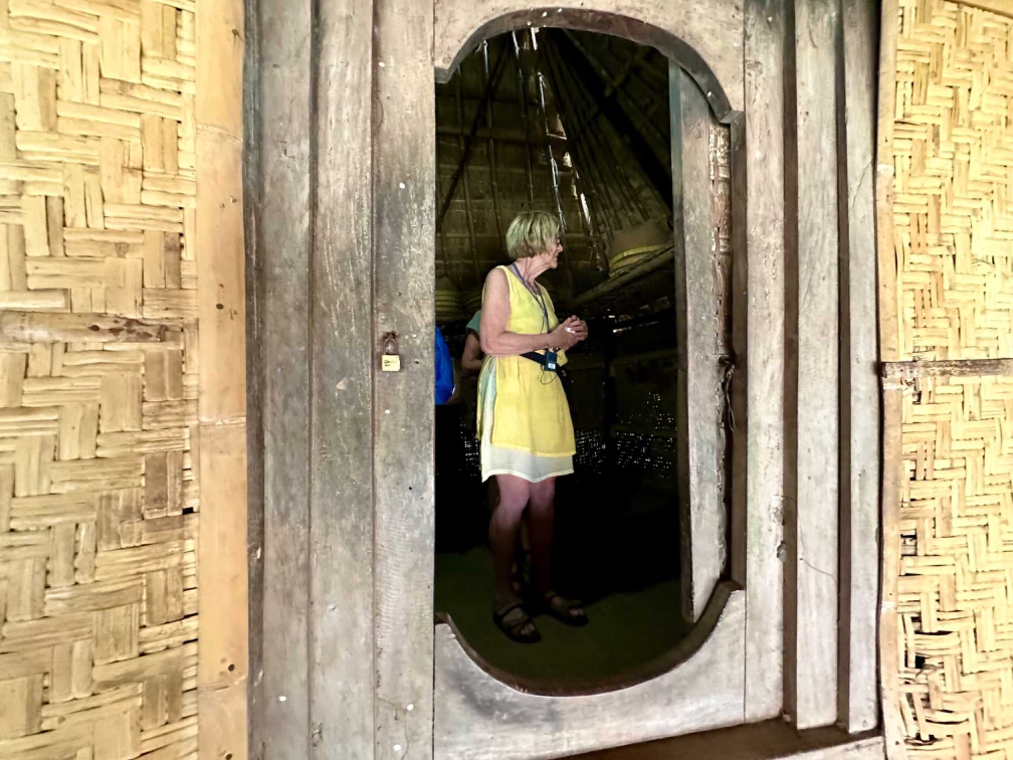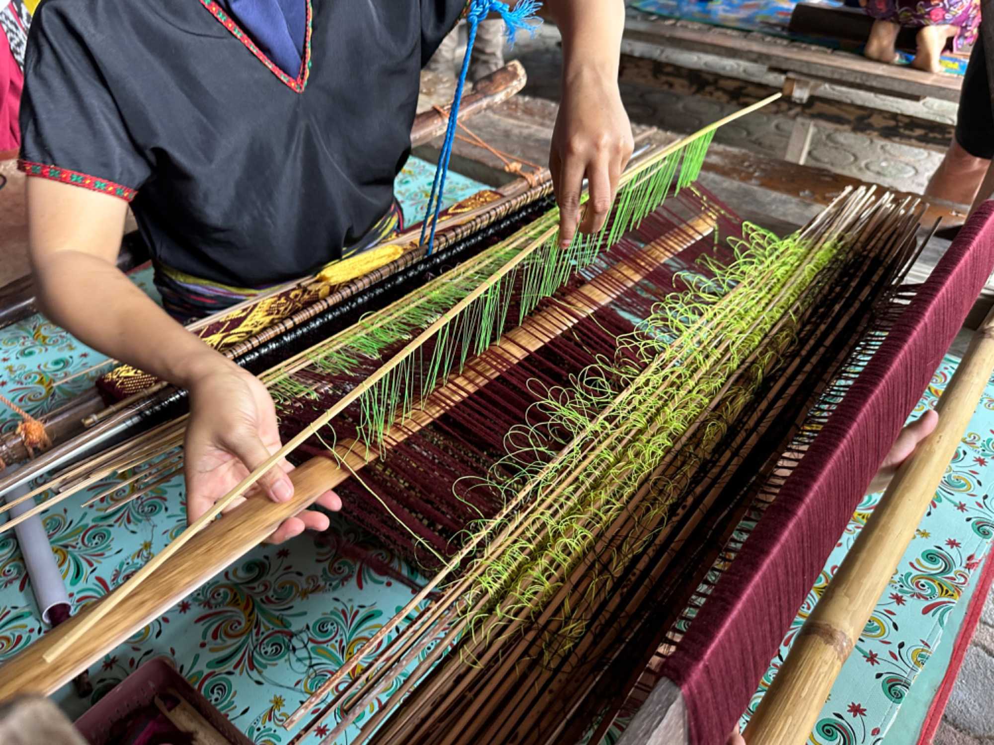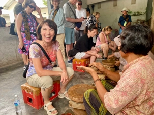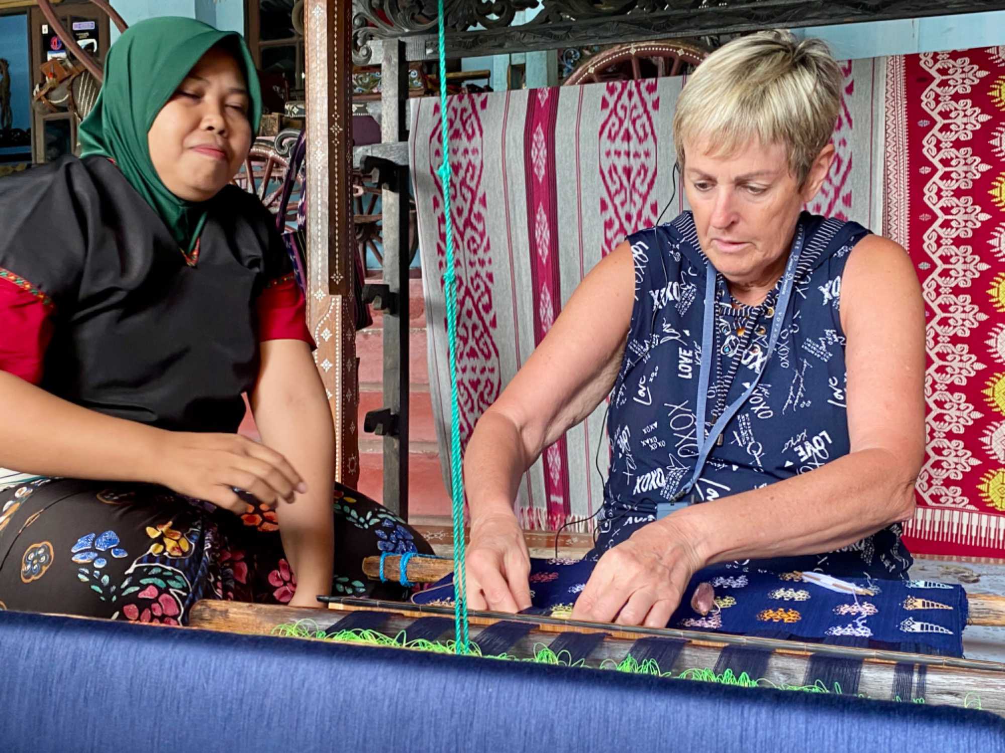 Par la suite, nous nous sommes rendus dans un village où il y avait du tissage. Encore une fois, notre « toujours partante » Danielle a expérimenté cet art traditionnel qui demande énormément de patience. Bernadette s’est aussi laissé tenter. Les femmes ici tissent 8 heures par jours pour fabriquer seulement 10 cm de tissus. J’ai été stupéfaite d’apprendre que les hommes ne pouvaient pas effectuer ce travail. L’on nous a expliqué que les hommes deviendraient impotents. J’étais septique au début, je me disais que les hommes se trouvaient une raison pour ne pas faire ce travail fastidieux. Notre voyageur Dr Louis est donc allé à la source. Il a effectivement confirmé qu’un petit canal très important pour « veiller tard »😀 ( je résume dans mes mots ce que Louis a expliqué scientifiquement ) serait endommagé si l’homme demeurait assis jambes allongées à tisser pendant 8 heures consécutives. C’est du sérieux !