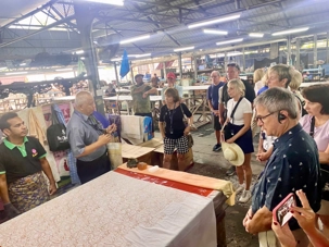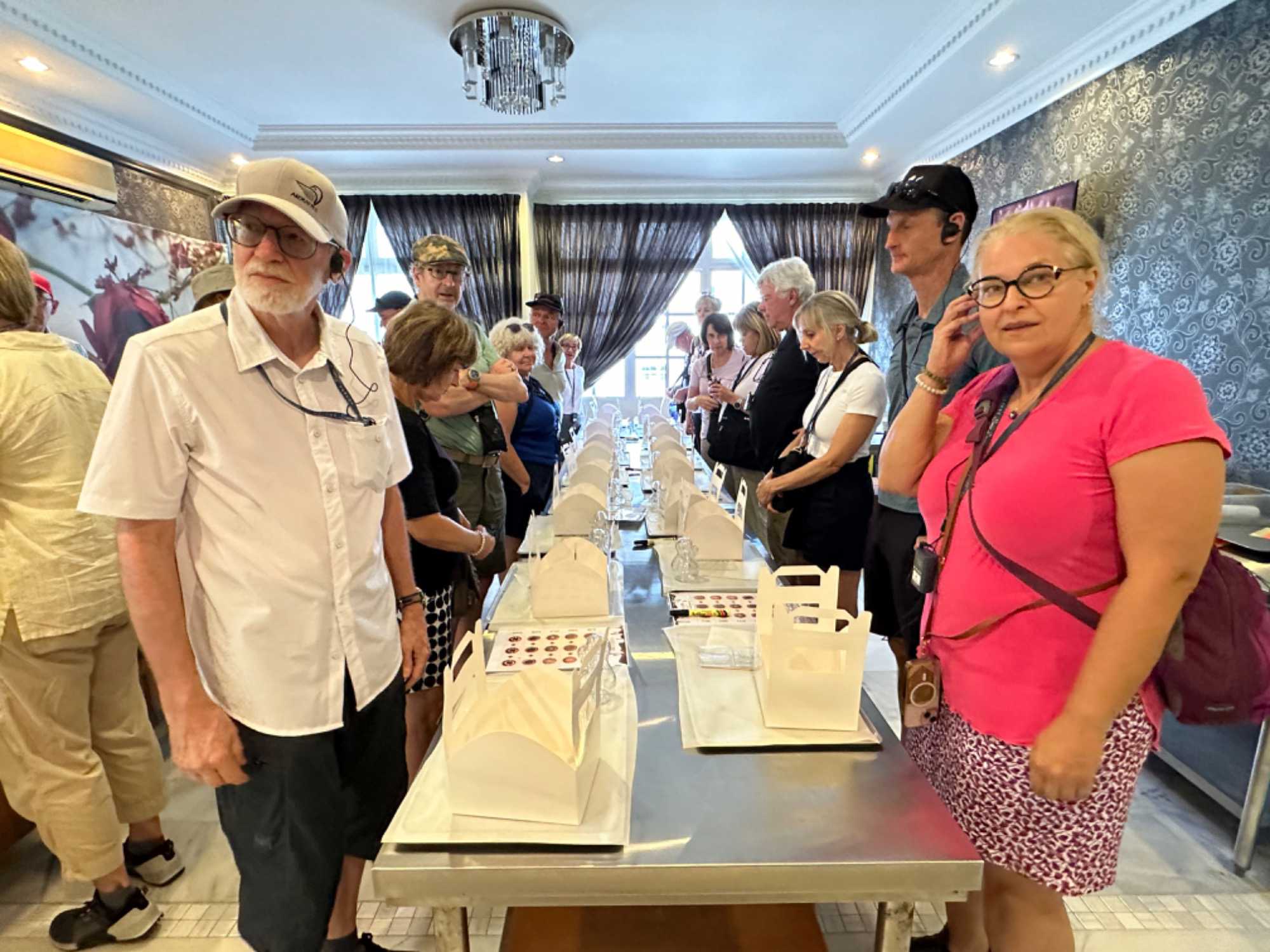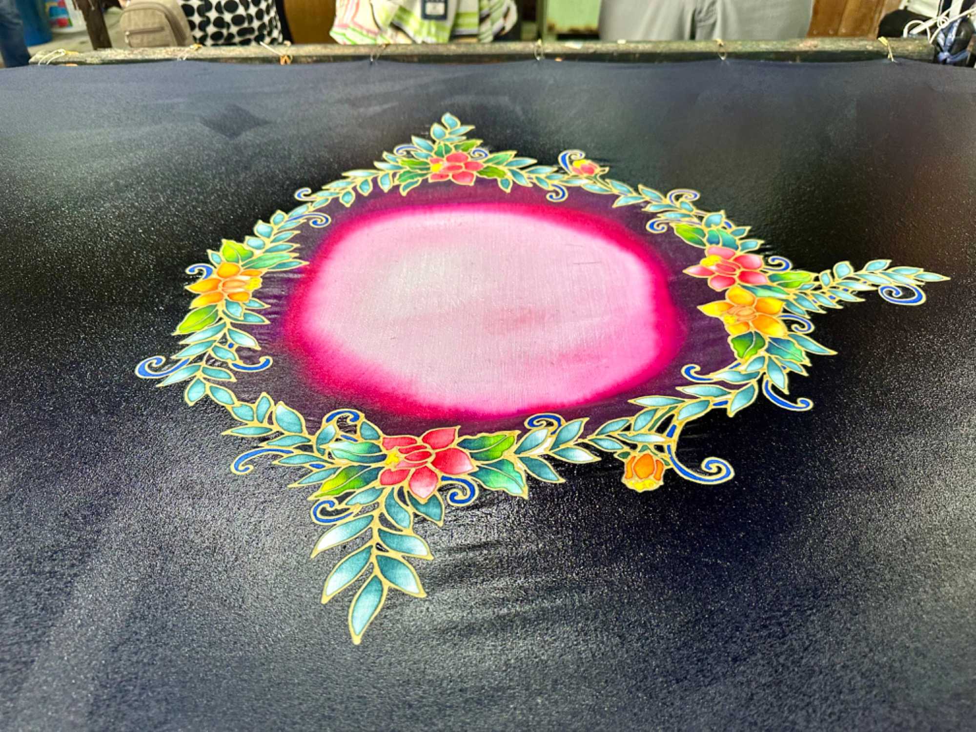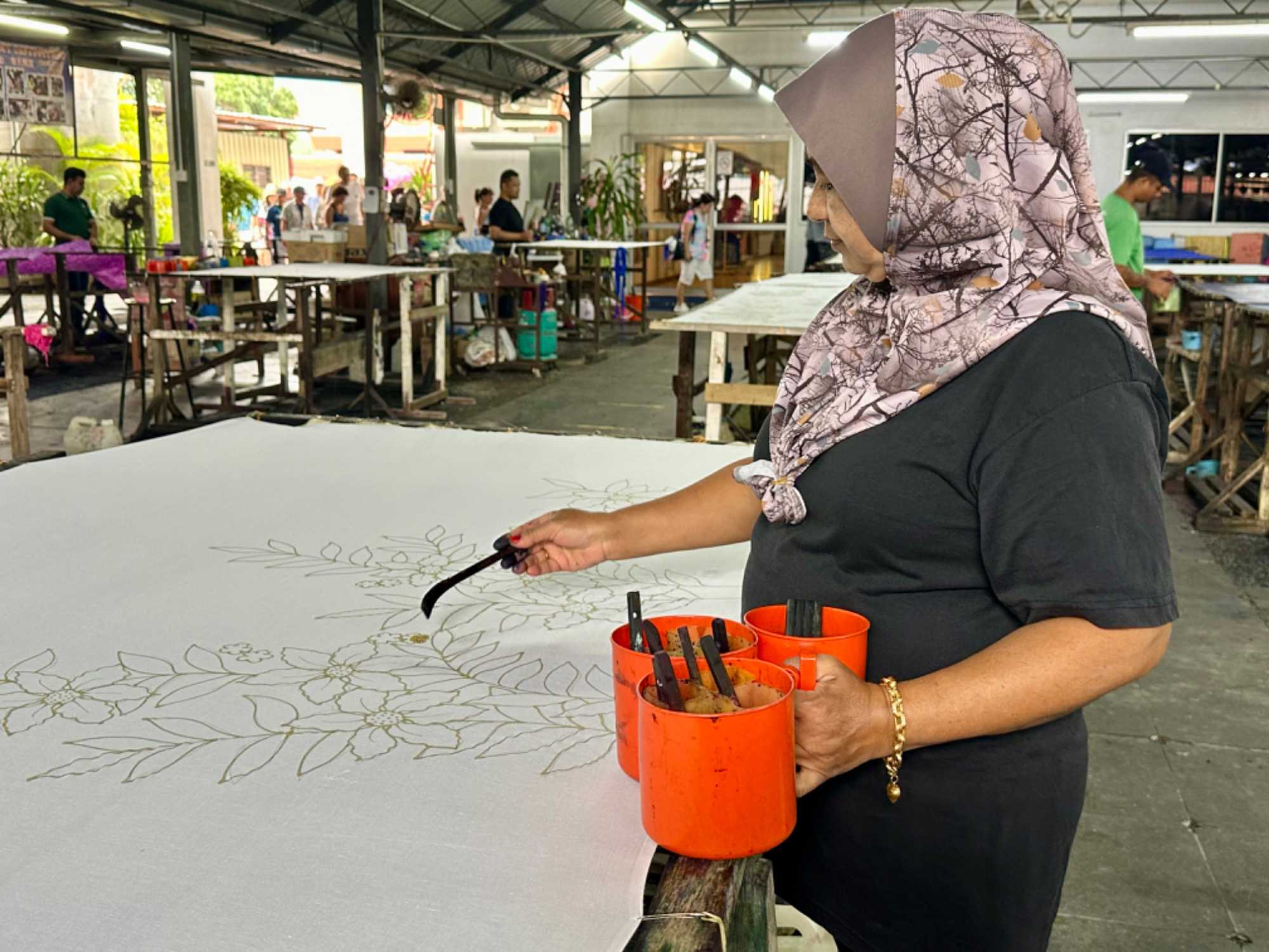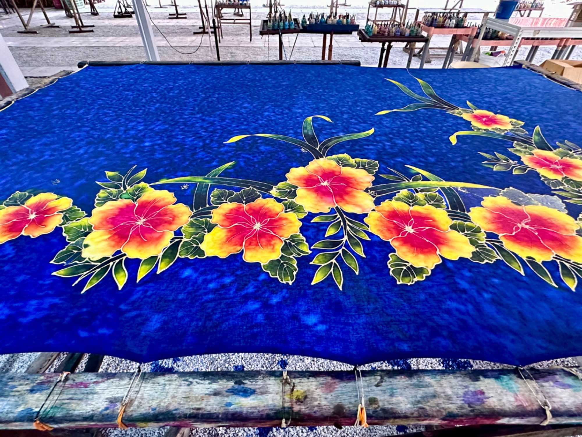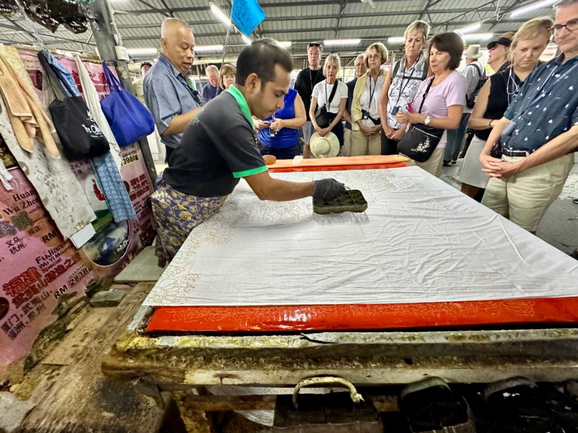 Ensuite, nous nous sommes rendus à l’usine de batik pour voir et apprendre les techniques complexes de production de ce textile malaisien à l’aide de cire et de teinture. Il s’agit d’un travail artistique très méticuleux. L’on nous a expliqué que seulement 3 couleurs sont appliqués. Ils alternent entre l’application de la cire sur les pourtours du dessin et la couleur. Après la visite nous avons pu nous procurer des vêtements ou même des œuvres d’art en batik. Nos voyageurs ont beaucoup de goût.