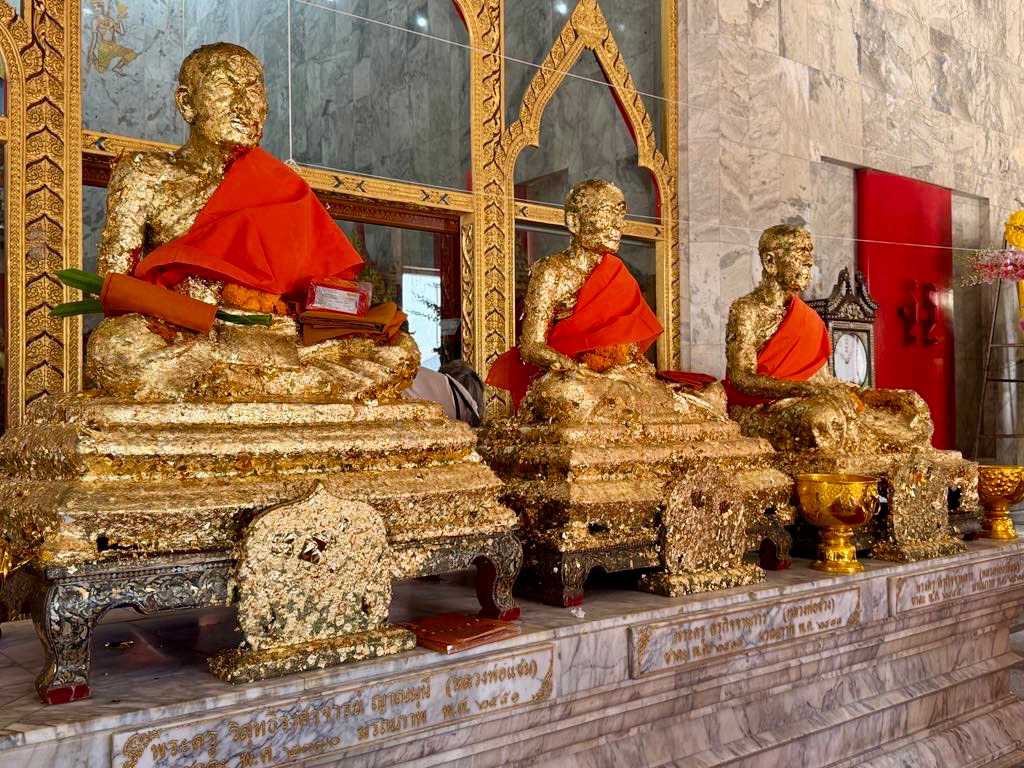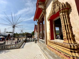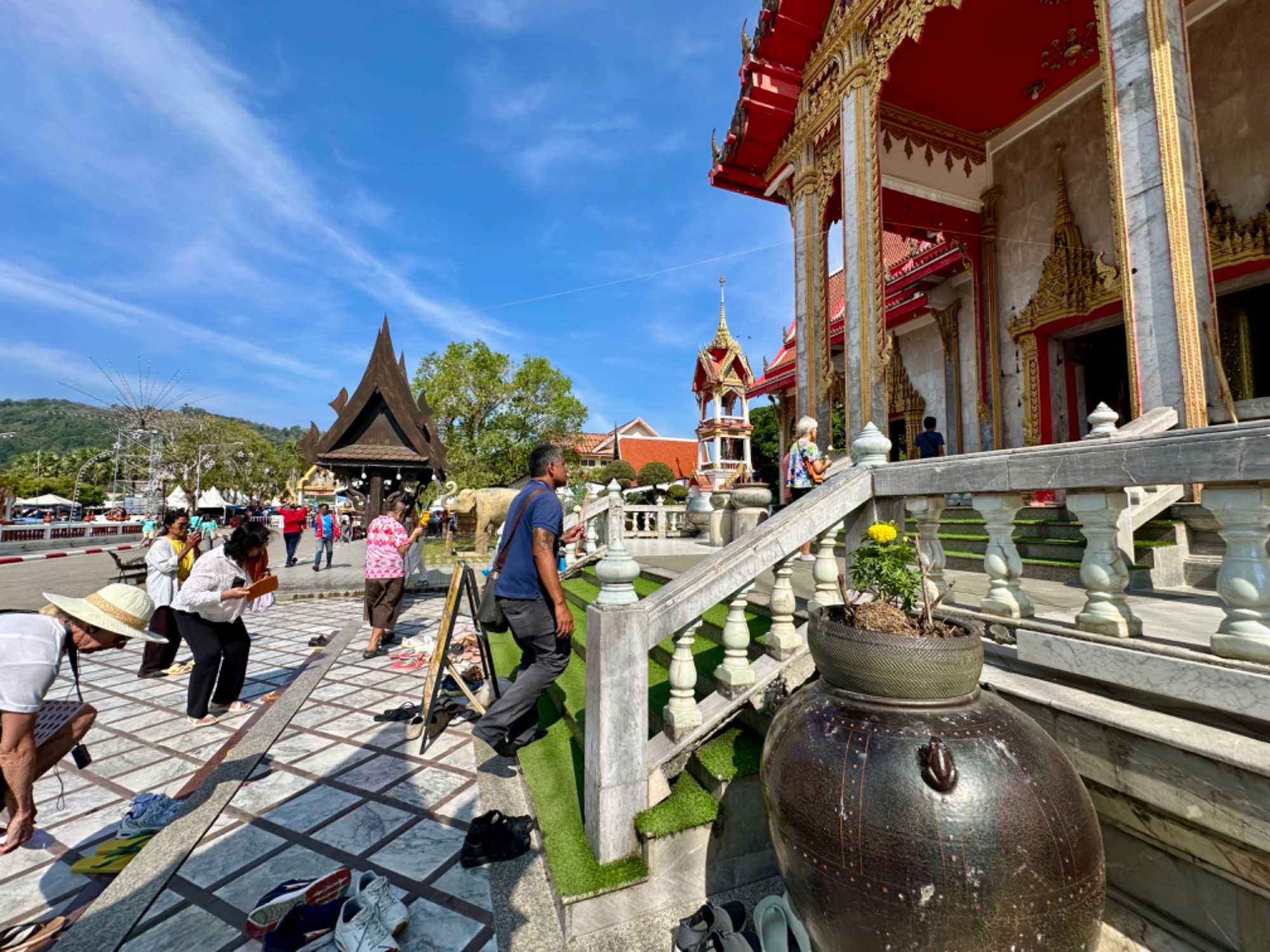 Par la suite, nous avons visité un temple bouddhiste à Chalong. Nous sommes arrivés au moment de la prière. Les bouddhistes prient à chaque demi-lune. Ce superbe temple, le Wat Chaithararam, renommé Wat Chalong par les habitants, est le temple bouddhiste le plus important de la péninsule de Phuket. Construit au 19ème siècle selon l’architecture typique de ses homologues du sud de la Thaïlande, la plupart des habitants de l’île s’y réunissent pour prier et faire des offrandes au Buddha. Des vestiges plus anciens ont été découverts mais leur ancienneté n’a pas été identifié. C’est un lieu culturel incontournable et l’une des attractions phare de la région. Comme dans tous les temples bouddhistes de Phuket, il est nécessaire d’adopter une tenue appropriée pour visiter le Wat Chalong de Phuket et nous avions été avisés. Pour les femmes, les épaules et les jambes doivent être couvertes, au minimum jusqu’aux genoux. Les hommes devront adopter une tenue respectueuse mais les règles sont moins strictes. Les chaussures ne sont jamais autorisées à l’intérieur et nous devions les enlever avant d’entrer dans chaque bâtiment religieux.