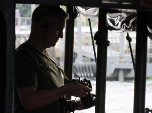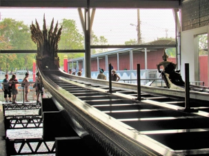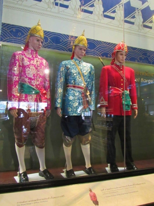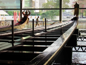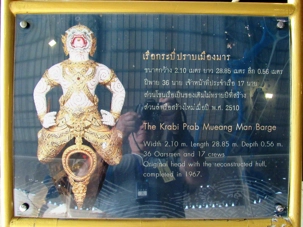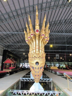 Nous avons le privilège d’une promenade en petit bateau pour visiter les impressionnantes barges du roi. Nous voilà à nouveau en admiration devant tant de beauté, tant de précision dans l'art de construire ces bateaux, faits entièrement en Thaïlande. Nous sommes donc montés à bord d'un bateau à longue queue pour nous diriger vers le musée des Barges Royales. Quel beau musée mais il est difficile de photographier les bateaux dans toutes leur longueur. Le plus long mesure 164 pieds et demande un équipage de 50 rameurs + 7 pilotes et 2 navigateurs ainsi qu'un marin s'occupant du drapeau et un pour maintenir le rythme. Les barges sortent une fois par année pour la fête du roi mais peuvent aussi sortir lors d'évènements spéciaux. Situé sur le canal Bangkok Noi, près du fleuve Chao Phraya et non loin du pont Phra Pinklao, ce musée expose plusieurs barges royales ornées de sculptures et décorées de motifs uniques. Autrefois des vaisseaux de guerre, ces embarcations servent aujourd'hui lors des célébrations royales et des cérémonies officielles.