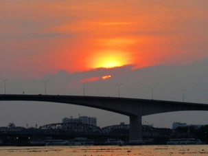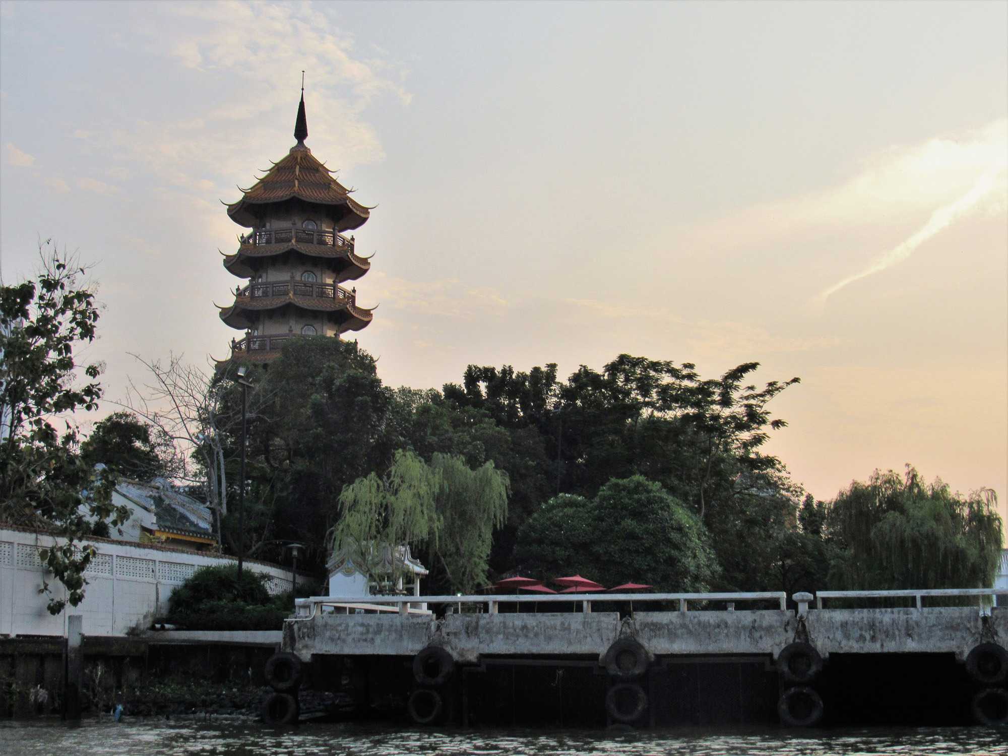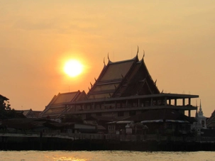 Notre promenade sur le Chayo Praya nous a permis de voir l'ampleur des dégâts subis il y a quelques années, durant la grande inondation à Bangkok. Plusieurs ont quitté leur demeure ou bien la rénovent encore. Nous sommes passés devant le temple du Wat Arun ou bien le temple de l'aube que nous avons photographié au coucher du soleil. Très belles photos de ce site impressionnant. Construit au 19e siècle par le roi Rama I il est situé sur la rive du Chayo Praya à Thonburi, l'ancienne capitale. La tour de style Khmer (birman) est d'une hauteur de 269 pieds de haut et a été construit au milieu du 19e siècle.