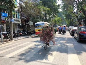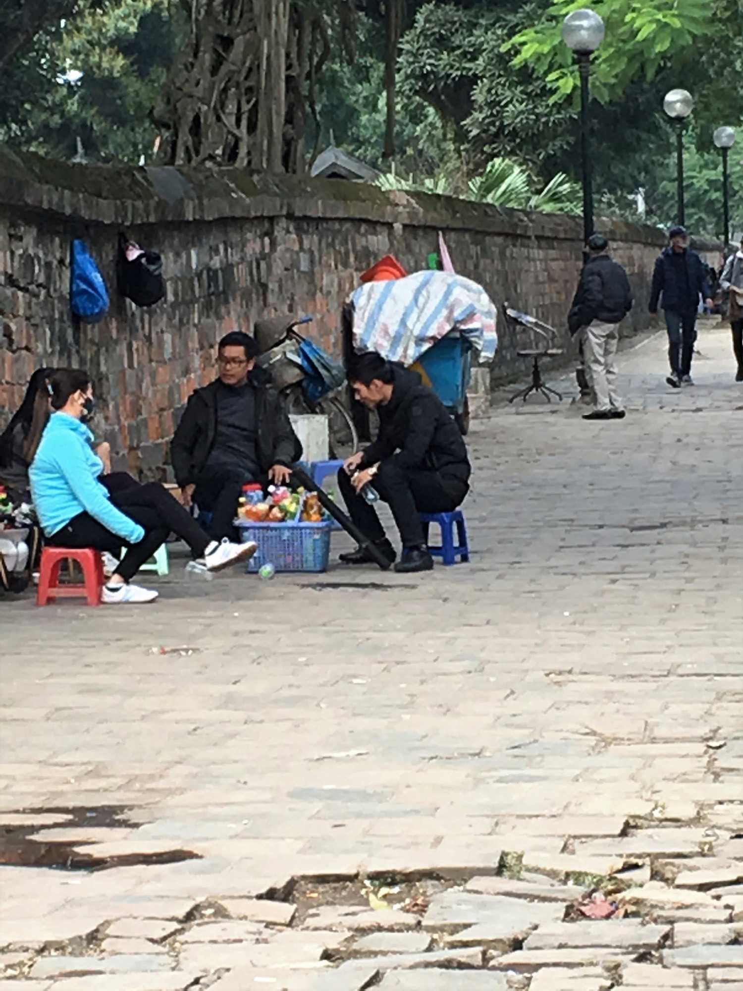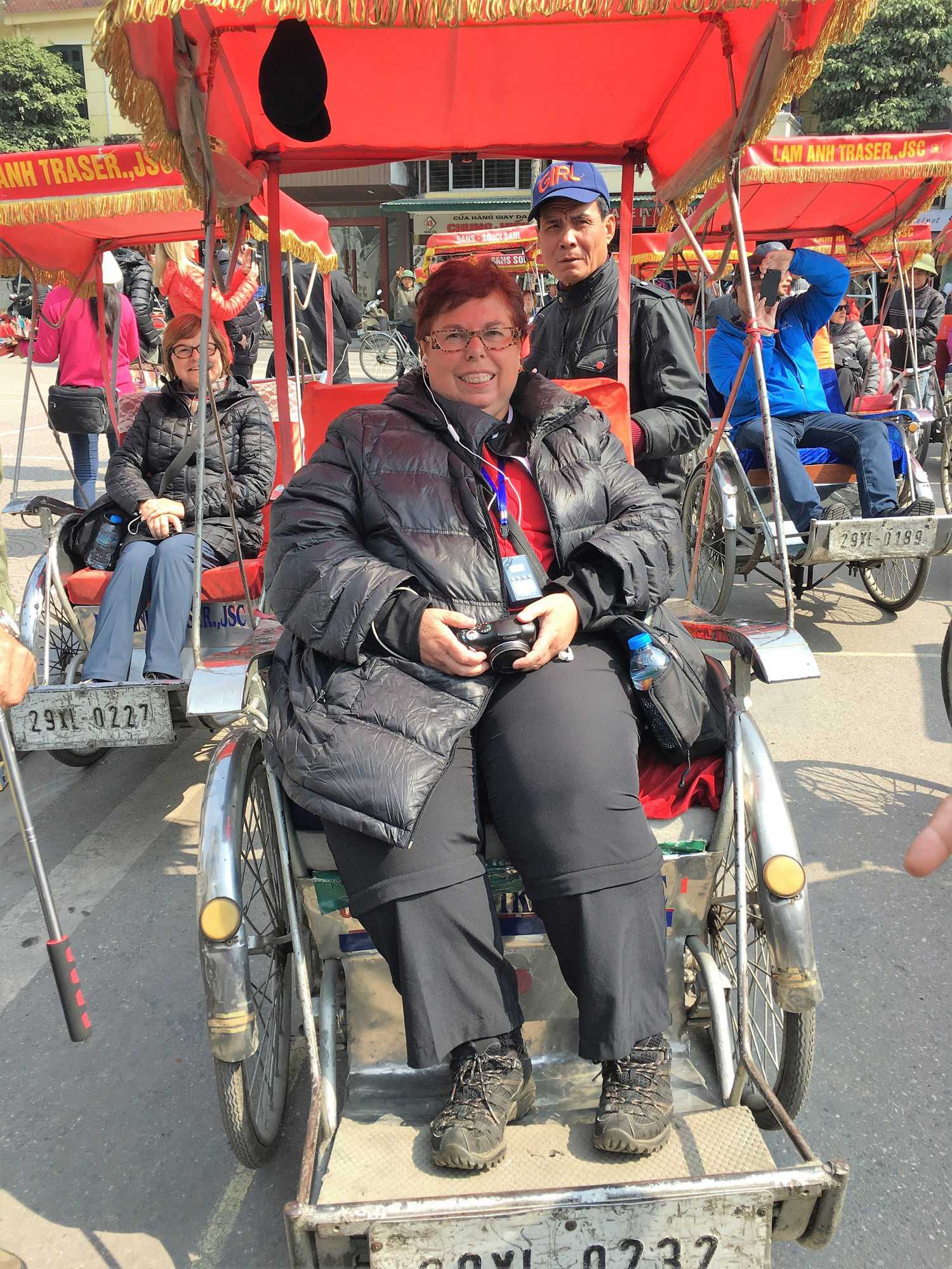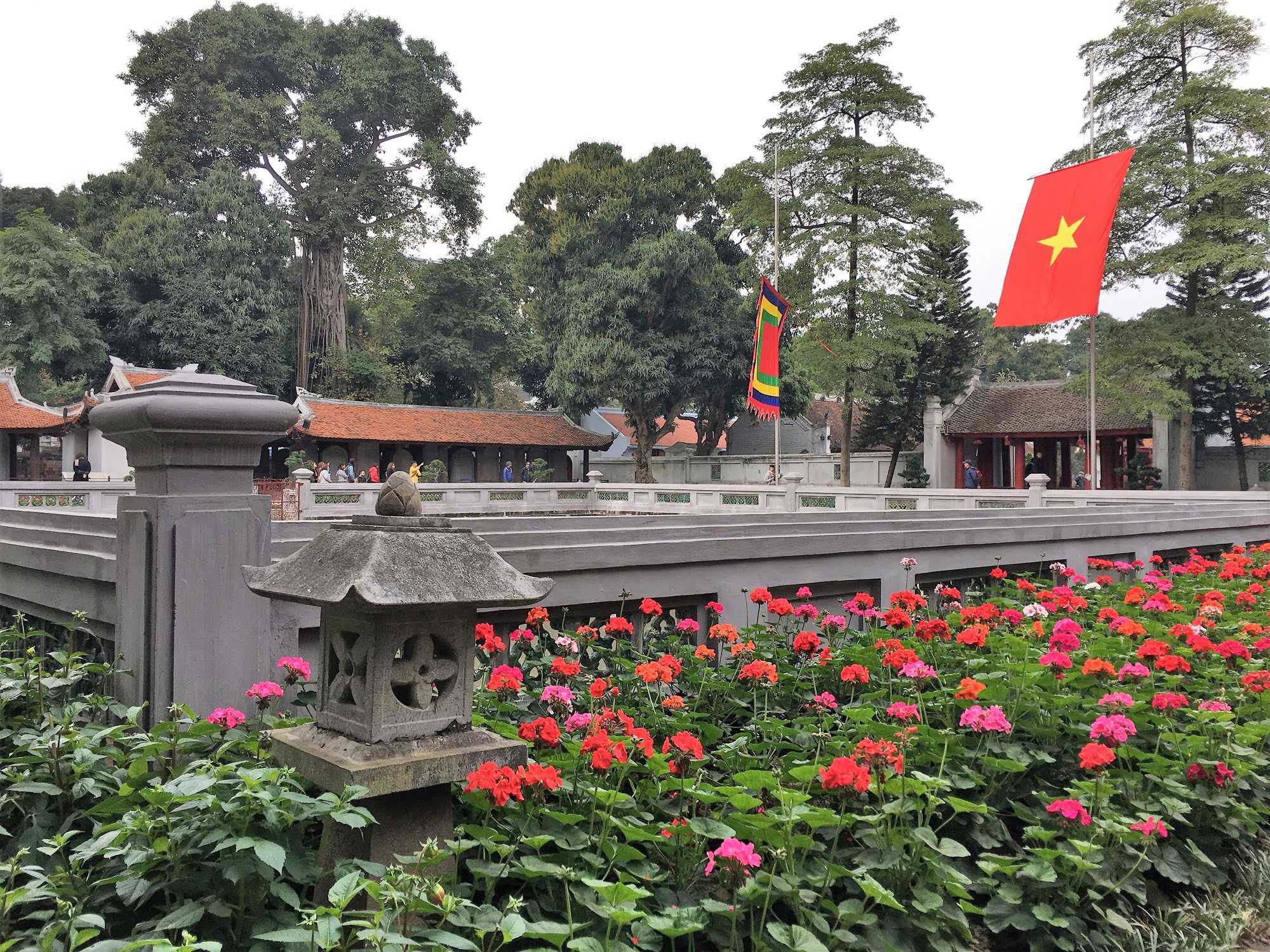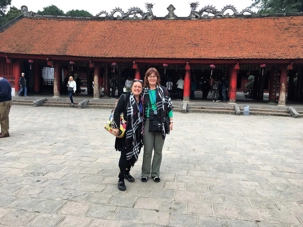 Ensuite, nous nous dirigeons vers le Temple de la littérature. Malgré la modernité de la ville, les cyclopousses et lieux sacrés sont toujours présents. Le Temple est encadré par de magnifiques jardins où nous marchons un peu. Nous photographions des jardiniers qui s’affairent à planter des poinsettias pour la fête du nouvel an qui approche, le 16 février. Nous avons même photographié aujourd’hui un arbre important pour cette fête, le pêchier en fleur dans la boîte d’un camion. Nous on se promène avec nos arbres de Noël et eux avec leur pêchier.