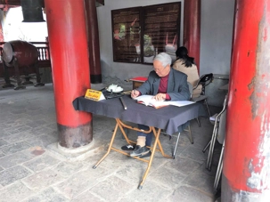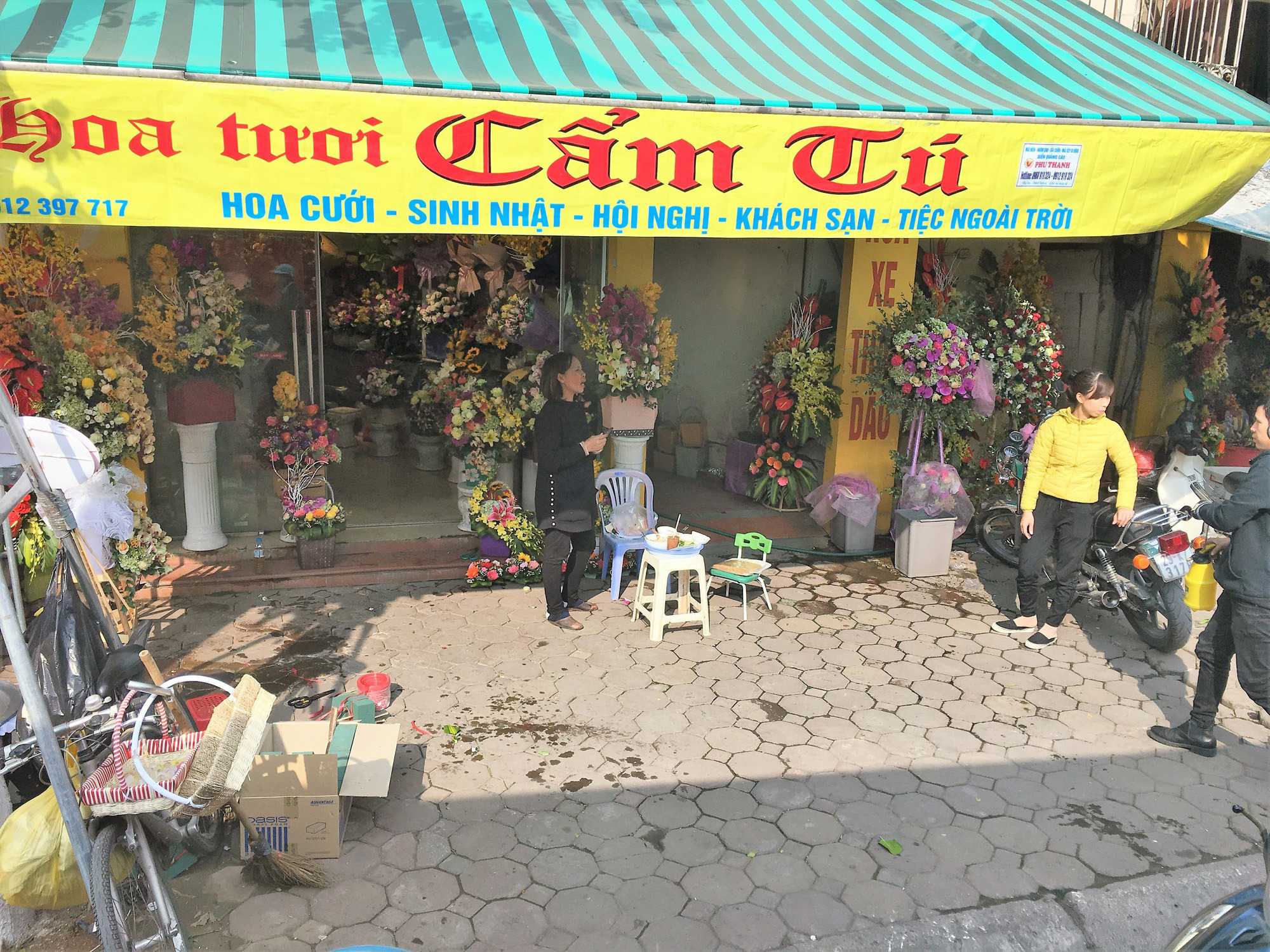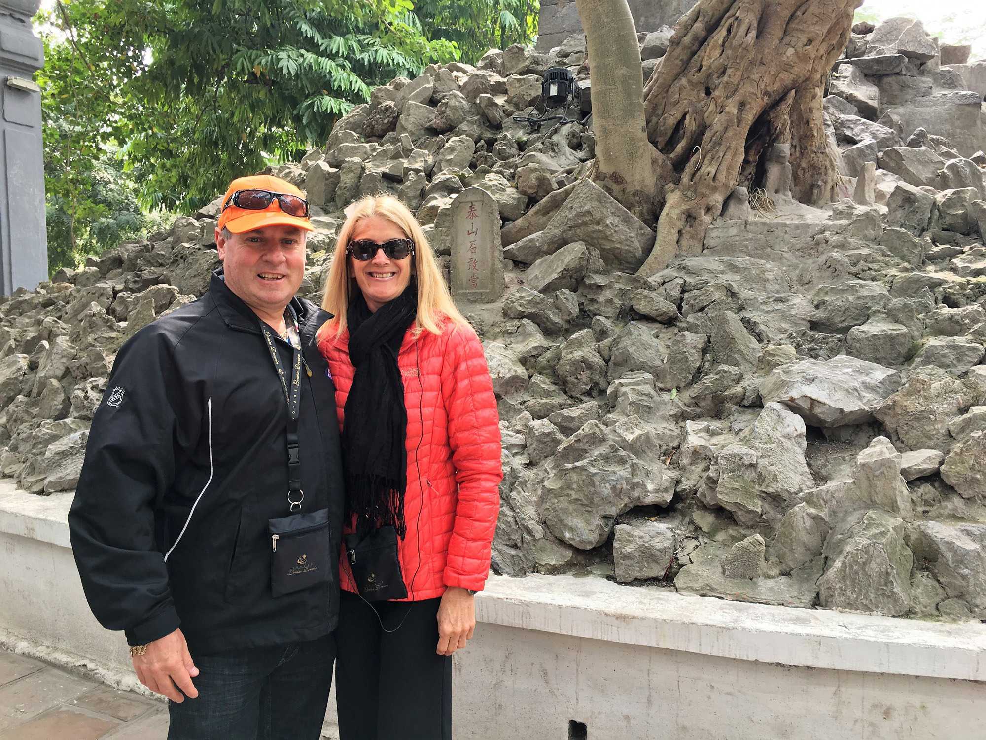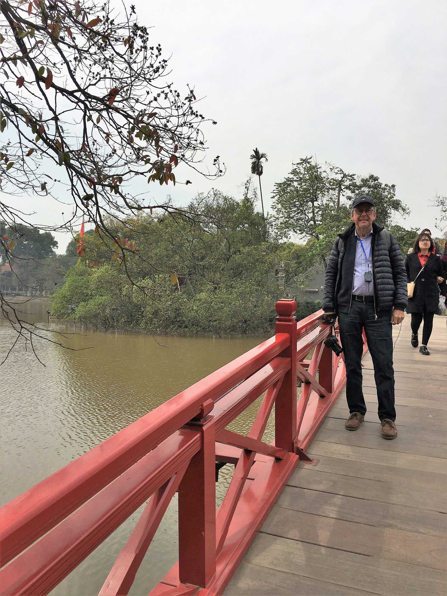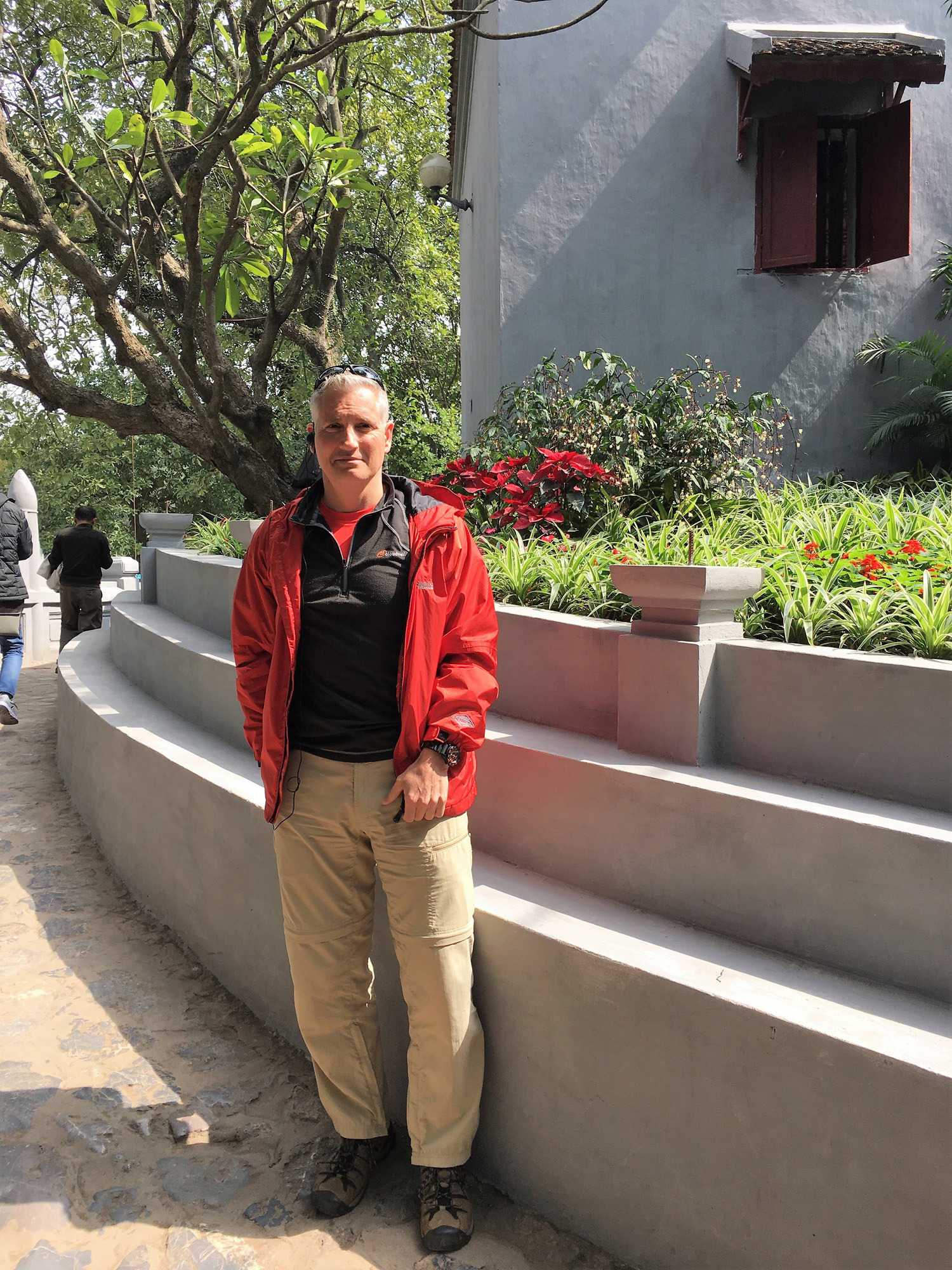 Ensuite, nous nous dirigeons vers le Temple de la littérature. Malgré la modernité de la ville, les cyclopousses et lieux sacrés sont toujours présents. Le Temple est encadré par de magnifiques jardins où nous marchons un peu. Nous photographions des jardiniers qui s’affairent à planter des poinsettias pour la fête du nouvel an qui approche, le 16 février. Nous avons même photographié aujourd’hui un arbre important pour cette fête, le pêchier en fleur dans la boîte d’un camion. Nous on se promène avec nos arbres de Noël et eux avec leur pêchier.