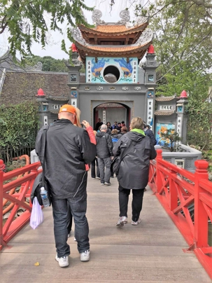 Nous débutons notre visite, à pied, en direction du lac Hoan Kiem. Foule, klaxons, bruits…il faut être faits forts pour vivre ici!! Notre guide, pas stressé du tout nous assiste dans notre traversée des intersections… la chose à ne pas faire est de changer de rythme lorsque nous traversons les rues ce qui veut dire ne pas courir surtout ou ne pas s’arrêter brusquement. Les vietnamiens évaluent notre traversée et nous évitent sans problème. C’est à voir ou à vivre! Nous voici donc arrivé au lac Hoan Kiem, que l’on appelle aussi Lac de l’Épée restituée sis en plein cœur de la ville. Malgré que le rythme de la ville tout autour soit très dynamique, ici, le calme règne. À l’entrée, les mêmes animaux, gages de longévité et protection, nous accueillent : dragon, phœnix, tortue et lion, pour la force.