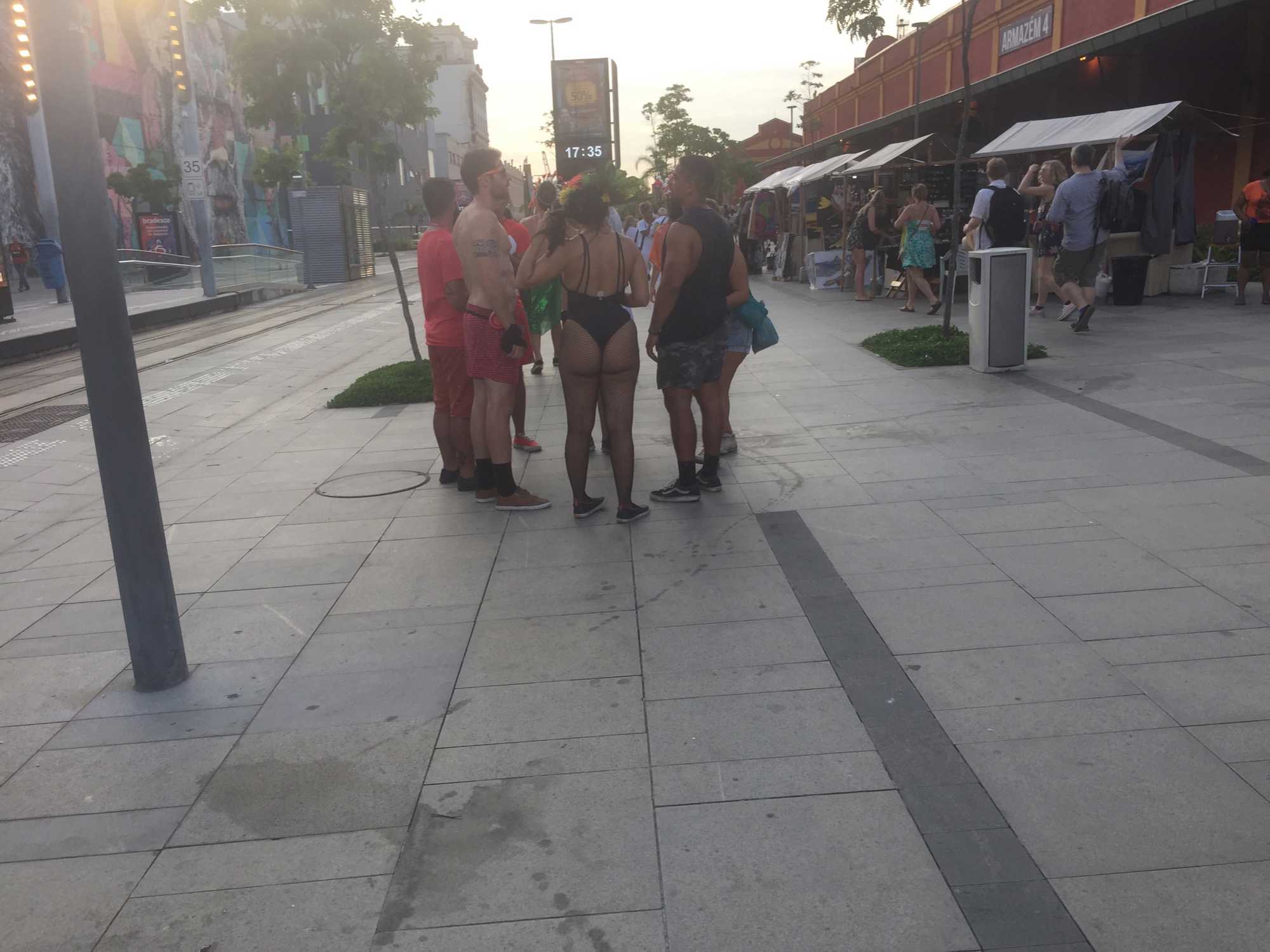 Mais il faut vous dire que la soirée ne commençait pas de bon augure... Un gros orage, avec tonnerre et éclair s'est mis de la partie vers 18h, l'heure de notre départ. Voyant cela, et sachant que nous n'avions pas d'endroit pour nous protéger de la pluie au Sambodrome, nous avons préféré retarder notre départ. Vers 20h, finalement, la pluie a presque arrêtée et nous sommes partis vers le Sambodrome. Nous avons trouvé nos sièges réservés facilement, lesquels étaient tout mouillés étant donné que ce sont des gradins à ciel ouvert. J'ai fini par dénicher des coussins pour s'asseoir dessus, ce qui a grandement contribué au confort de tous. Nous avons constaté très vite que bien que nous ayions des sièges réservés, tout le monde est debout pour regarder la parade. Nous nous reposions entre les défilés de samba. Tout les brésiliens connaissaient les paroles des chansons, ça dansait allègrement, c'était vraiment beau à voir. Dans chaque défilé, il y avait au moins 40 costumes différents avec au moins 100 personnes par groupe: tout un festival de couleurs. Les chars allégoriques étaient énormes... on les a revus dans les rues de la ville aujourd'hui... il faut bien les entreposer quelque part! Nous avons eu encore un peu de pluie pendant les parades, mais sans vraiment nous déranger. Avec le transport que nous avions, chaque personne pouvait revenir à l'heure qui lui convenait. Nous avions des "escortes" pour revenir au navire. Je ne pensais jamais revenir si tard au navire! Et bien imaginez-vous que Marcelle, Lise et Mathieu ont voulu rester pour voir les 5 premières parades et comme il y avait un retard d'environ 2h (dû à la pluie?), nous sommes revenus au navire alors que le soleil se levait, à 5h50 du matin. Ils sont en forme mes voyageurs!