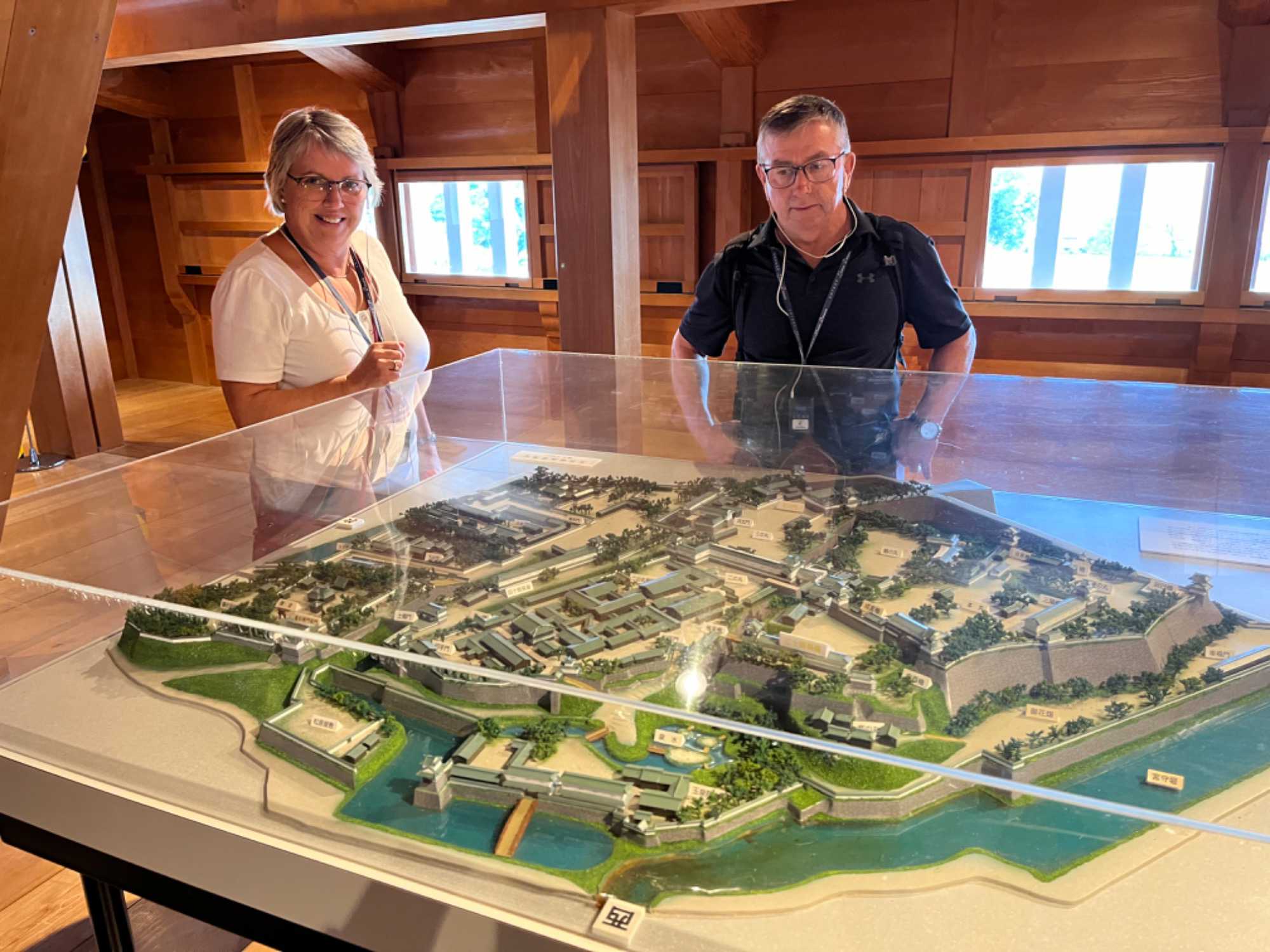 Nous avons le privilège de pénétrer dans un édifice en bois restaurés. La tourelle Hishiyagura, l’entrepôt Gojukken Najaya et la tourelle Hashizumemon Tsuzuki nous dévoile des objets et des maquettes retraçant les diverses techniques architecturales utilisées lors de leur restauration. Du haut de ces tourelles, les étroites fenêtres nous offre une vue imprenable sur le parc du château, ses douves et le jardin en contrebas, nous transportant dans l’atmosphère de la défense autrefois menée depuis ces hauteurs.