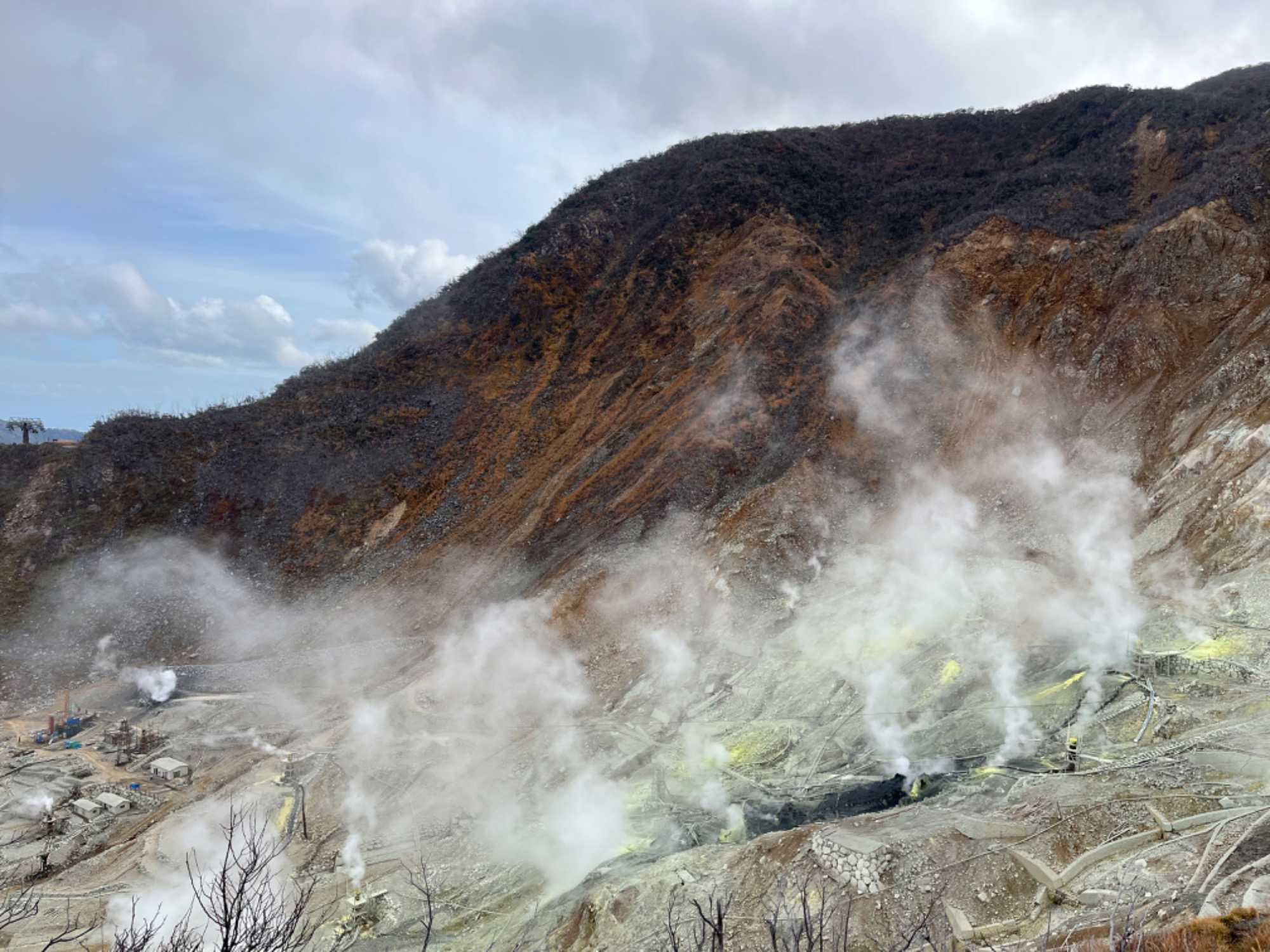 Le paysage est absolument magnifique ! Il a été créé suite à la dernière éruption du mont Hakone, il y a de cela environ 3 000 ans. Située autour du cratère de ce volcan, Owakudani est une zone volcanique active où l’on peut trouver et admirer des sources et des rivières chaudes d’où émanent d’impressionnantes vapeurs sulfureuses. Ce sont ces éruptions de souffre et l’odeur prenante des lieux qui en font sa renommée. Owakudani est sur les hauteurs d’Hakone près des sources chaudes sulfureuses. Dans le centre touristique il y a une boutique qui vend des œufs noirs cuits dans les sources chaudes de la vallée volcanique. Cette couleur particulière qui fait la renommée de ces oeufs durs est dû au fait que les coquilles sont noircies par le soufre des sources d’Owakudani lors de la cuisson. Une légende locale dit que manger ces oeufs noirs prolongeraient la vie de sept ans !