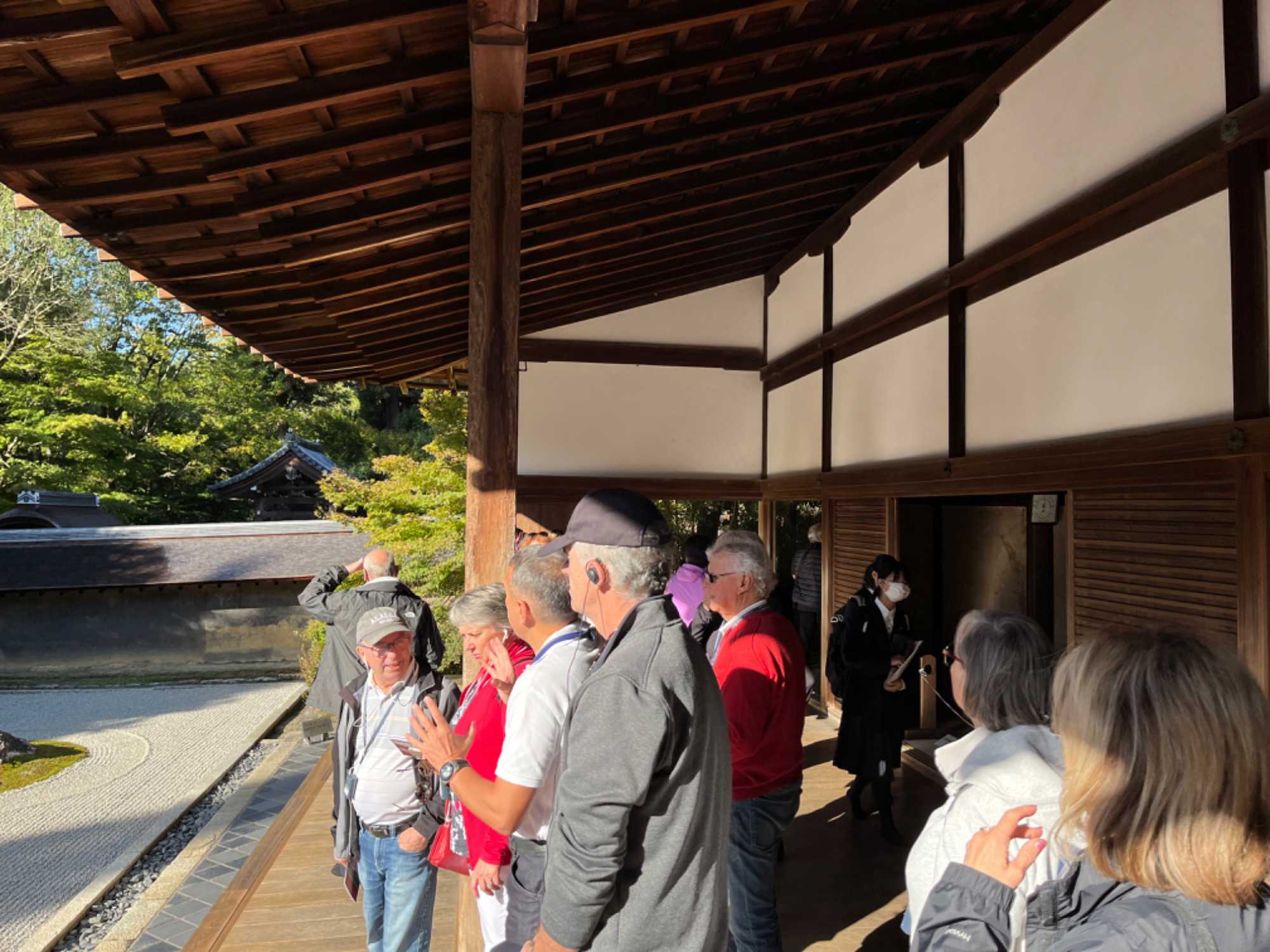 Le Ryoanji est un jardin où l’on jumelle esthétisme et simplicité. Conçu il y a plus de 500 ans, probablement par un moine qui pratiquait la philosophie Zen, pour éliminer la possession matérielle et encourager l’élévation spirituelle de l’âme. Le jardin de rocaille de Ryōan-ji, un élément du patrimoine culturel japonais, est sans doute le plus populaire de ce type de jardin à Kyoto. Ce jardin, d’une simplicité trompeuse, se compose de quinze rochers étalés sur du sable blanc dans un espace de 248 mètres carrés. Les quinze rochers sont soigneusement disposés de manière à ce qu’il y ait toujours au moins un rocher « non visible », quel que soit l’angle de vision. Le jardin a probablement été construit à l’époque de Muromachi (fin 14 ème - 16 ème siècle). La signification voulue du jardin n’est pas claire et les théoriciens ont interprété le jardin de différentes manières. L’une des théories les plus populaires est que le jardin montre un tigre portant ses bébés à travers l’eau, tandis qu’une autre théorie est que les rochers épellent le caractère chinois « cœur ». Un endroit qui nous propulse dans la 4ième dimension, celle de la face cachée de la pierre ! Tous sont ébahis de voir ce petit jardin du 16e siècle. Cet aménagement, appelé un jardin sec, rappelle aux pratiquants de la philosophie zen qu’il y a toujours une face cachée à tous parmi ce qui nous entourent. Le tout bien encadré par un paysage remplis d’érables colorés. La remarquable mousse cultivée autour du temple présente un tapis verdoyant. À l’origine, le temple Ryōan-ji était la villa d’un aristocrate pendant la période Heian, mais il a été converti en temple zen en 1450 par Hosokawa Katsumoto, qui était un chef de guerre de premier plan dans le shogunat d’Ashikaga. Bien que le jardin de rocaille de Ryōan-ji soit à l’honneur, le temple offre d’autres joyaux tels que l’étang Kyōyōchi dans son jardin de loisirs de style résidentiel, ainsi que les magnifiques peintures et artefacts du quartier. En 1994, ce temple a été désigné site du patrimoine mondial de l’UNESCO.