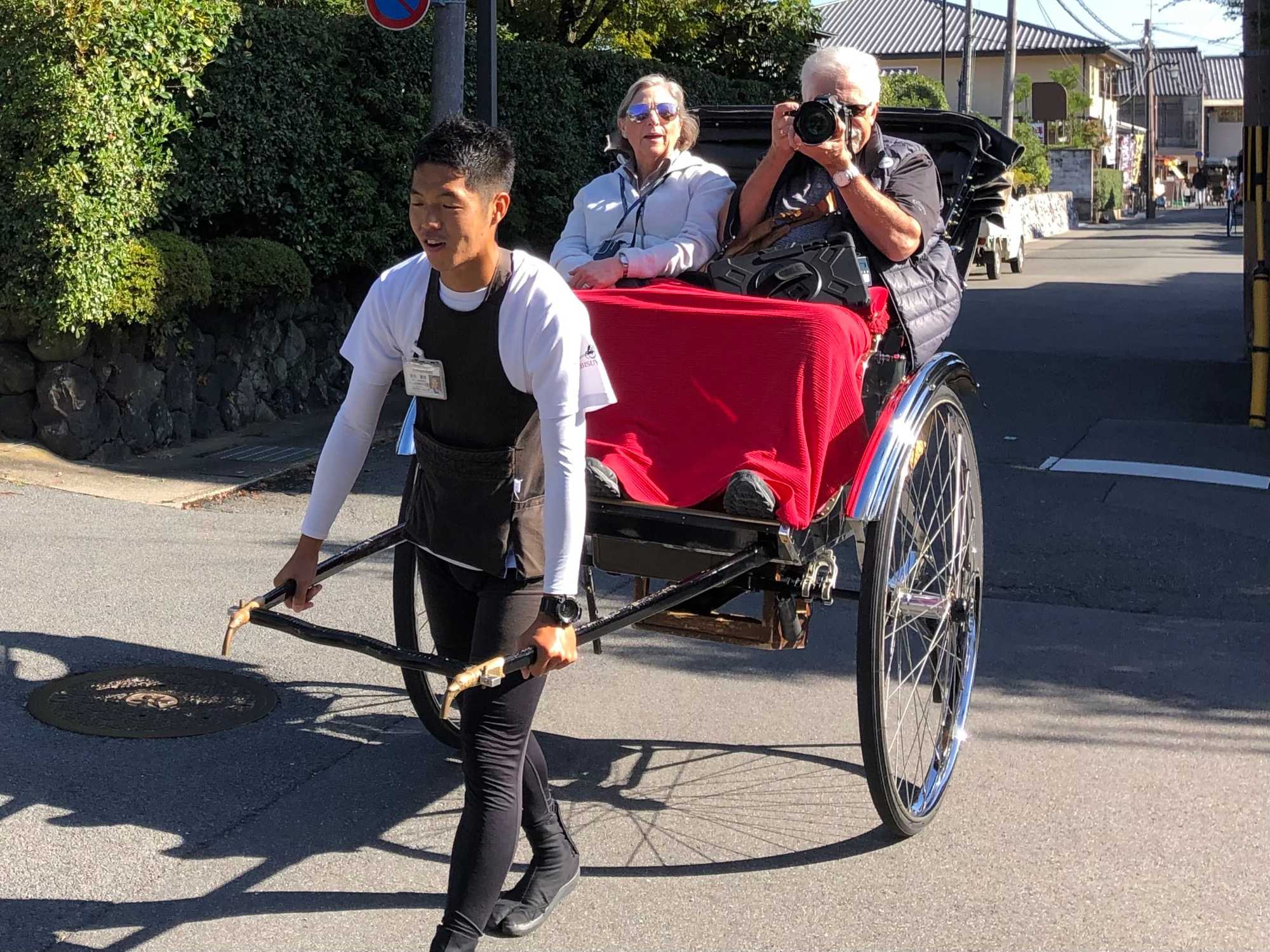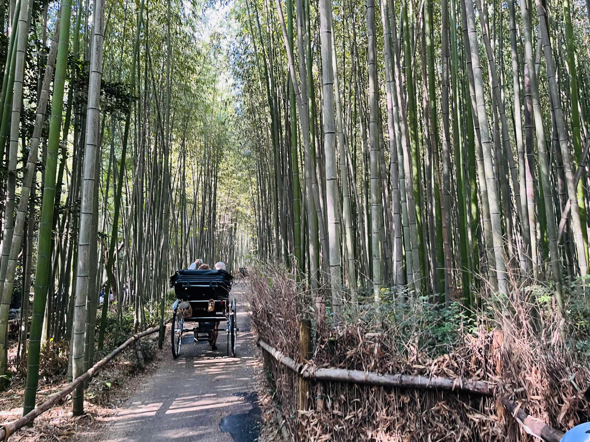 Ensuite, nous nous dirigeons vers la très célèbre forêt de bambous. On nous entraîne le long du chemin réservé aux pousses-pousses uniquement, à l’écart des autres visiteurs. Nous préparons nos appareils photos. Nous pouvons prendre de superbes photos avec le magnifique bambou vert en arrière-plan. Le coup d’œil demeure magnifique et impressionnant. Les différentes nuances de vert créent une profondeur apaisante. La forêt de bambou d’Arashiyama est la plus connue du Japon et elle est également très célèbre à travers le monde entier. Elle est également surnommée Bambouseraie de Sagano, car elle est située dans la forêt de Sagano. Lorsque le vent souffle, il crée une ambiance sonore unique en écoutant les bambous se cogner les uns les autres. Se retrouver au milieu de ces gigantesques arbres est impressionnant et offre un cadre magnifique. Le chemin se rétrécit de plus en plus. Les bambous, hauts de plusieurs dizaines de mètres, se dressent devant nous et laissent passer juste un filet de lumière du soleil. Aux endroits les moins denses, nous pouvons apercevoir le ciel, nous avons eu la chance d’avoir un beau ciel bleu et la vue est également d’autant plus appréciable. Le bambou est un symbole de longévité, de jeunesse, de prospérité et de force. Dans la croyance japonaise, il serait capable de repousser les mauvais esprits et les ondes négatives et pourrait également porter chance. Tant d’effets pour cette plante qui devient au final un véritable porte-bonheur.