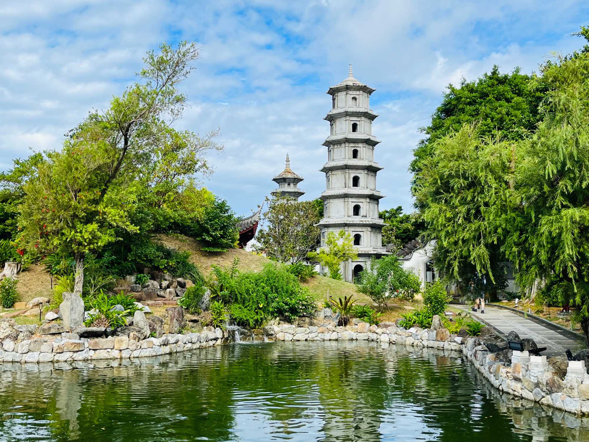 Au premier abord, le jardin semble petit mais il est composé d’un grand plan d’eau dans lequel cohabitent tortues et poissons en tout genre, de plusieurs cascades et d’allées pavées entourées de végétation provenant de la région de Fuzhou. Tout ceci divisé en 4 parties représentant les 4 saisons : Printemps, Été, Automne, Hiver. En plus de flâner au milieu des arbres et des différentes sculptures et bâtiments, nous avons la possibilité d’acheter de la nourriture pour appâter tortues et poissons. Ce jardin est un véritable havre de paix au milieu du tumulte de la ville de Naha. Les japonais ont un réel sens de la méditation et du calme. Le couloir de Lingbo longe le bord de l’eau avec un observatoire attenant. La vue panoramique depuis l’observatoire représente le paysage printanier de la rivière Min en Chine. La forme ronde du pavillon est une réflexion sur l’importance d’un caractère bien équilibré. Entouré de belles eaux et de fleurs printanières, cette région représente le printemps en pleine floraison. Le pavillon Pin et Bambou est un demi-pavillon entouré de murs avec des fenêtres décoratives. L’ombre des banians et l’arôme des arbres de bois de santal blanc évoquent l’été de Fuzhou. Le San You Zhai est une petite étude entourée d’une zone boisée de pins, de bambous et de pruniers utilisés dans les techniques d’aménagement paysager traditionnelles chinoises évoquant une sensation hivernale caractéristique. La Pagode Blanche et la Pagode aux Oiseaux sont une version plus petite, en granit, des pagodes jumelles qui incarnent le paysage de Fuzhou. Nous prenons le temps d’apprécier l’atmosphère et la tranquillité d’esprit procurées par les fleurs et les arbres des quatre saisons. Nous savourons la promenade autour du jardin dans une expérience qui ne peut être trouvée nulle part ailleurs.