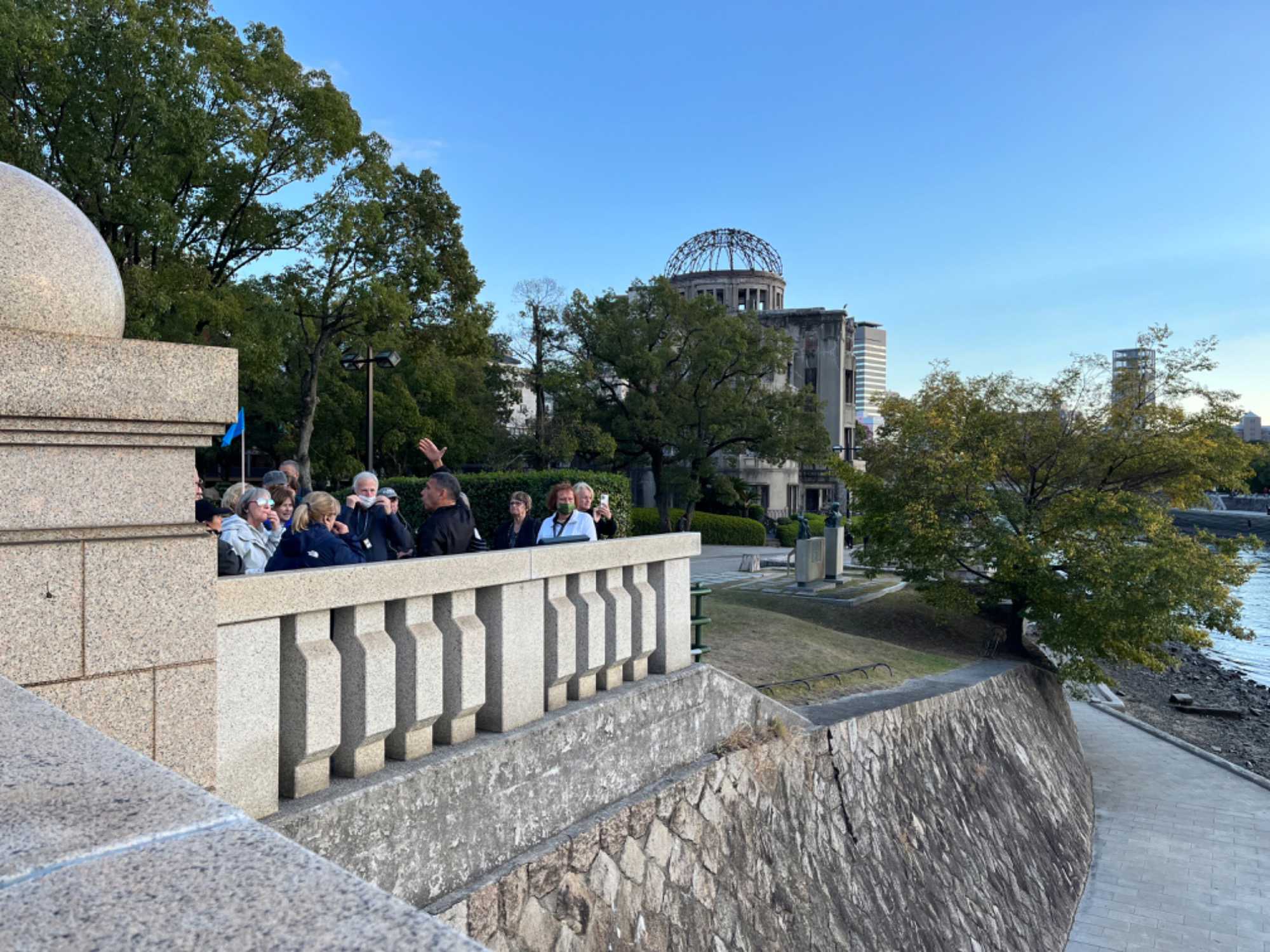 Une promenade dans le parc de la Paix, où l’on retrouve le monument de la Paix dédié aux enfants, la Flamme de la Paix, le Cénotaphe, la Cloche de la Paix et le tristement célèbre Dôme de la bombe « A », un des seuls bâtiments à être resté debout près du lieu où explosa la bombe. Le dôme de la bombe atomique, est ce qui reste de l’ancien hall préfectoral de promotion industrielle. Le bâtiment avait servi de lieu pour promouvoir les industries d’Hiroshima. Lorsque la bombe a explosé, c’était l’un des rares bâtiments à rester très partiellement debout. Inscrit au patrimoine mondial de l’UNESCO, le dôme de la bombe atomique est un lien tangible avec le passé unique d’Hiroshima. Il a été préservé tel qu’il était juste après le bombardement grâce à de nombreux efforts, dont ceux des habitants d’Hiroshima, en espérant une paix durable et l’élimination finale de toutes les armes nucléaires de la planète. C’est un symbole dur et puissant de la force la plus destructrice que l’homme n’ait jamais créée à cet époque, qui incarne en même temps l’espoir de la paix. Toutes les images vues dans le musée resteront à jamais gravées dans notre mémoire en ne laissant absolument personne indifférent. La visite du musée de la paix permet de constater les graves conséquences de la bombe sur cette ville et ses habitants. Ceci a vraiment projeté tous les voyageurs dans une réflexion profonde face à cette terrible tragédie humaine.