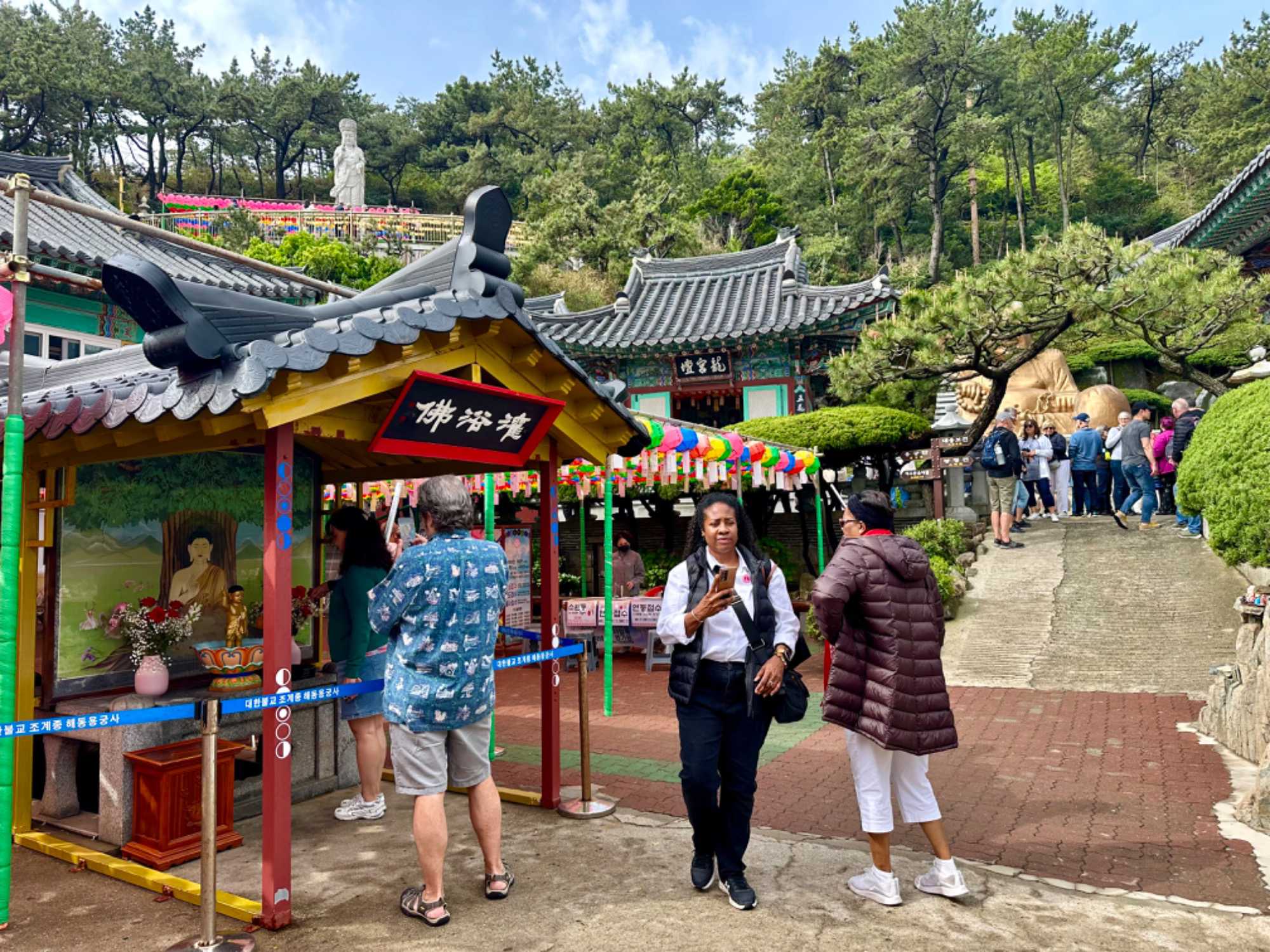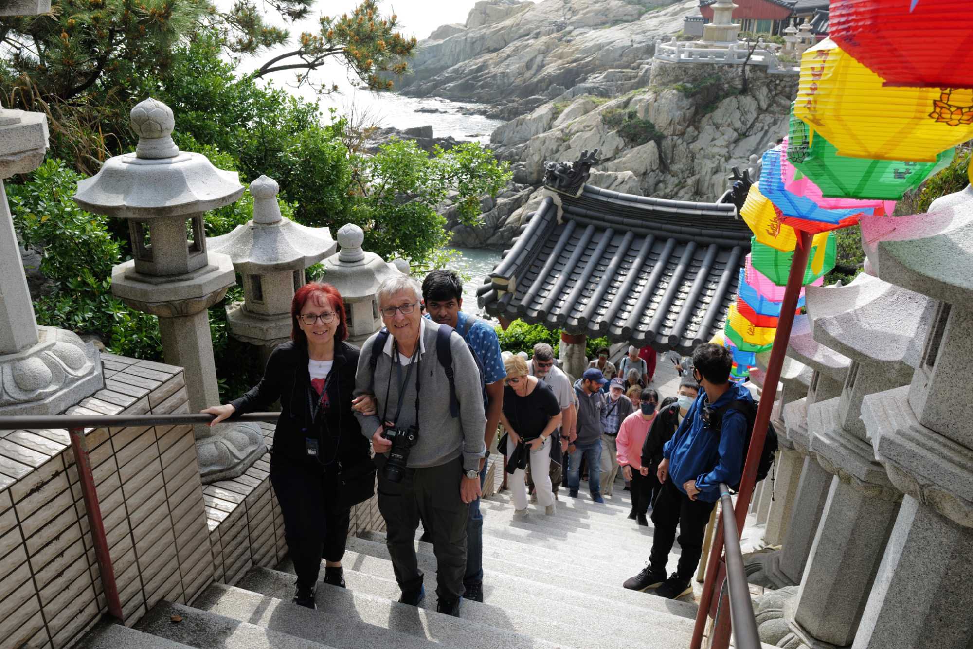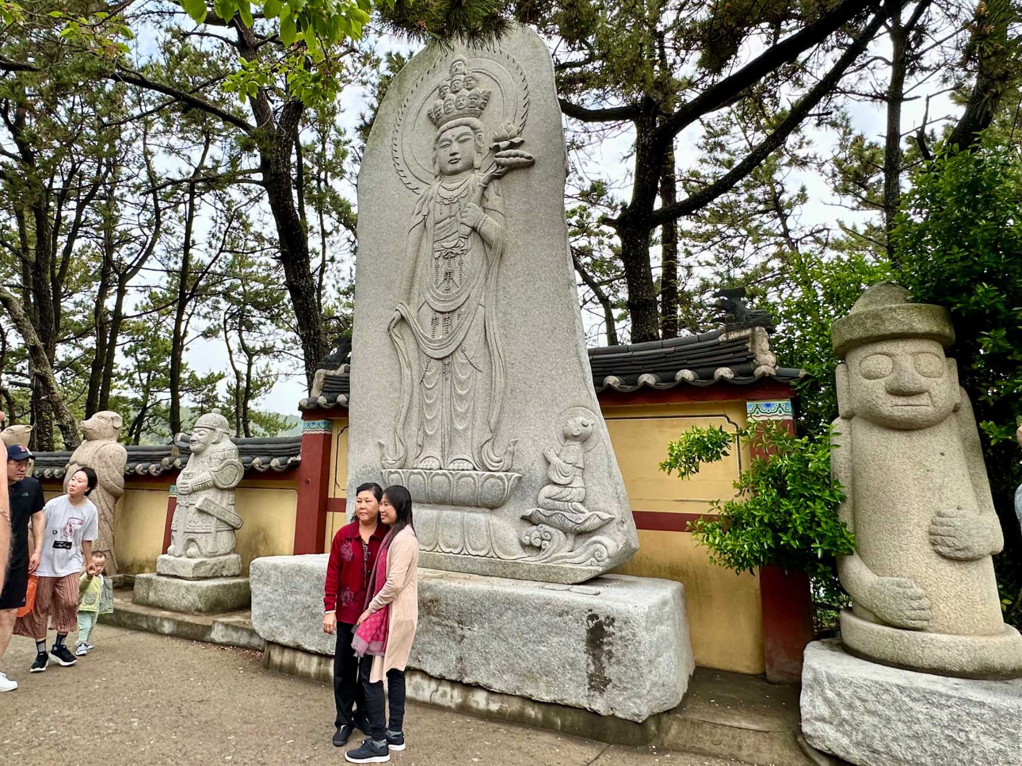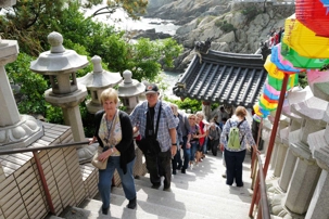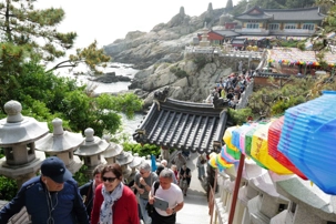 Nous débutons nos visites par le Temple Haedong Yonggungsa. Construit à flanc de falaise dans les rochers sur la côte nord-est de Busan, l'endroit ici est tout aussi magique et original que Beomeosa. La vue dégagée sur la mer depuis le temple qui laisse échapper d’émouvants chants bouddhistes vaut réellement le déplacement. Cette superbe attraction offre aux visiteurs la rareté d'un temple sur le littoral, la plupart des temples en Corée étant situés dans les montagnes. Il est vraiment très joli et nous en profitons pour faire de nombreuses photos. Nous nous amusons aussi avec notre horoscope chinois après avoir vu les statues représentant cet horoscope très suivi par les asiatiques.