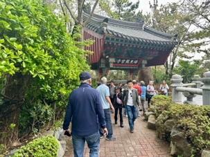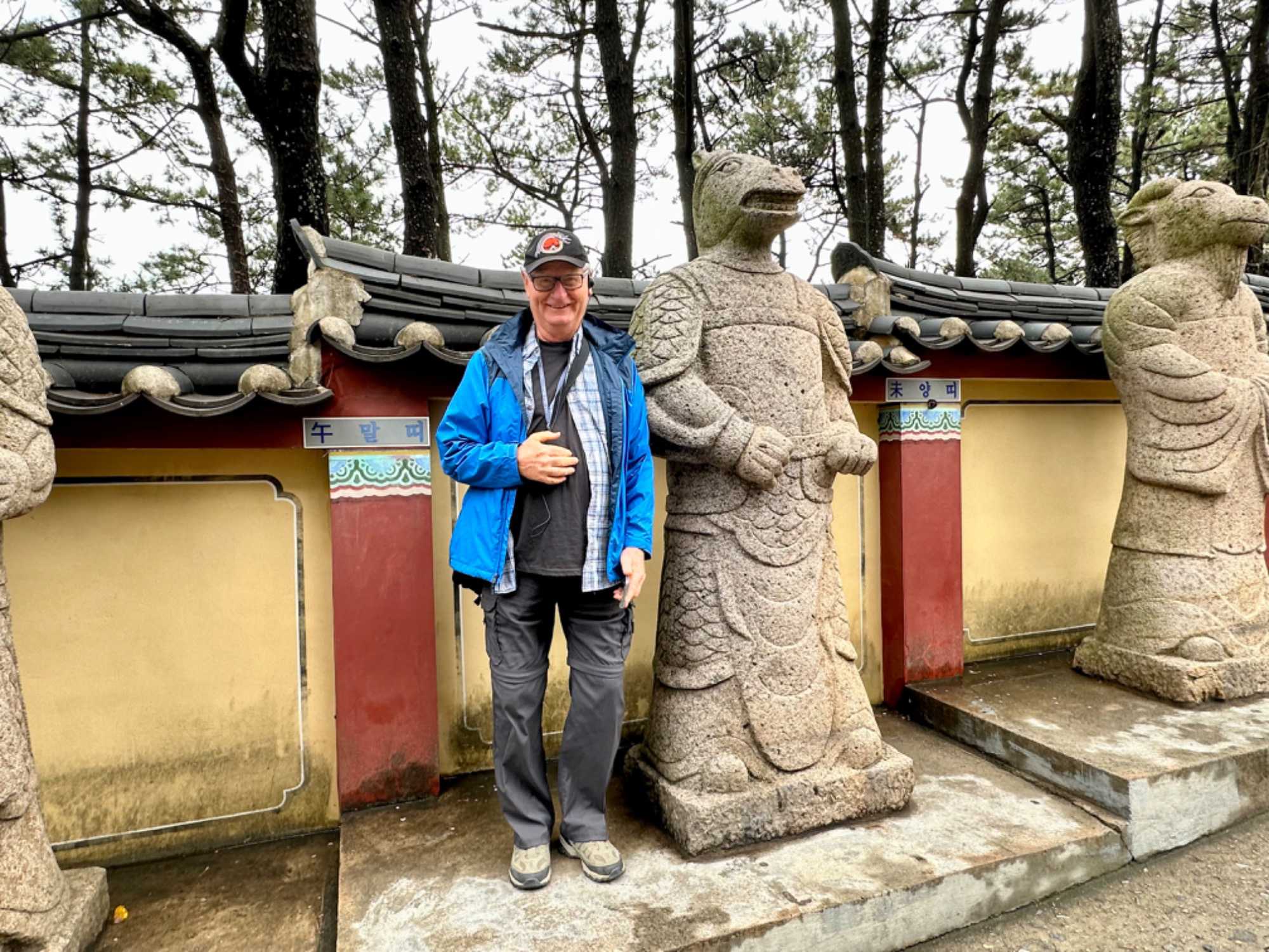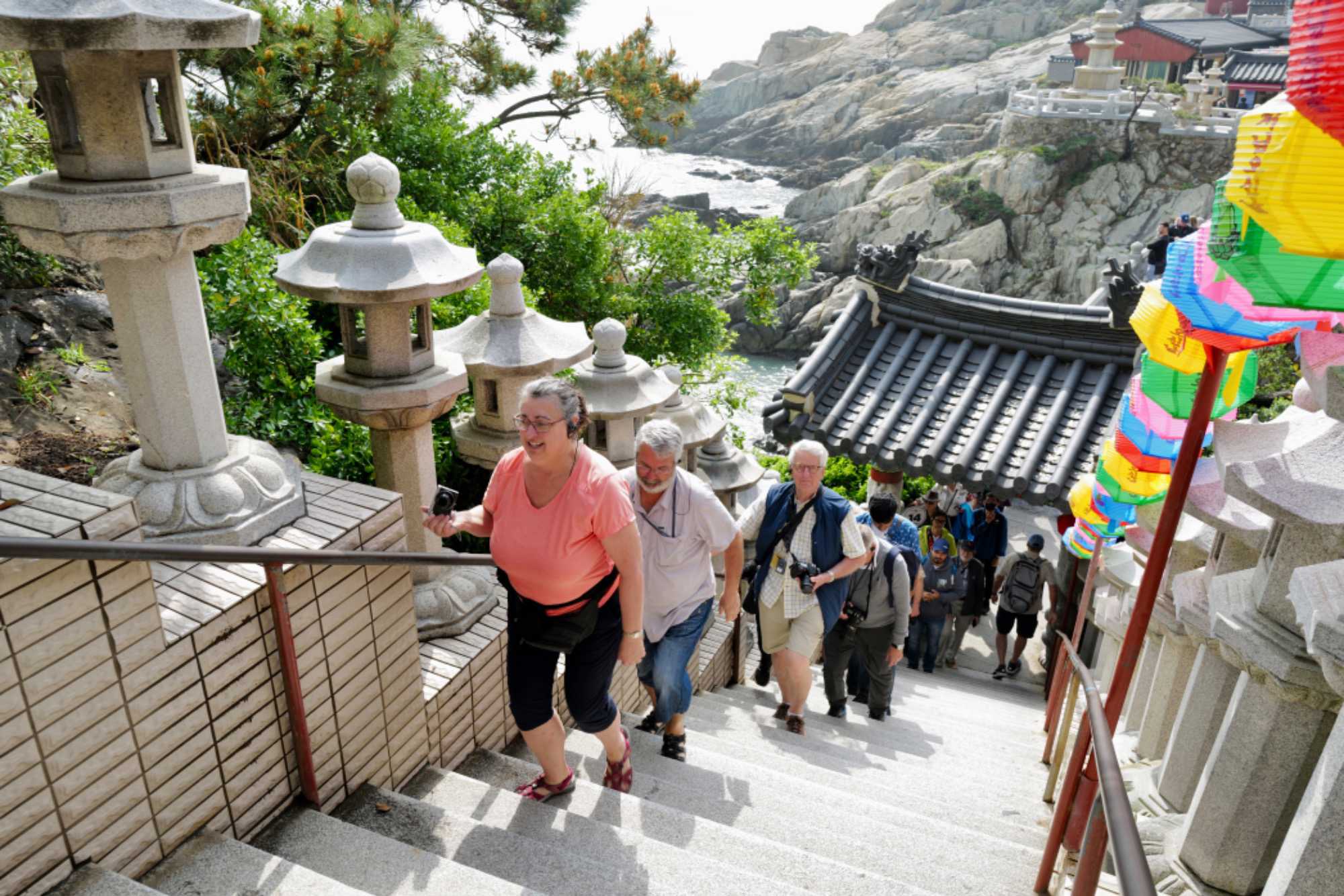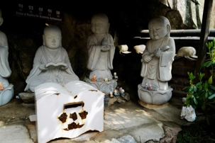 Nous débutons nos visites par le Temple Haedong Yonggungsa. Construit à flanc de falaise dans les rochers sur la côte nord-est de Busan, l'endroit ici est tout aussi magique et original que Beomeosa. La vue dégagée sur la mer depuis le temple qui laisse échapper d’émouvants chants bouddhistes vaut réellement le déplacement. Cette superbe attraction offre aux visiteurs la rareté d'un temple sur le littoral, la plupart des temples en Corée étant situés dans les montagnes. Il est vraiment très joli et nous en profitons pour faire de nombreuses photos. Nous nous amusons aussi avec notre horoscope chinois après avoir vu les statues représentant cet horoscope très suivi par les asiatiques.
