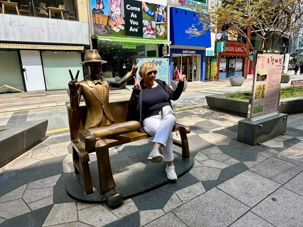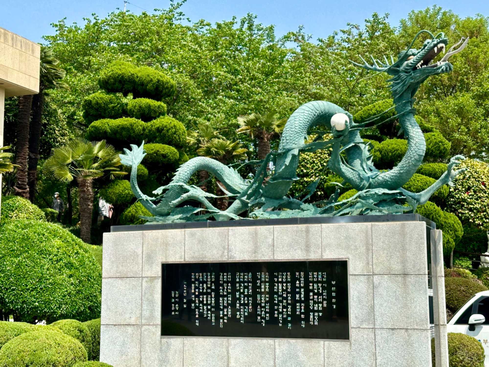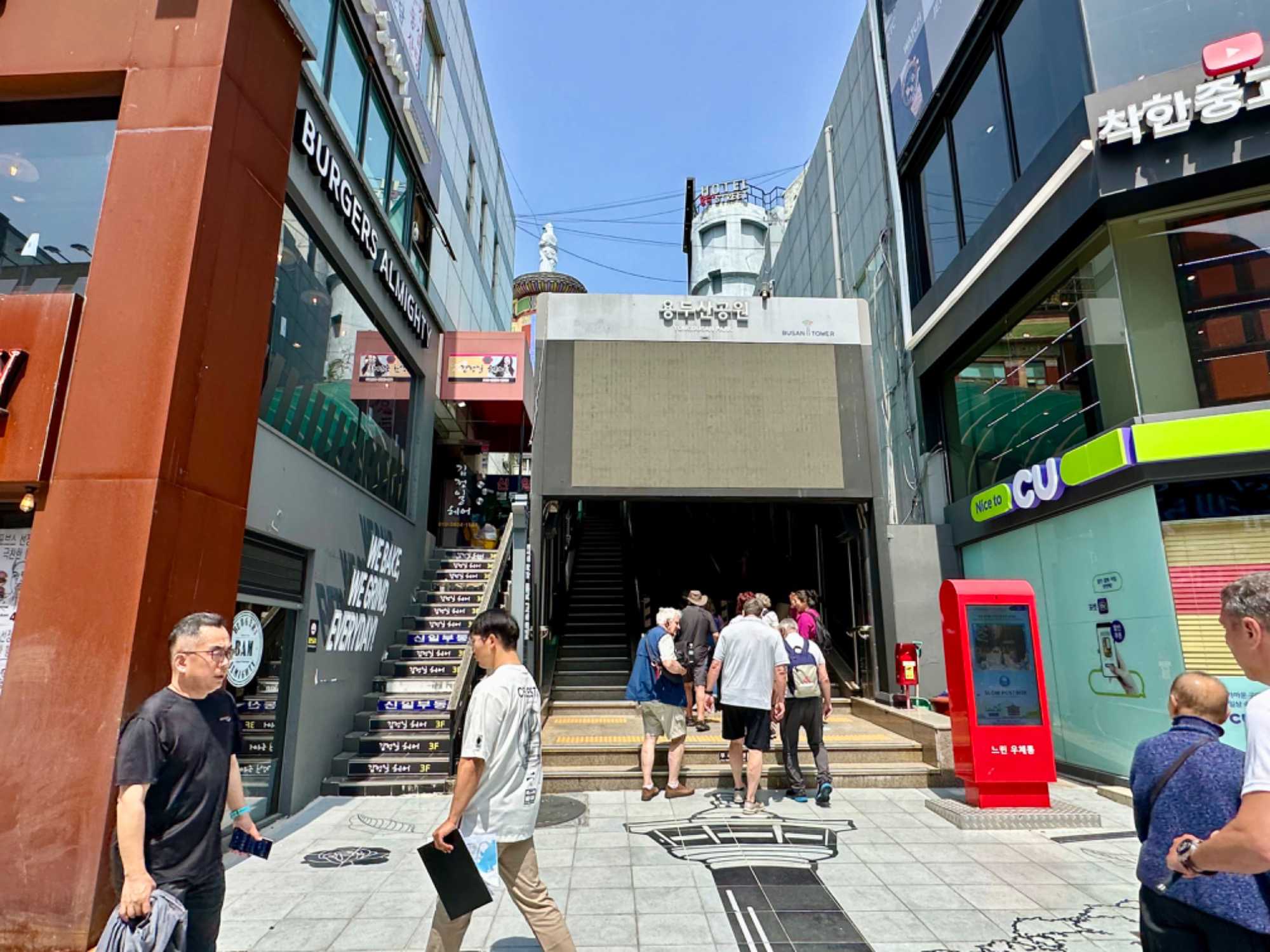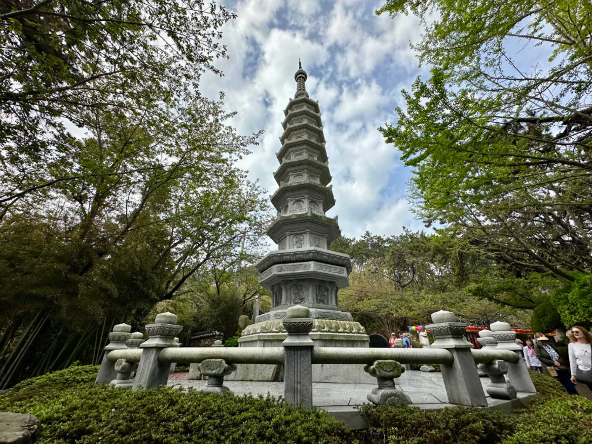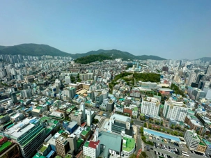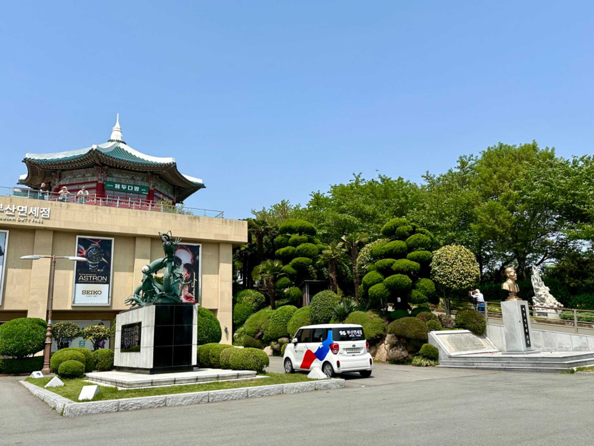 Puis nous nous dirigeons vers le Yongdusan Park. La montagne Yongdusan dans le centre de Busan est l'une des trois montagnes les plus célèbres. À l'origine, elle s'appelait Songhyeonsan Mountain, ce qui signifie une montagne avec une vue sur la mer à travers une dense forêt de pins. Plus tard, le nom a été changé en Montagne Yongdusan, car le sommet de la montagne avait la forme d'une tête de dragon, protégeant la région contre les envahisseurs étrangers. Nous y retrouverons la tour de Busan, la Diamond Tower une tour de 120 mètres de haut, une importante attraction. Elle est uniquement utilisée à des fins de divertissement et ne dispose d'aucun équipement de transmission. Aimée des habitants de Busan et des touristes, la tour offre une vue nocturne époustouflante et beaucoup de choses à voir. Il y a également des installations artistiques devant la tour, ce qui en fait un endroit idéal pour prendre des photos, et les visiteurs peuvent également déguster un café préparé par un robot nommé Dataro. Ce fût une belle activité qui nous a permis de voir la ville de ce point de vue en hauteur. La ville de Busan est très peuplée avec plus de 3 millions de personnes et la densité se voit bien du haut de la tour.