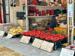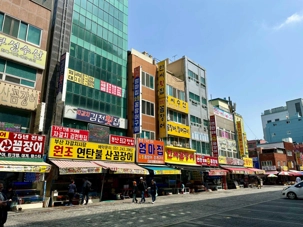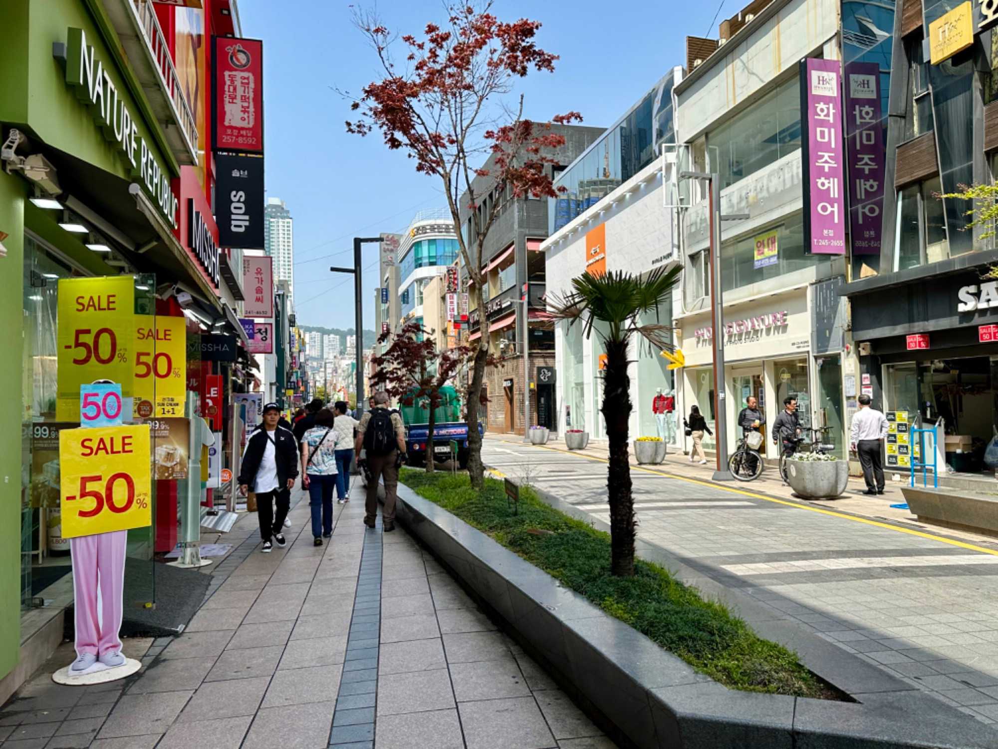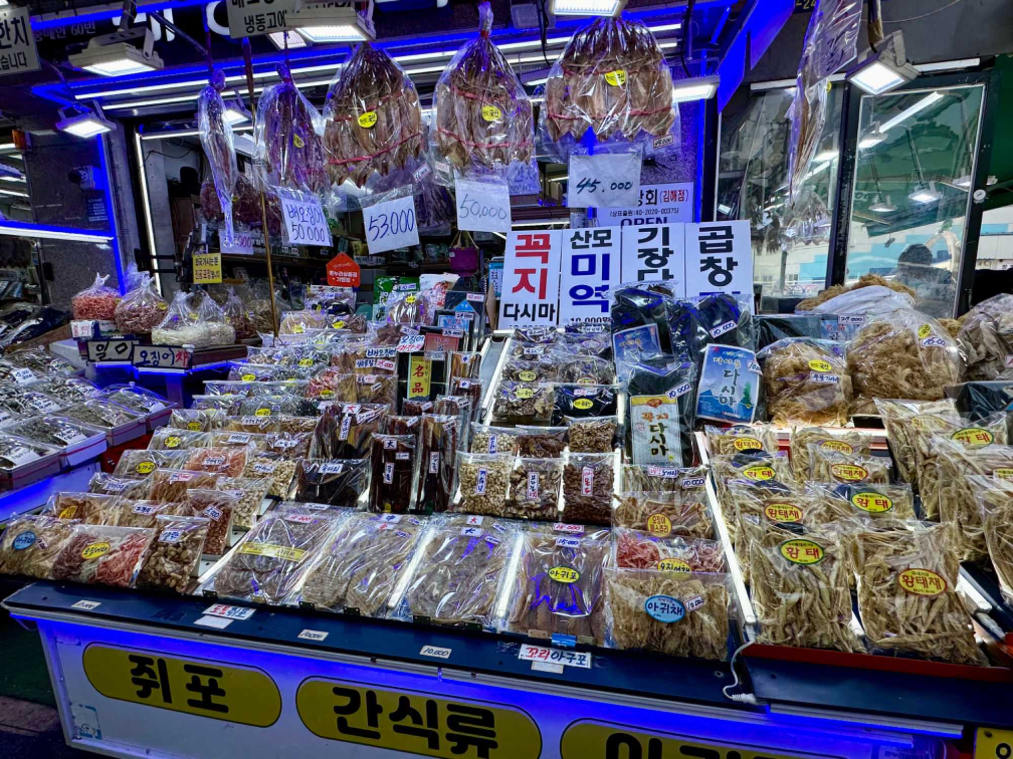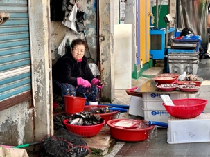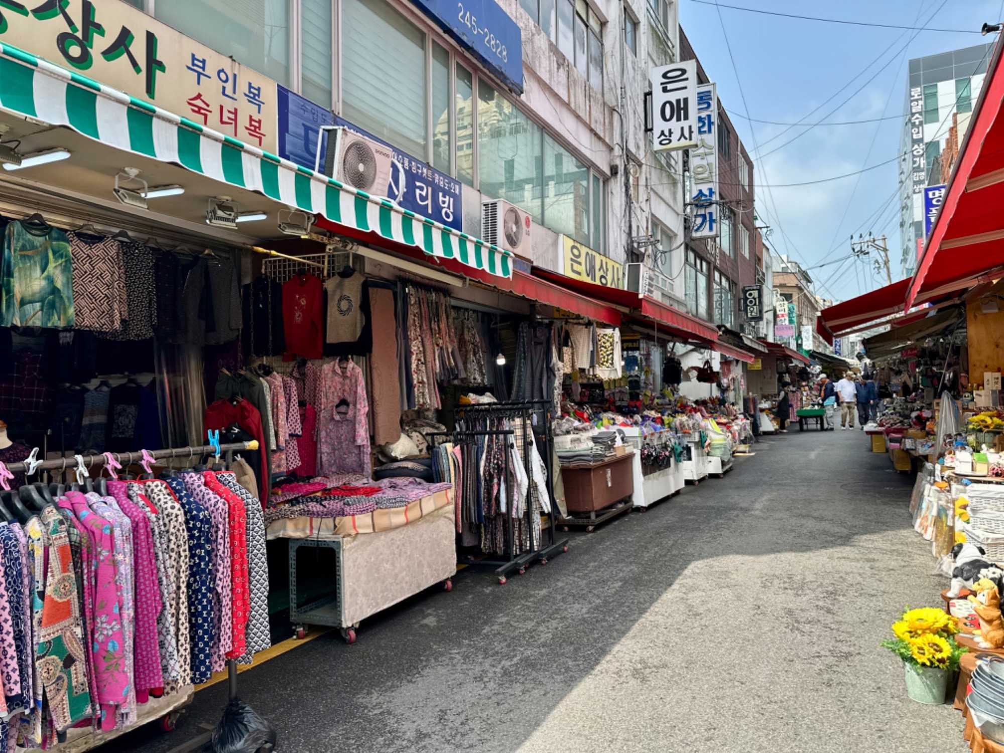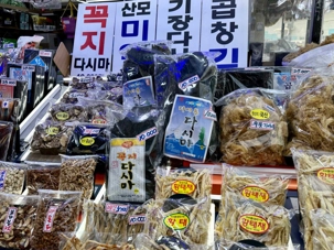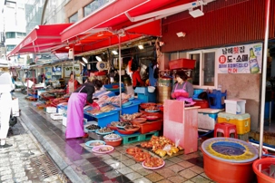 Nous poursuivons vers le Jagalchi Market, situé sur la route du bord de mer dans le quartier Jung gu de Busan, qui est le plus grand marché de fruits de mer de Corée, vendant à la fois du poisson vivant et du poisson séché. Ce marché représente Busan et est célèbre dans tout le pays. Les visiteurs peuvent manger du poisson cru frais directement au marché. La plupart des vendeurs de poisson sont des femmes, c'est pourquoi les vendeurs sont appelés Jagalchi Ajumma, "ajumma" signifiant femme d'âge moyen ou mariée en coréen. Aujourd'hui encore, les visiteurs peuvent voir des femmes vendre du maquereau, des ascidies (ascidies) et d'autres fruits de mer sur des caisses en bois le long de la route à l'extérieur du marché et le long du rivage. Nous n’avons pas de chance car aujourd’hui est un jour férié et nous ne voyons pas l’intérieur mais en revanche nous découvrons les vendeurs sur la rue avec leur marchandise à vendre. Cela est bien intéressant et nous observons leur façon de faire pour la vente de poisson et mollusques. Nous marchons jusqu’à notre restaurant tout en observant les différentes vitrines. Nous avons aussi ce matin marché sur la rue célèbre un peu comme celle de Hollywood boulevard avec la promenade de la renommés mais sous une plus petite envergure.
