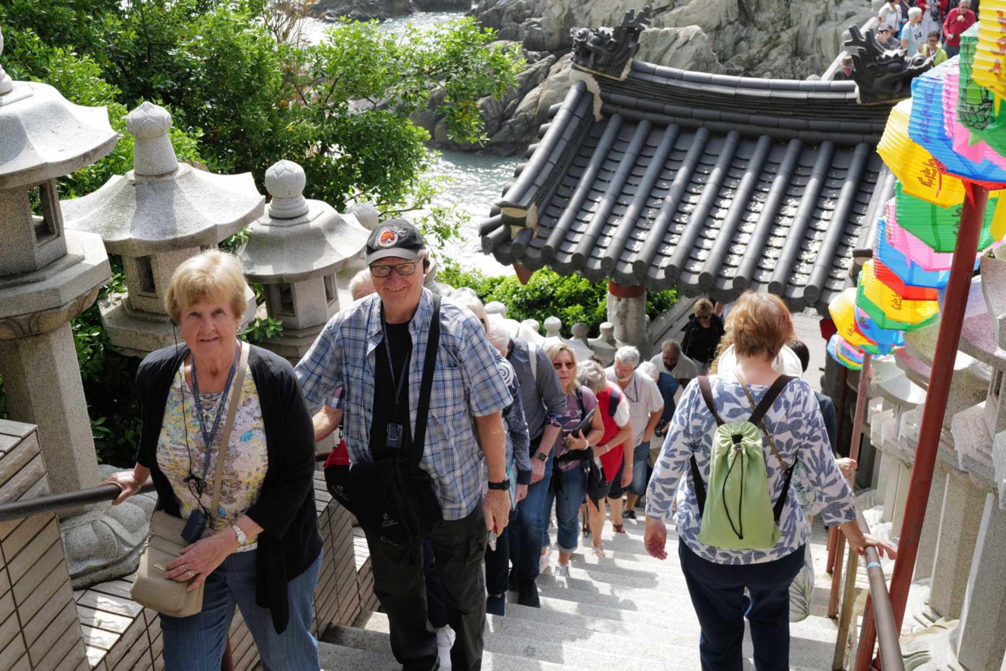 Rencontre avec notre guide au port de Busan. Nous débarquons pour une journée de visites pour la première fois dans ce pays pour la majorité du groupe. Nous rencontrons notre guide local francophone Lee qui est absolument charmante. Nous sommes encore une fois chanceux car on nous annonçait un peu de pluie mais cela ne sera pas pour aujourd’hui encore une fois car le soleil est au rendez-vous pour notre grand bonheur. Notre arrivée au port est spectaculaire avec les ponts et les viaducs très élevés et qui sont si proche du port. Nous quittons pour notre premiere découverte avec plaisir. L’entrée au pays fût bien rapide et sans aucun problème.