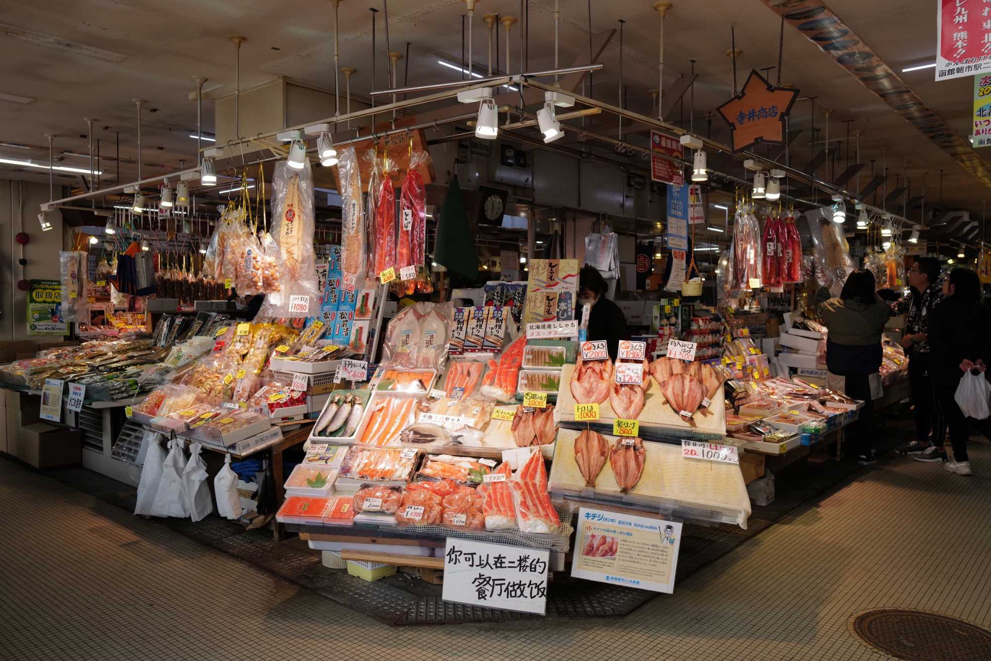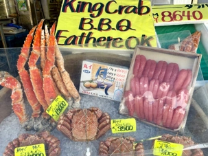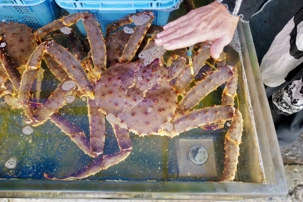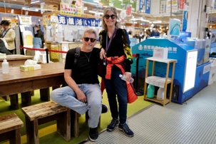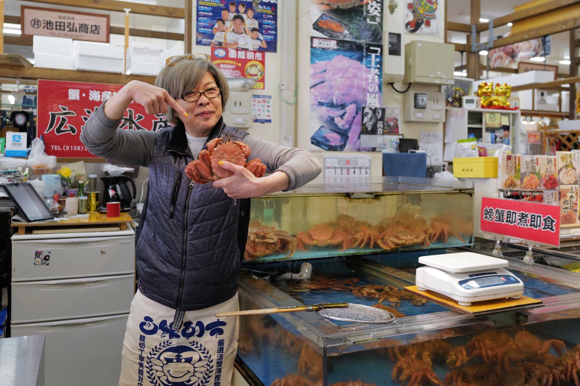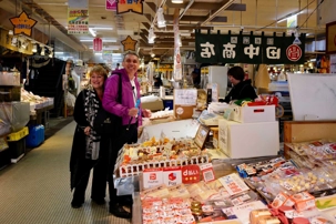 Il fait encore un temps splendide et Jean est surpris de voir que le navire est directement au marché d’Hakodate qui est l'un des grands ports de pêche de Hokkaido. C’est super, nous quittons le navire et nous allons directement marcher dans le marché de poissons de la ville. Le marché du matin (Asa-ichi) ouvre à six heures du matin et est divisé en dizaines de vendeurs. Les environs du marché sont remplis de petites boutiques et restaurants avec des étalages de fruits de mer. Contrairement à l'atmosphère feutrée qui règne à l'intérieur, ici, les colporteurs crient les vertus de leurs marchandises à tous ceux qui passent sous le soleil du matin. Certains magasins ont des panneaux en japonais et en anglais disant : "Vous pouvez manger ici!" Pratiquement tous ont une ou plusieurs tables à l'arrière où l'on peut déguster un donburi de fruits de mer (un bol de riz blanc recouvert d'une ou plusieurs sortes de fruits de mer). Nous découvrons toute sorte de choses intéressantes. Les prix nous surprennent aussi mais pour avoir la qualité, cela se paye. Pour vous orienter, nous avons environ 100 yens pour 1$ canadien. Et si vous voyez 1500 yens pour des fraises bien c’est 15$ et oui les fraises sont emballées individuellement et elles sont chères, de plus nous sommes en saison 😊, un cantaloup est souvent vendu à 40$. Je ne me trompe pas en anglais c’est cantaloupe et en francais cantaloup, un nom masculin en français et oui la langue française. Vous verrez des photos de nos oursins qui sont pour les habitants un régal et qui coûte cher. Nous en ferons l’expérience car j’ai acheté un pot pour que mes voyageurs découvrent ce goût particulier. Les crabes sont partout et nous avons photographié le plus gros qui s’y trouvait, il pesait 5 kg et coûtait 1100$ canadien. Ce crabe avait environ 22 ans. Les poissonniers ont leur petit endroit à l’arrière pour le cuire directement et vous le servir. C’est très amusant de se promener et de découvrir toute cette vie dans ces marchés typiques.