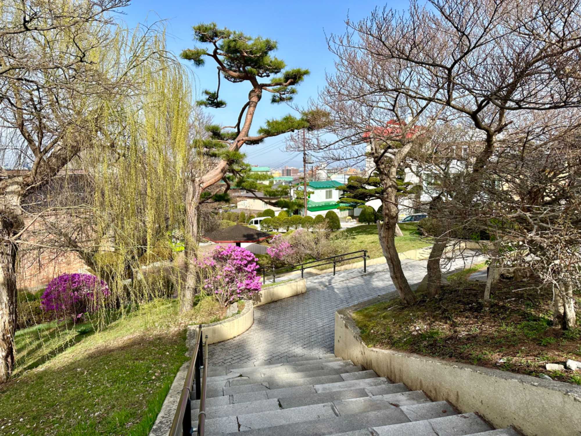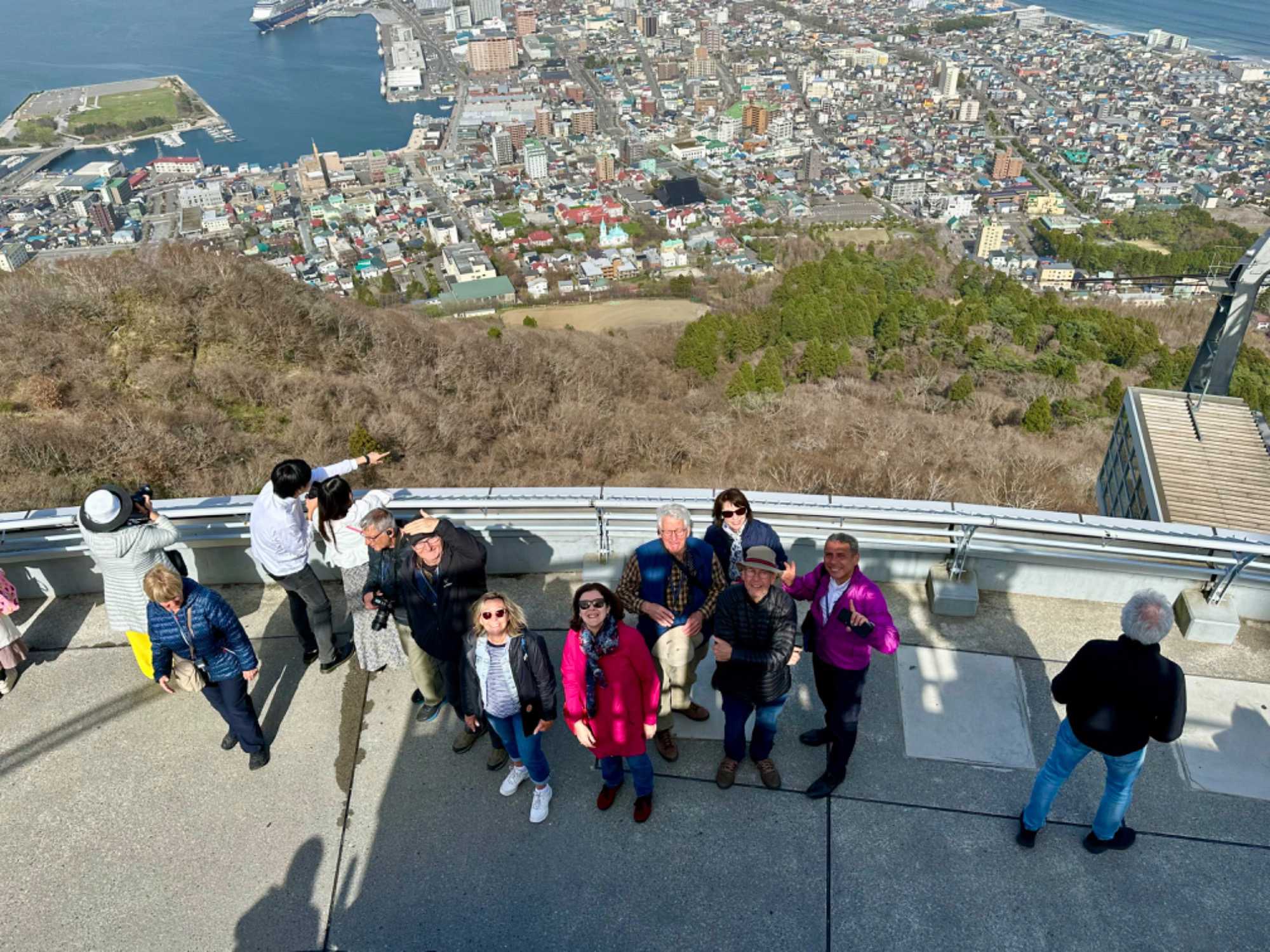 Du haut de la tour, nous réalisons le travail fait en 1914, où les jardiniers ont planté des milliers de cerisiers dans l’enceinte de la forteresse. Il reste aujourd’hui 1600 de ces arbres, qui fleurissent chaque printemps. On ne peut pas tout avoir car ici nous sommes encore un peu tôt cette année et ils ne sont pas encore en fleurs. Ce spectacle naturel étonnant transforme littéralement les lieux pour un ravissement des yeux et des centaines de japonais et de touristes s'y pressent chaque année pour le hanami. Dans le parc, la tour de Goryôkaku permet d’observer de haut la belle forme en étoile ainsi que toute la baie d’Hakodate jusqu’au détroit de Tsugaru.