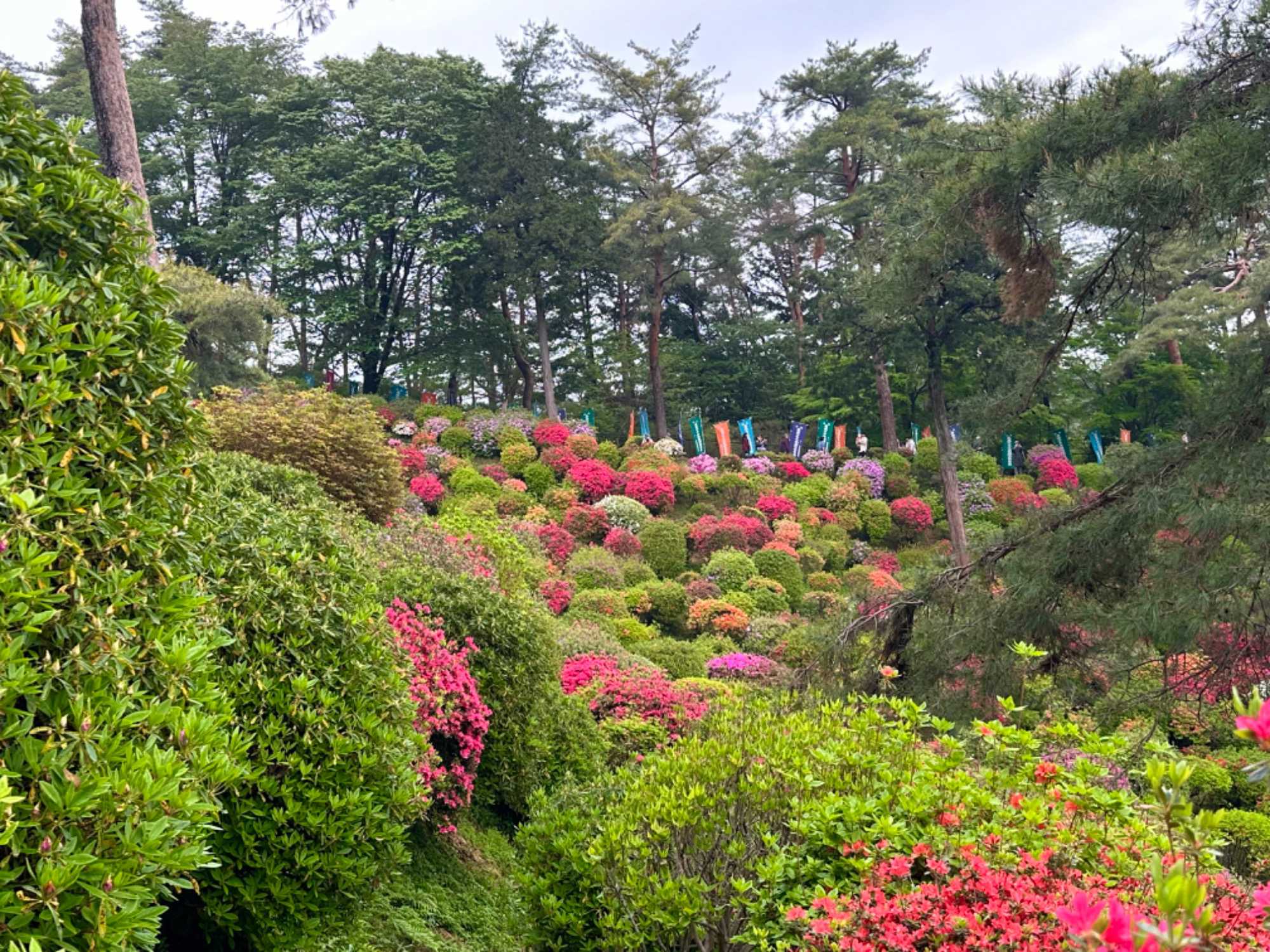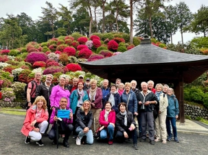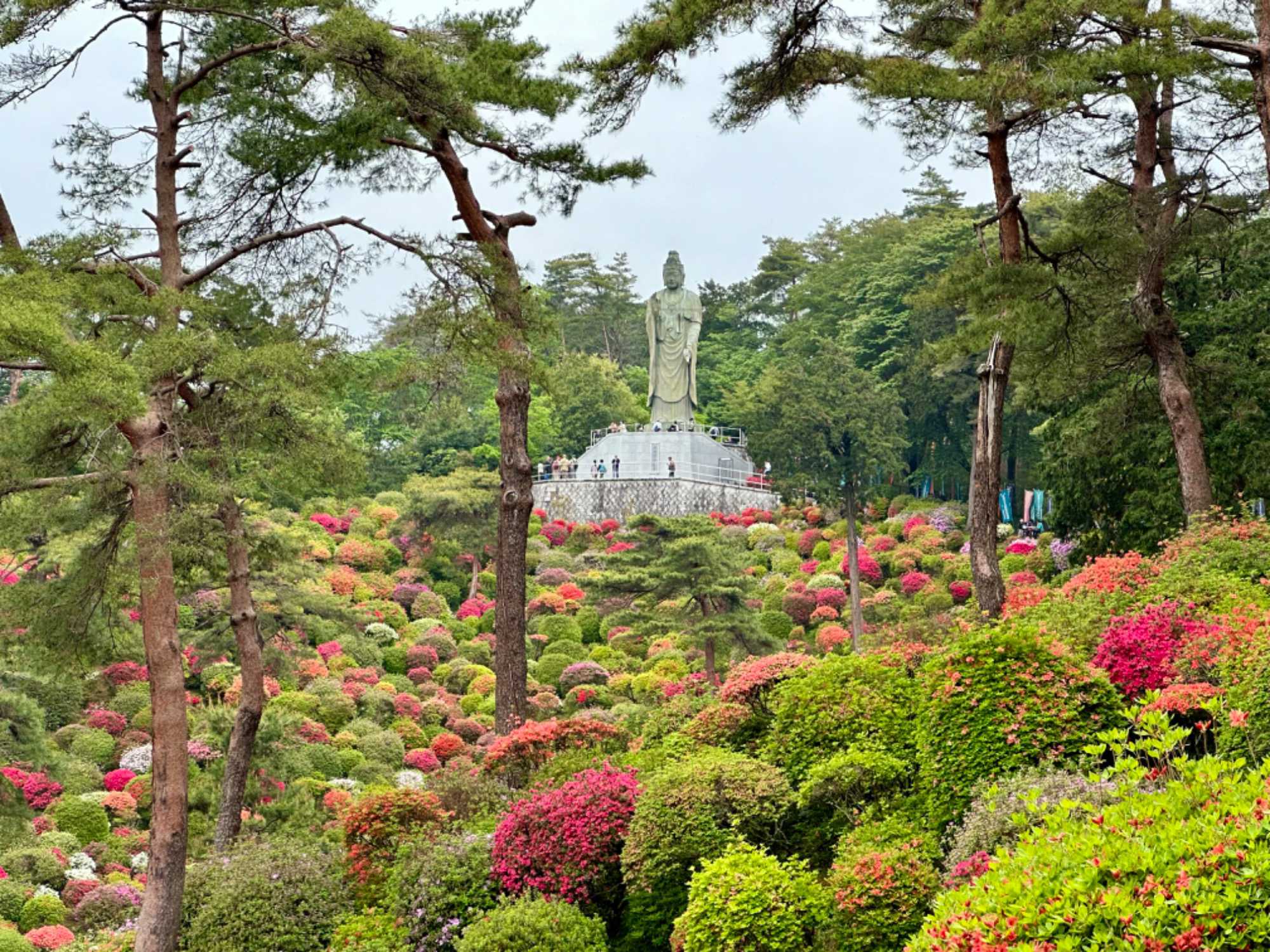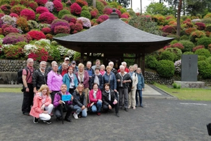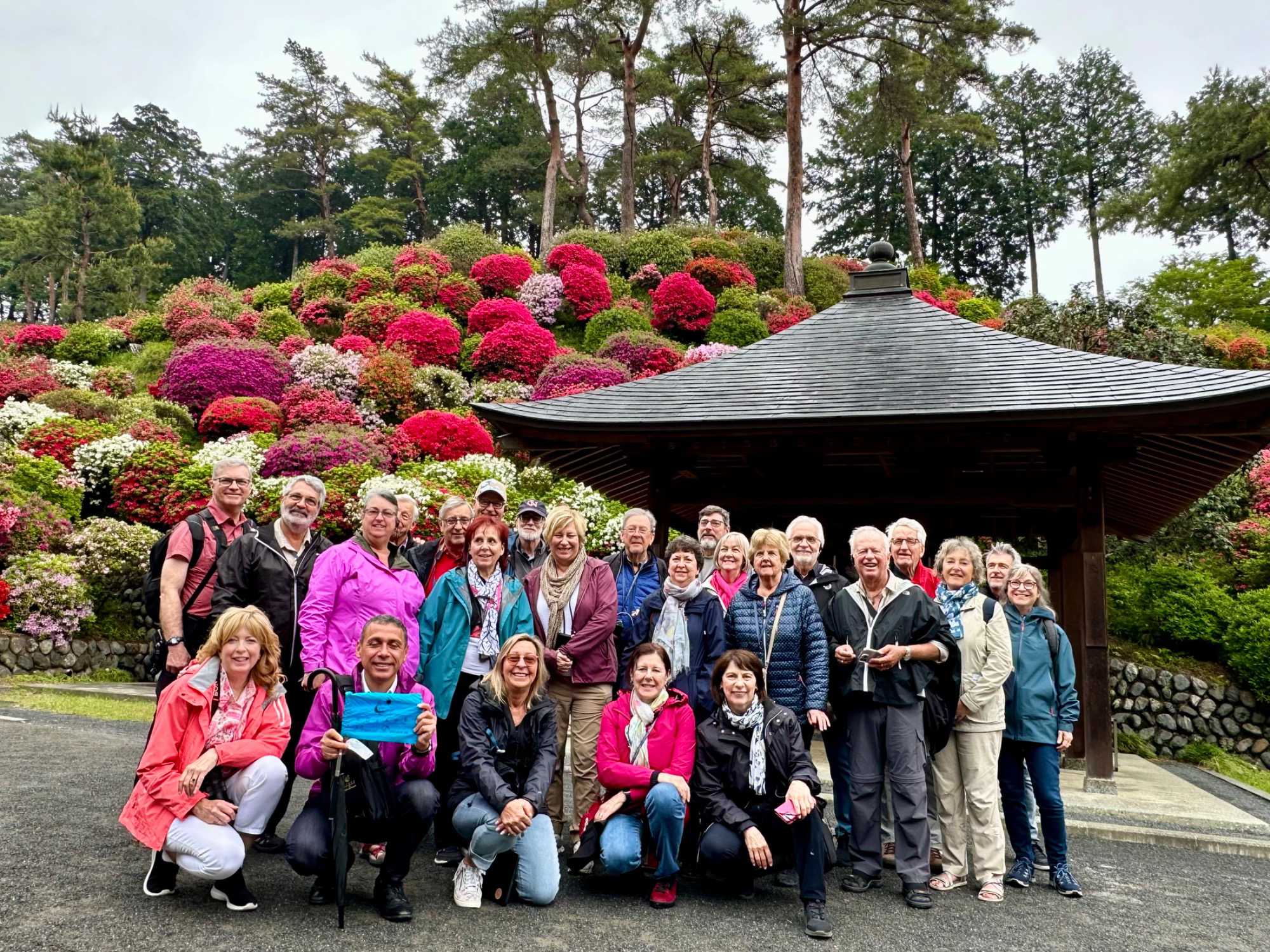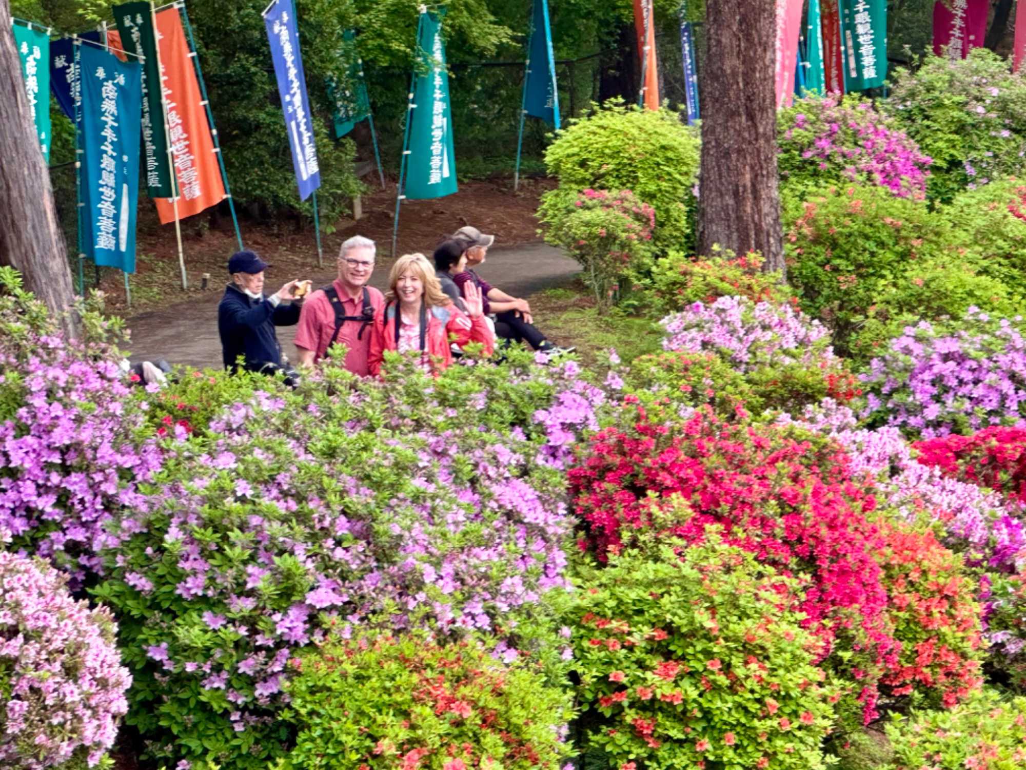 Petit-déjeuner à l’hôtel et départ en autobus pour la visite du temple Shiofune Kannon-ji à Ōme. La température est pour une première fois nuageuse mais sans pluie. Nous sommes tous prêts pour notre deuxième jardin qui se trouve à environ 1 heure de route de Tokyo. Nous partons en autobus aujourd’hui et nous sommes tous fébriles de découvrir un autre beau jardin au Japon. Nous arrivons à Ome et nous sommes les seuls touristes étrangers qui viennent aujourd’hui visiter ce site magnifique. Shiofune Kannon-ji est un vaste temple bouddhiste situé dans la ville d'Ome, à l'ouest de Tokyo. Le site vieux de 1 300 ans est réputé pour ses myriades d’azalées multicolores (ou rhododendrons) qui fleurissent en masse de la mi-avril au début mai. Ce n’est donc pas un hasard si je tenais tant à amener mon groupe de voyageur à cette période de l’année. Nous en profitons pour prendre plusieurs photos, nous en avons plein la vue dans ces jardins du temple et ses 17 000 azalées. De nombreux sentiers descendants et ascendants traversent les buissons d'azalées et permettent de s'immerger totalement dans les lieux, et de faire le plein de parfums et de couleurs pour l'année. Les arbustes de rhododendrons sur les flancs de la vallée se parent de magnifiques couleurs vives, du rose au rouge en passant par le violet et le blanc. Le point culminant est Tsutsuji Matsuri, le festival des azalées qui a lieu le 3 mai de chaque année. Dès notre arrivée, nous sommes éblouis par tant de beauté. Les boules d’azalées sont gigantesques et couvre la colline qui au sommet nous présente la déesse Kannon. La statue de Kannon représente la déesse bouddhiste Guanyin, également connue sous le nom de Kannon en japonais. Guanyin est une figure de compassion et de compassion universelle dans le bouddhisme, vénérée pour sa capacité à percevoir et soulager les souffrances du monde. Elle est immense et elle surplombe tout le cratère rempli de fleurs. Nous n’avons qu’une seule phrase en tête, « comme c’est beau » et on le répète à chaque détour en parcourant la colline. J’ai même prise des photos de Claude et de Jany au milieu des bosquets d’azalées et en blague on parle de « où est Charlie ». Nous ne nous lassons pas de contempler et d’admirer toutes ces couleurs d’azalées et en plus nous avons droit à de la belle musique classique reposante tout en marchant dans ces allées fleuries. Après cet avant-midi nous quittons à regret ce beau jardin pour notre prochain arrêt, celui de la ville de Kawagoe.