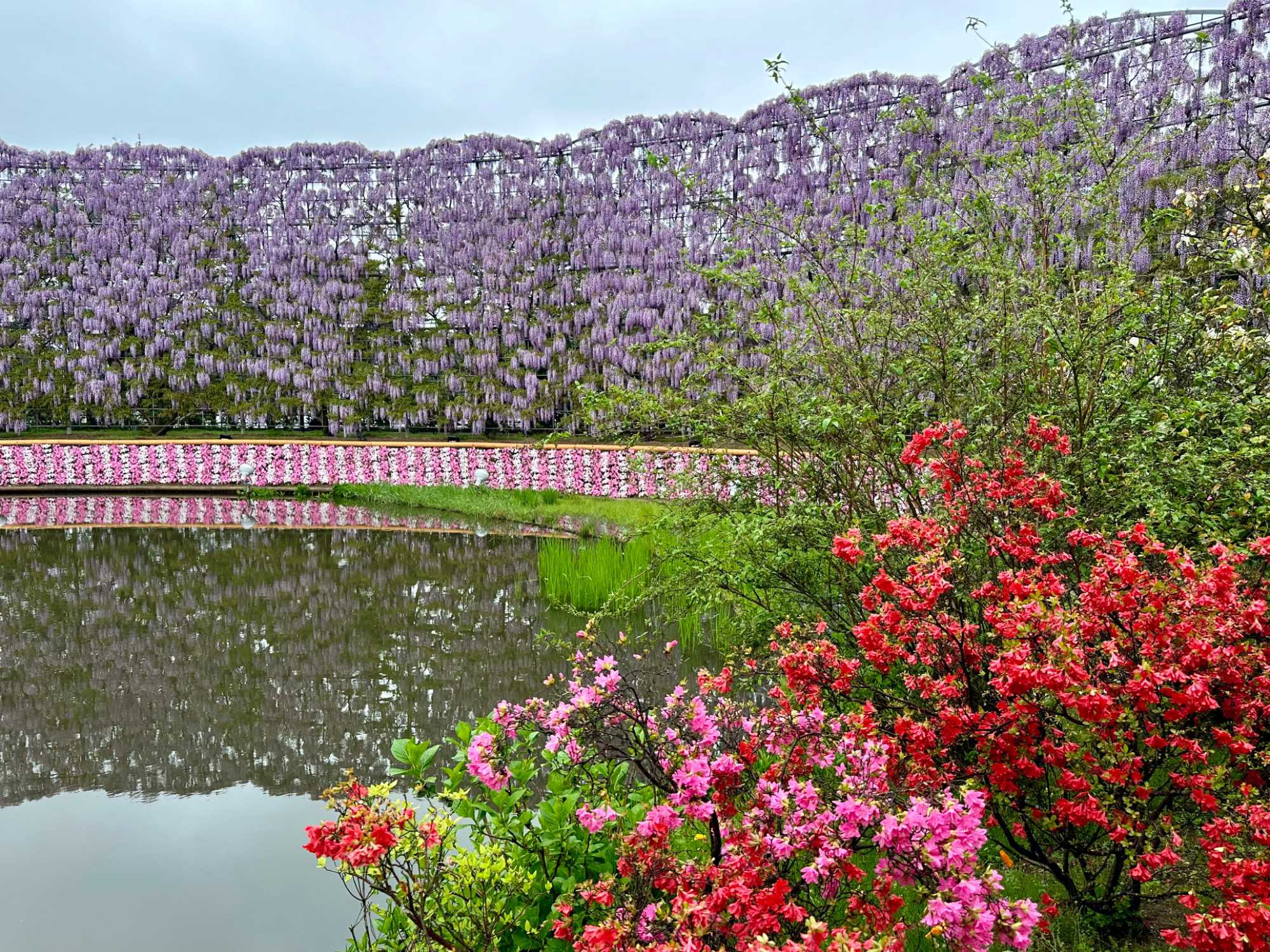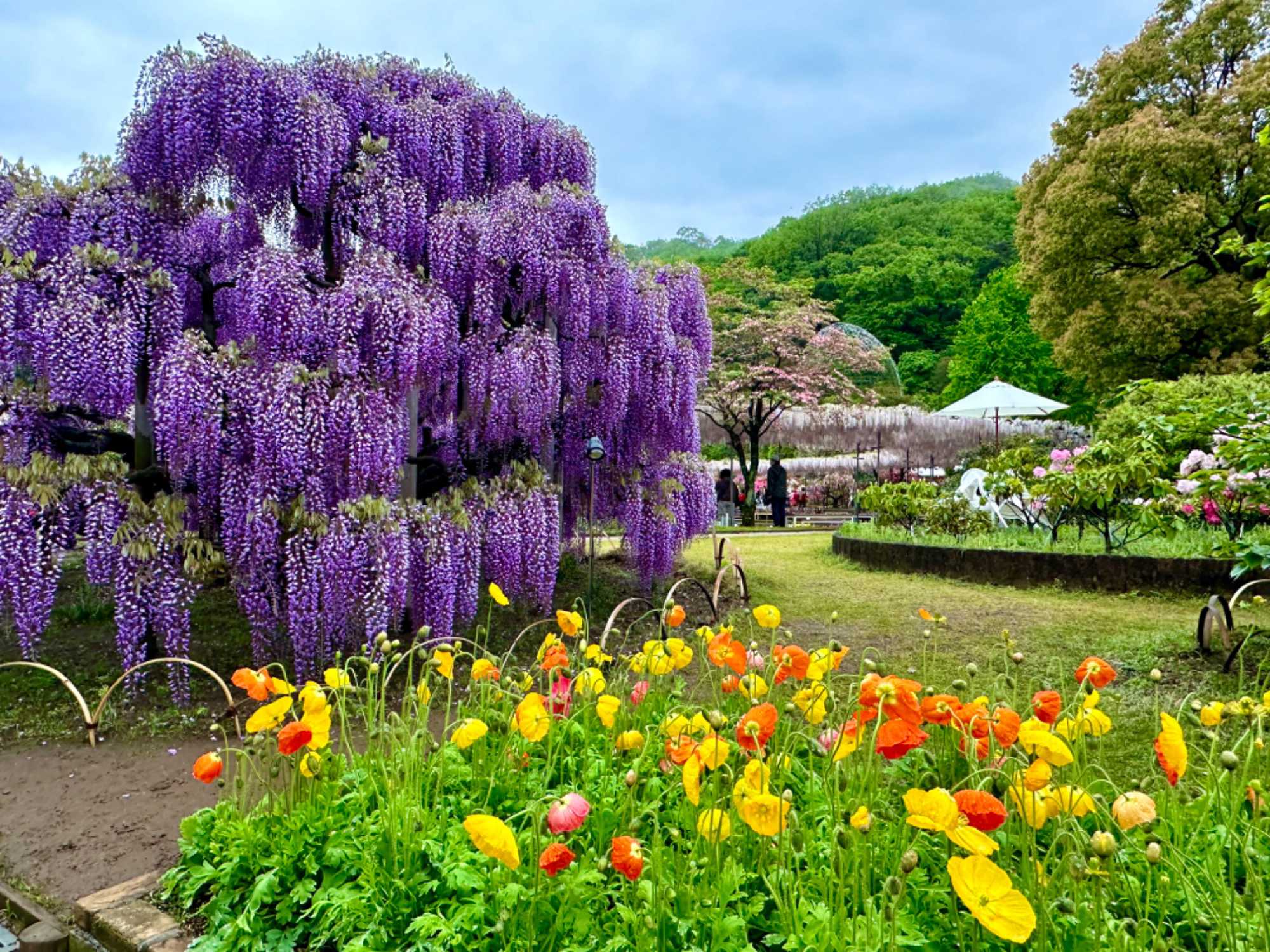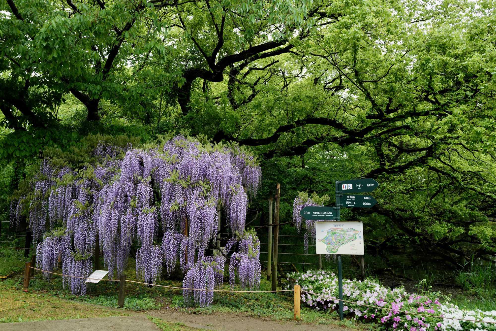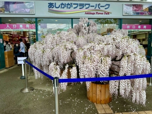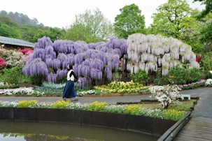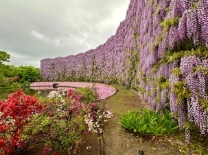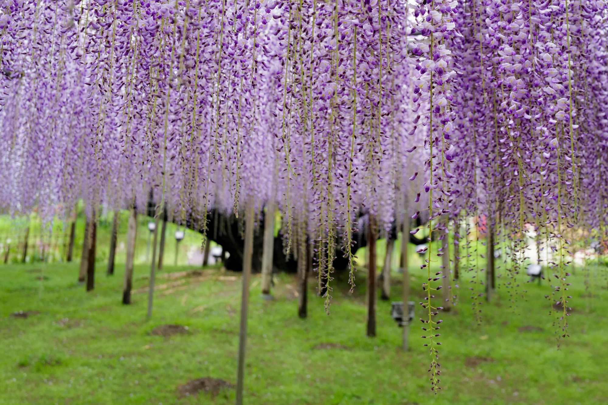 La glycine fait partie des fleurs les plus appréciées au Japon. On les appelle fuji en japonais, comme le mont Fuji, mais contrairement à la montagne, la fleur se prononce en accentuant la deuxième syllabe (et s'écrit avec un caractère différent). Le parc floral d'Ashikaga présente de nombreuses glycines bleues, blanches et roses, ainsi que des cytises jaunes (kingusari) qui ressemblent à des glycines de couleur jaune. Les glycines sont cultivées sur des cadres suspendus de sorte que les fleurs pendent au-dessus comme des stalactites de glycines. Ce jardin fleuri crée une impression complète de la magnificence de la nature avec une large gamme de plantes et d'arbres. Le point culminant du parc est les immenses treillis de glycines japonaises qui fleurissent de fin avril à mi-mai. Vous serez totalement stupéfait par quatre grandes vignes de glycines et un tunnel de 80 mètres de glycines blanches, désigné trésor naturel préfectoral. Le soir, les glycines illuminées apportent des scènes oniriques. Les glycines du parc floral d'Ashikaga sont généralement en pleine floraison début mai, une à deux semaines plus tard que les glycines de Tokyo. Le parc floral d'Ashikaga étant considéré comme l'un des meilleurs endroits pour observer les fleurs de glycine au Japon, le parc peut être très fréquenté même en semaine pendant la haute saison. Outre la glycine, vous trouverez de nombreuses autres fleurs, des restaurants et une boutique vendant des plantes et des produits locaux. Le parc est également devenu très populaire pendant la saison hivernale pour l'organisation d'un vaste spectacle d'illumination hivernale. Attirant chaque année de grandes foules, le parc ouvre ses portes tous les soirs de mi-octobre à mi-février pour permettre aux visiteurs de se promener à travers l'exposition élaborée. Le jardin accueille plus d'un million de touristes tout au long de l'année.