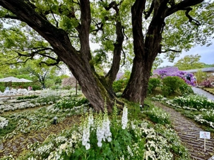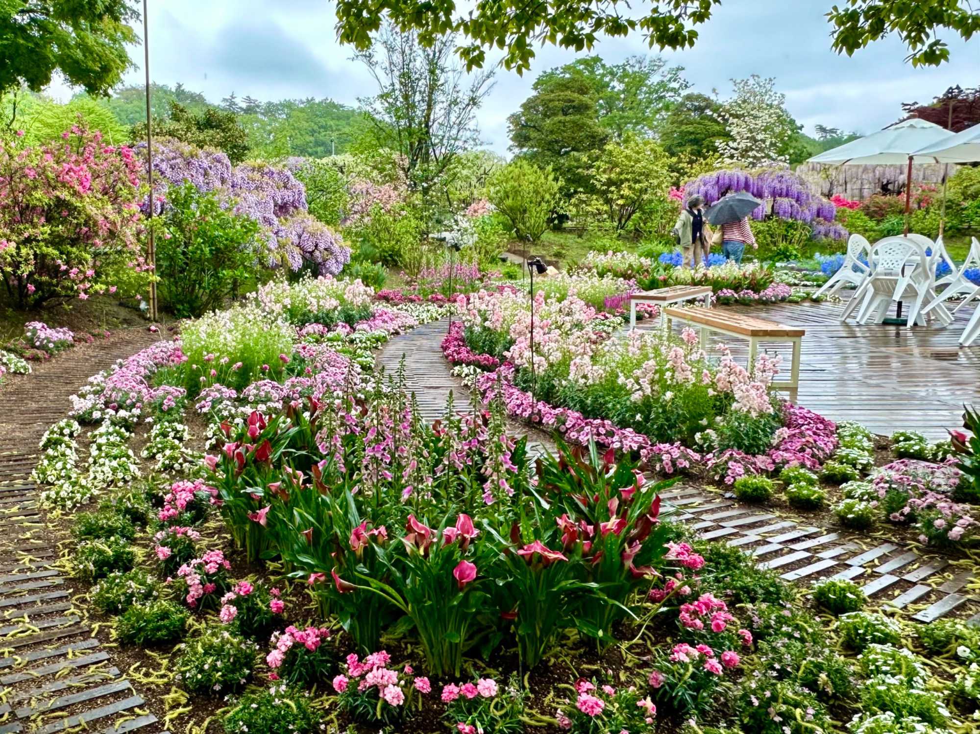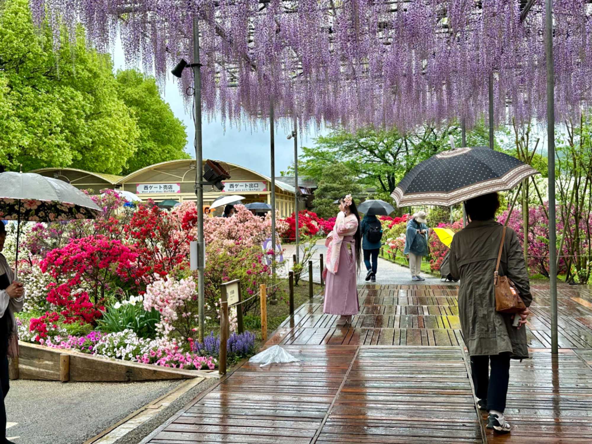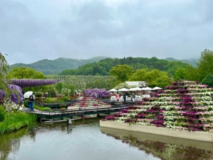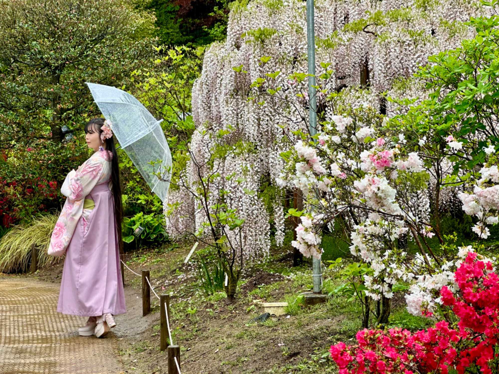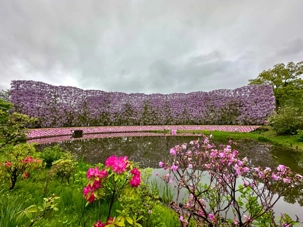 La glycine fait partie des fleurs les plus appréciées au Japon. On les appelle fuji en japonais, comme le mont Fuji, mais contrairement à la montagne, la fleur se prononce en accentuant la deuxième syllabe (et s'écrit avec un caractère différent). Le parc floral d'Ashikaga présente de nombreuses glycines bleues, blanches et roses, ainsi que des cytises jaunes (kingusari) qui ressemblent à des glycines de couleur jaune. Les glycines sont cultivées sur des cadres suspendus de sorte que les fleurs pendent au-dessus comme des stalactites de glycines. Ce jardin fleuri crée une impression complète de la magnificence de la nature avec une large gamme de plantes et d'arbres. Le point culminant du parc est les immenses treillis de glycines japonaises qui fleurissent de fin avril à mi-mai. Vous serez totalement stupéfait par quatre grandes vignes de glycines et un tunnel de 80 mètres de glycines blanches, désigné trésor naturel préfectoral. Le soir, les glycines illuminées apportent des scènes oniriques. Les glycines du parc floral d'Ashikaga sont généralement en pleine floraison début mai, une à deux semaines plus tard que les glycines de Tokyo. Le parc floral d'Ashikaga étant considéré comme l'un des meilleurs endroits pour observer les fleurs de glycine au Japon, le parc peut être très fréquenté même en semaine pendant la haute saison. Outre la glycine, vous trouverez de nombreuses autres fleurs, des restaurants et une boutique vendant des plantes et des produits locaux. Le parc est également devenu très populaire pendant la saison hivernale pour l'organisation d'un vaste spectacle d'illumination hivernale. Attirant chaque année de grandes foules, le parc ouvre ses portes tous les soirs de mi-octobre à mi-février pour permettre aux visiteurs de se promener à travers l'exposition élaborée. Le jardin accueille plus d'un million de touristes tout au long de l'année.