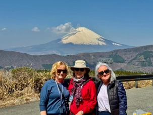 Cette visite nous a creusé l’appétit. Alors, nous sommes prêts pour manger notre premier dîner typiquement japonais, au Hakone Sekisho Tabi Monogatari. Mais avant, Jean notre guide, nous invite à faire une dégustation de saké. Nous avons le choix parmi une vingtaine de producteurs différents. Nous reprenons la route pour retourner au port de Shimizu rejoindre notre hôtel flottant ! Tout le groupe s’amuse et nous avons beaucoup de plaisir à partager du bon temps tous ensemble. Nous avons eu une journée exceptionnelle avec un soleil resplendissant durant toute la journée. Le Mont Fuji, la vedette de cette journée, nous a comblé. Avec un ciel dégagé en matinée, nous avons pu admirer la cime enneigée dans ses moindre détails. En après-midi, avec l’augmentation de la température et l’humidité, nous avons observé un début de nébulosité croissante et en soirée, c’est une couronne de nuages qui a fait son apparition autour de son sommet.